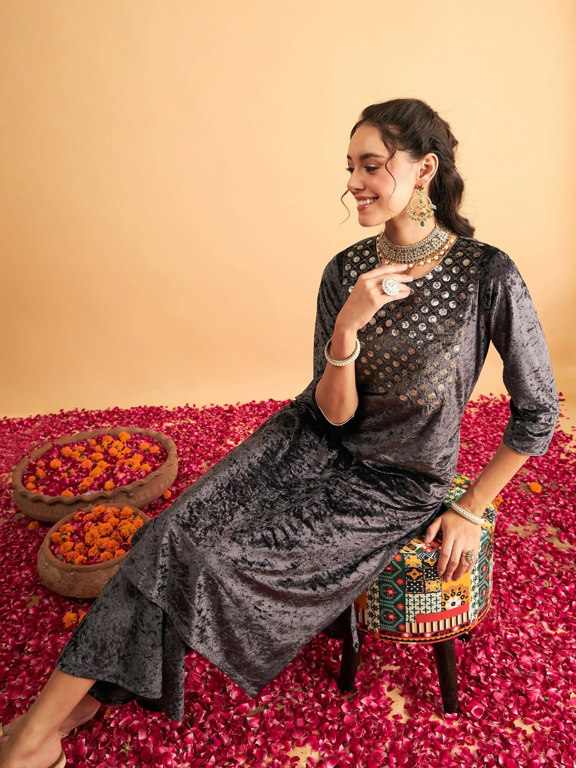 Grey Velvet Front Embroidered Straight Kurta, in Velvet fabric, Unlined, Calf Length, Straight Fit, Straight Hemline and features Embroidery Detail At Front | Model Info : Model is wearing size S | Model Chest - 33" | Waist - 27" | Height - 5'8" - Specifications :