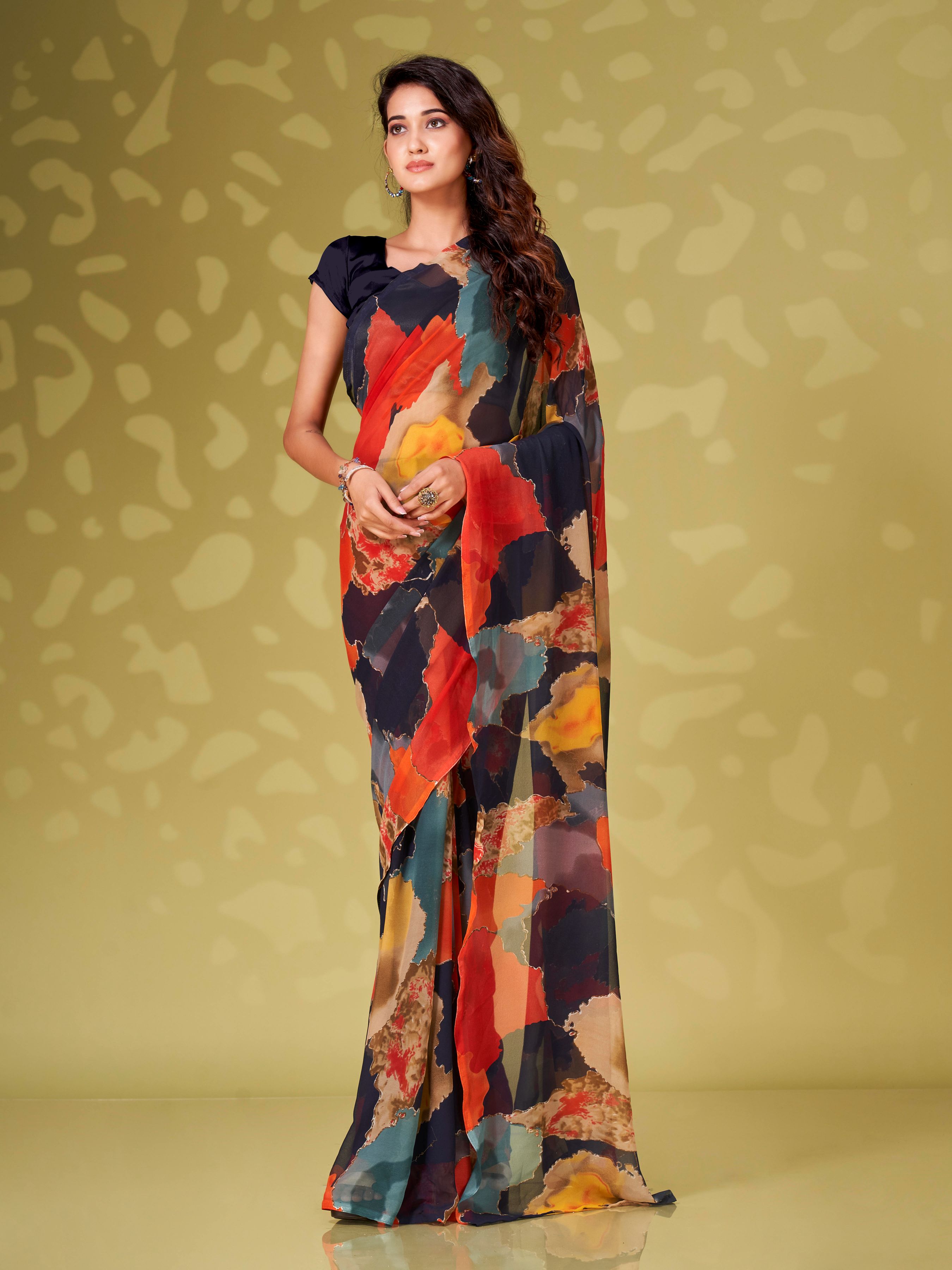 أضف لمسة عصرية إلى أناقتك بهذا الساري المصنوع من قماش جورجيت متعدد الألوان والذي يتميز بطبعات تجريدية. تصميمه الجاهز للارتداء يوفر أناقة خالية من المتاعب لأي مناسبة.