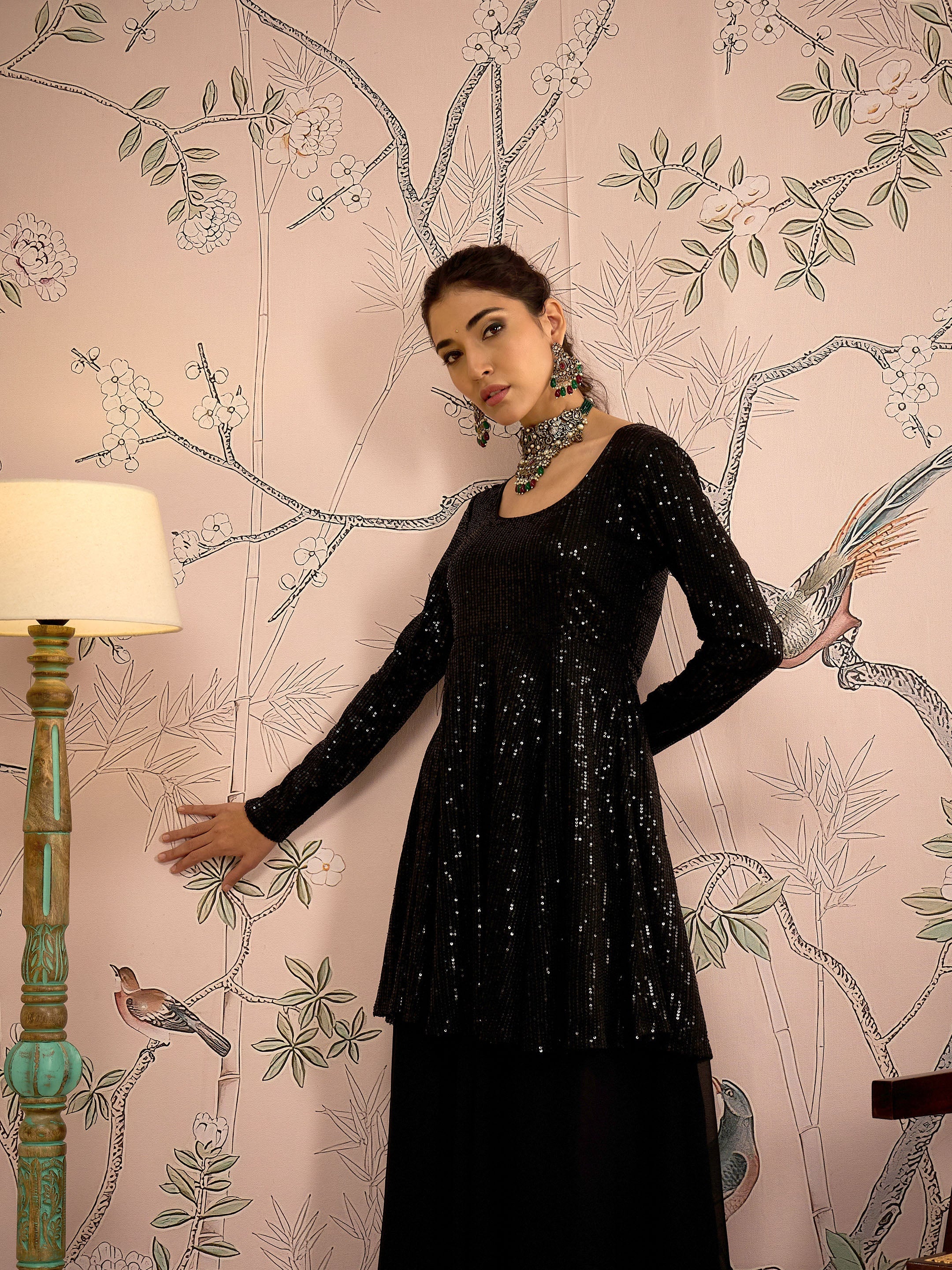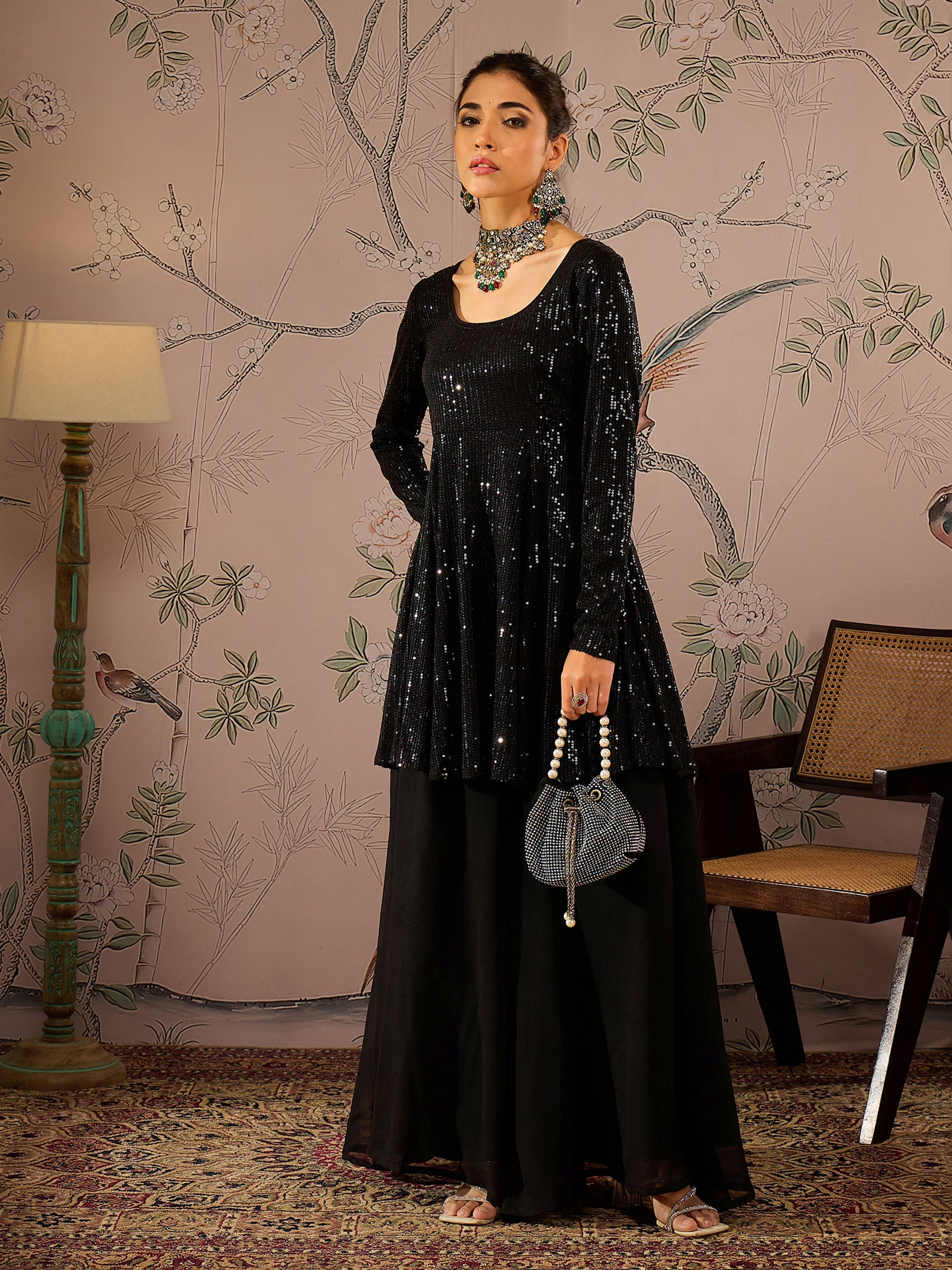 بلوزة سوداء مزينة بالترتر بتصميم بيبلوم مع بنطال واسع، مصنوعة من قماش الترتر، مبطنة بقماش الكريب الناعم، طول عادي، قصة ضيقة من الأعلى وواسعة من الأسفل، إغلاق برباط، حافة واسعة، وتتميز بتفاصيل دوري في الخلف.