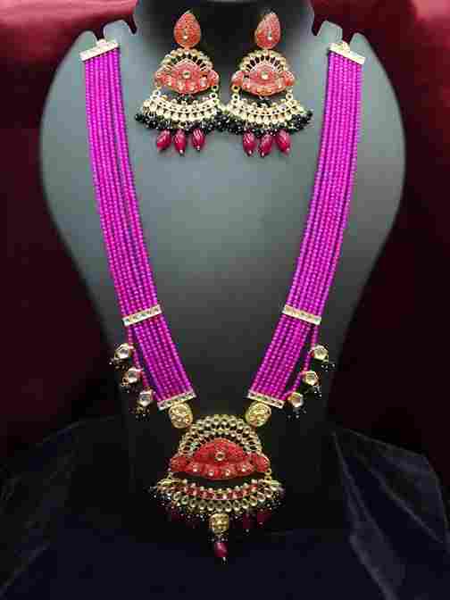 طقم قلادات مرصعة بالأحجار الكريمة باللون الوردي الغامق