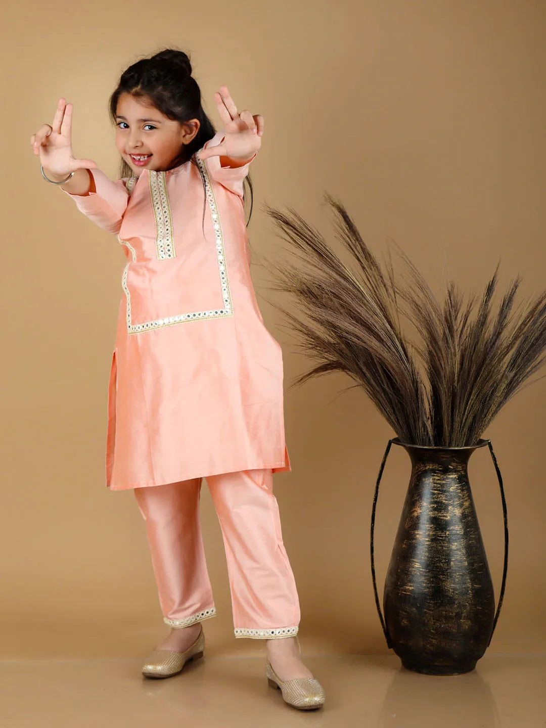 تقدم Vastramay طقم كورتا وبنطلون مستقيم مصنوع يدويًا بشكل جميل للفتيات. مصنوع من قماش فيسكوز، وله ثلاثة أكمام، ورقبة دائرية، وإغلاق بخطاف، وطوله يصل إلى الركبة وله حاشية مستقيمة. يتميز الكورتا بزخارف مرآوية على الرقبة وحاشية المنتصف. يأتي مع بنطلون مستقيم متناسق بحزام خصر مرن.