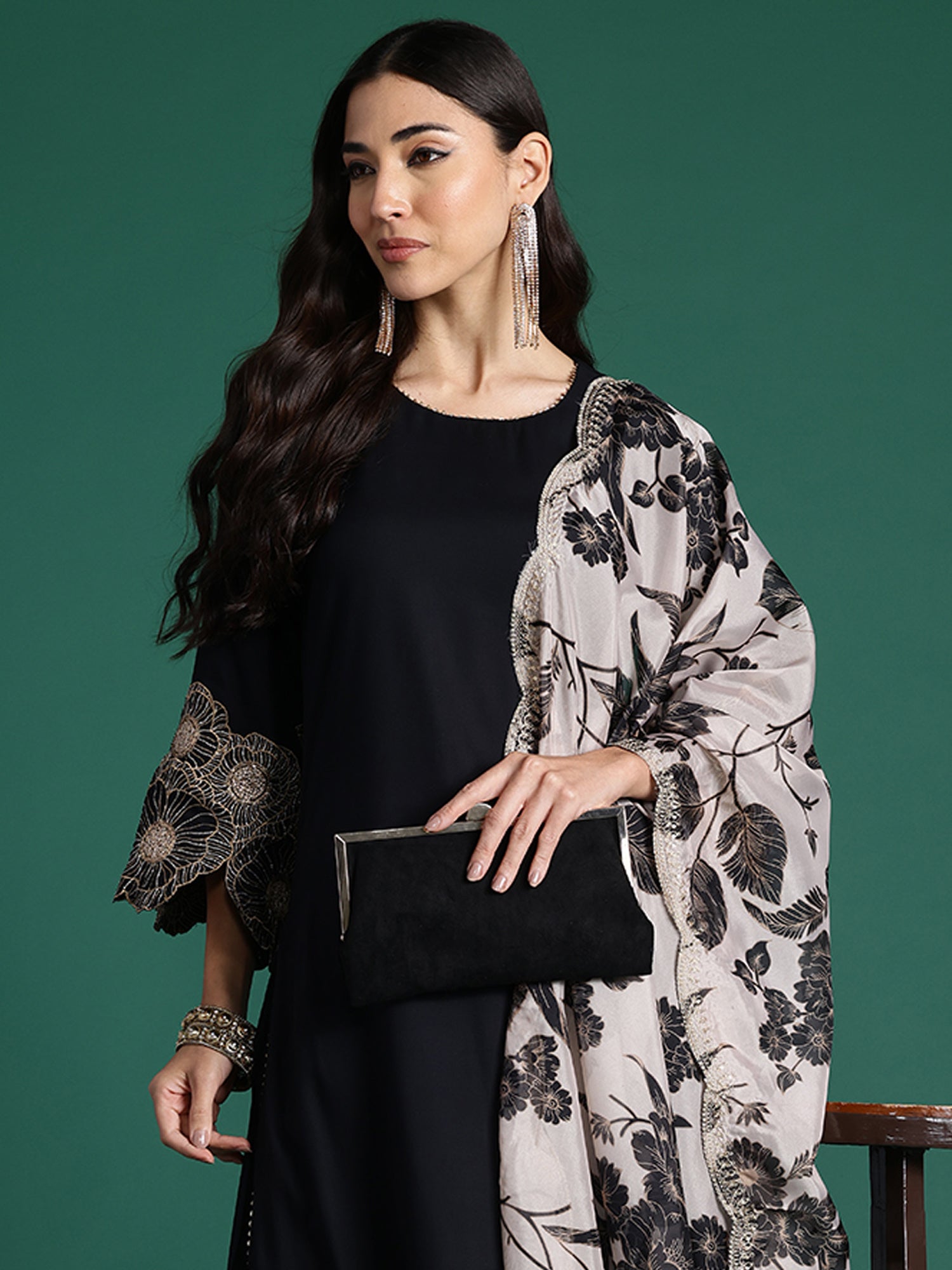 طقم كورتا أسود سادة مستقيم مع بنطلون وشال من إندو إيرا