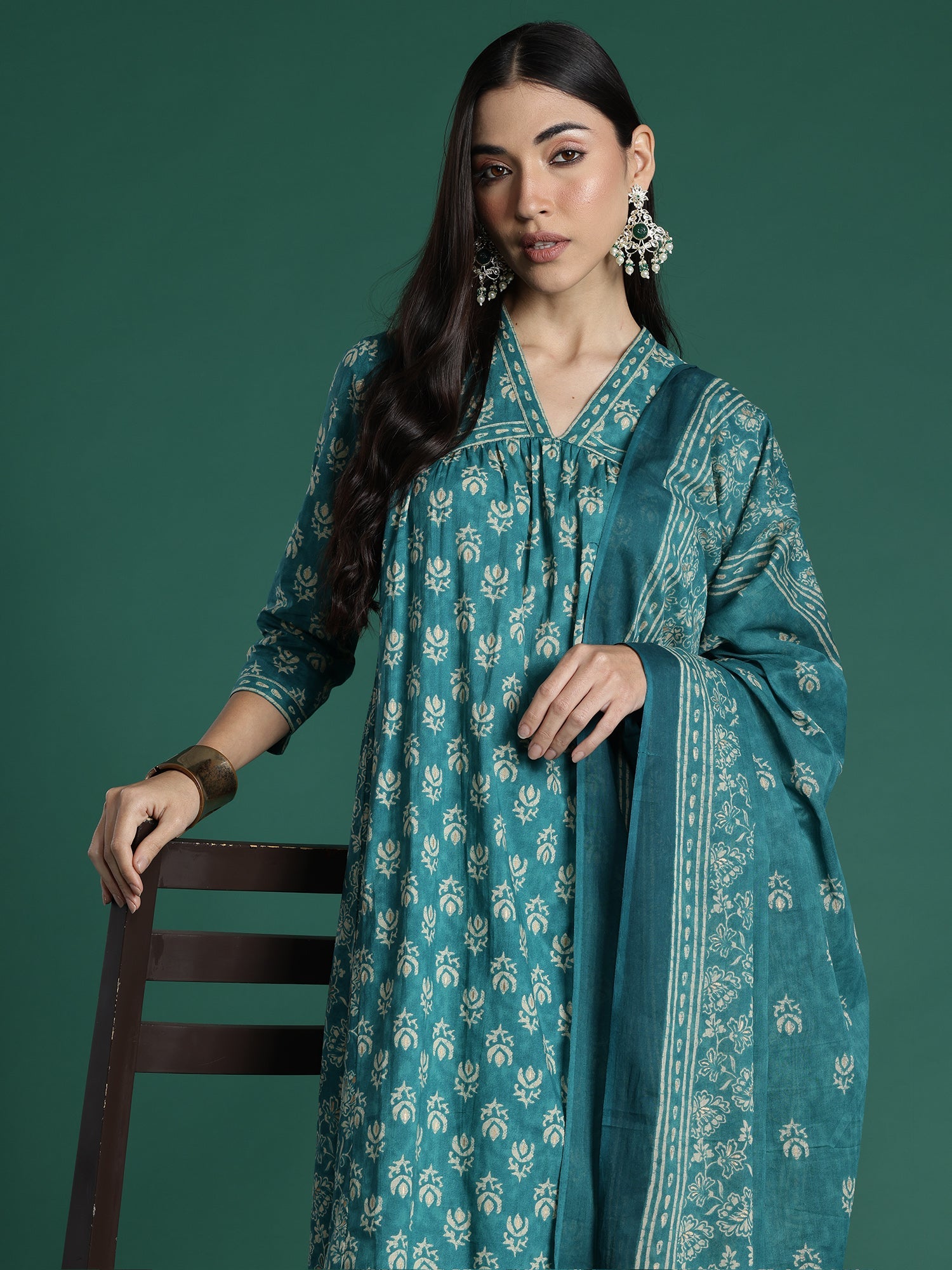 طقم كورتا نسائي من القطن الخالص مطبوع عليه زهور من العصر الهندي، مع بنطال وشال.