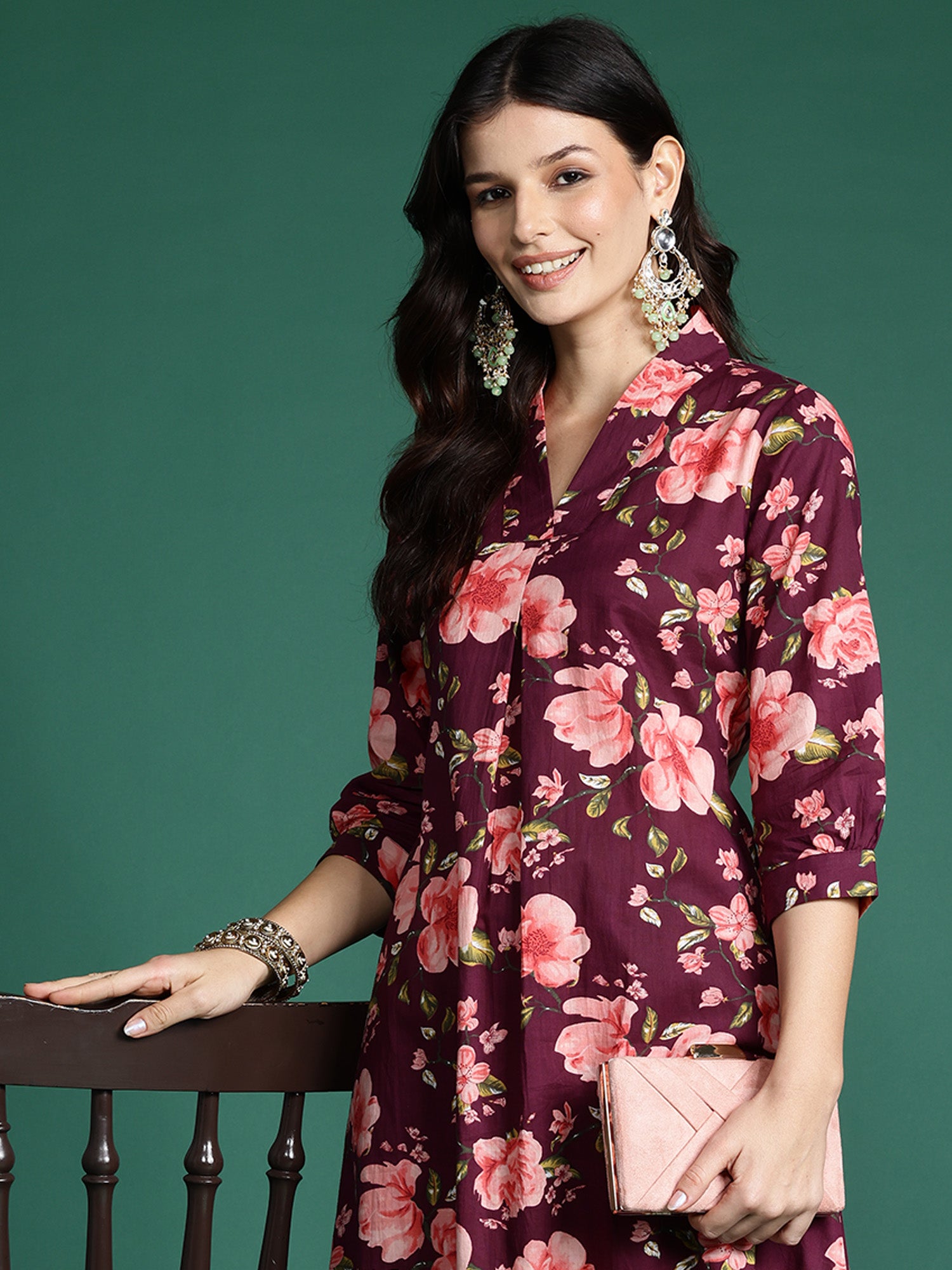 طقم كورتا وبنطلون بتصميم A-Line مطبوع باللون العنابي من العصر الهندي