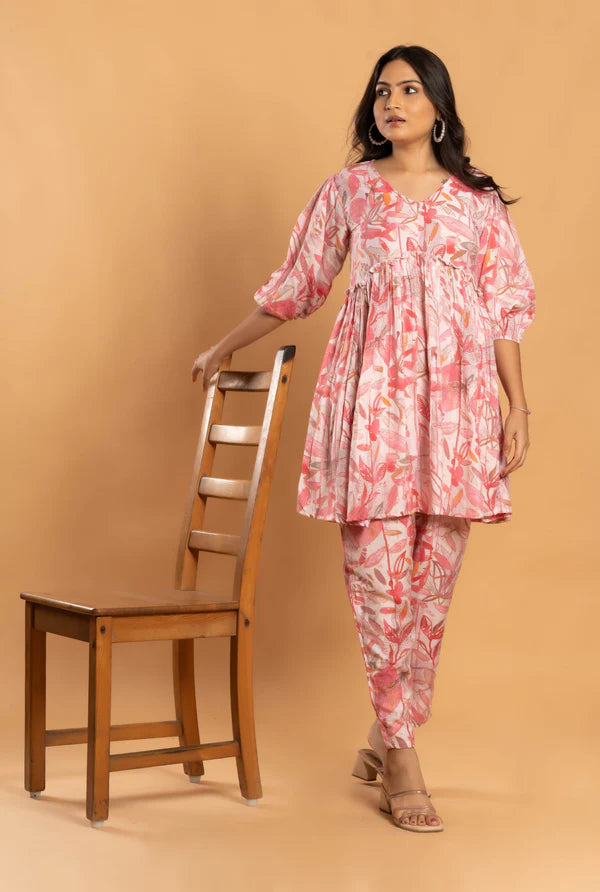 طول كامل | قماش موسلين | وردي | مطبوع | رقبة على شكل حرف V