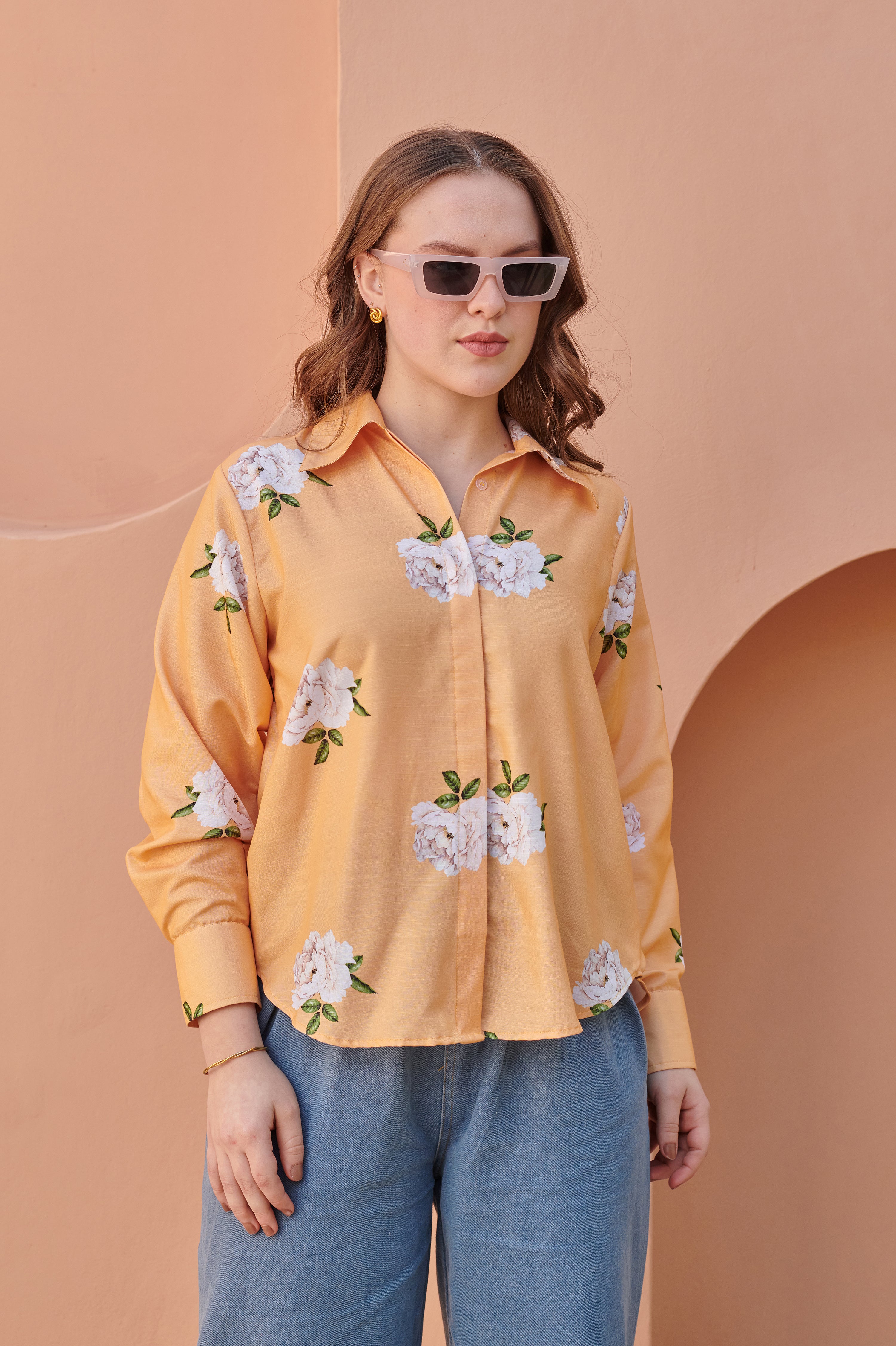 قميص برتقالي فاتح بنقوش زهرية رقيقة. خفيف، مريح، ومثالي لأي يوم.