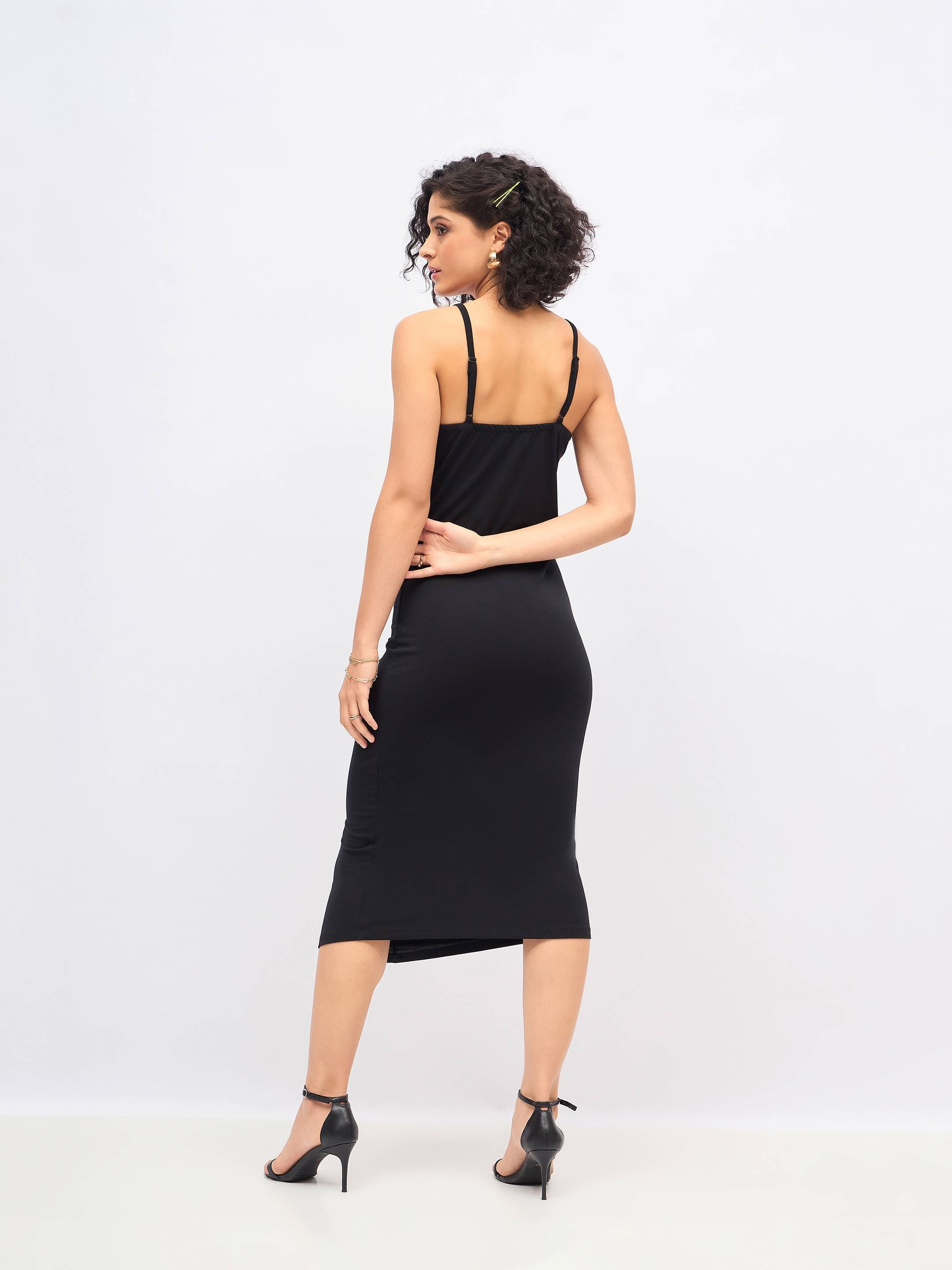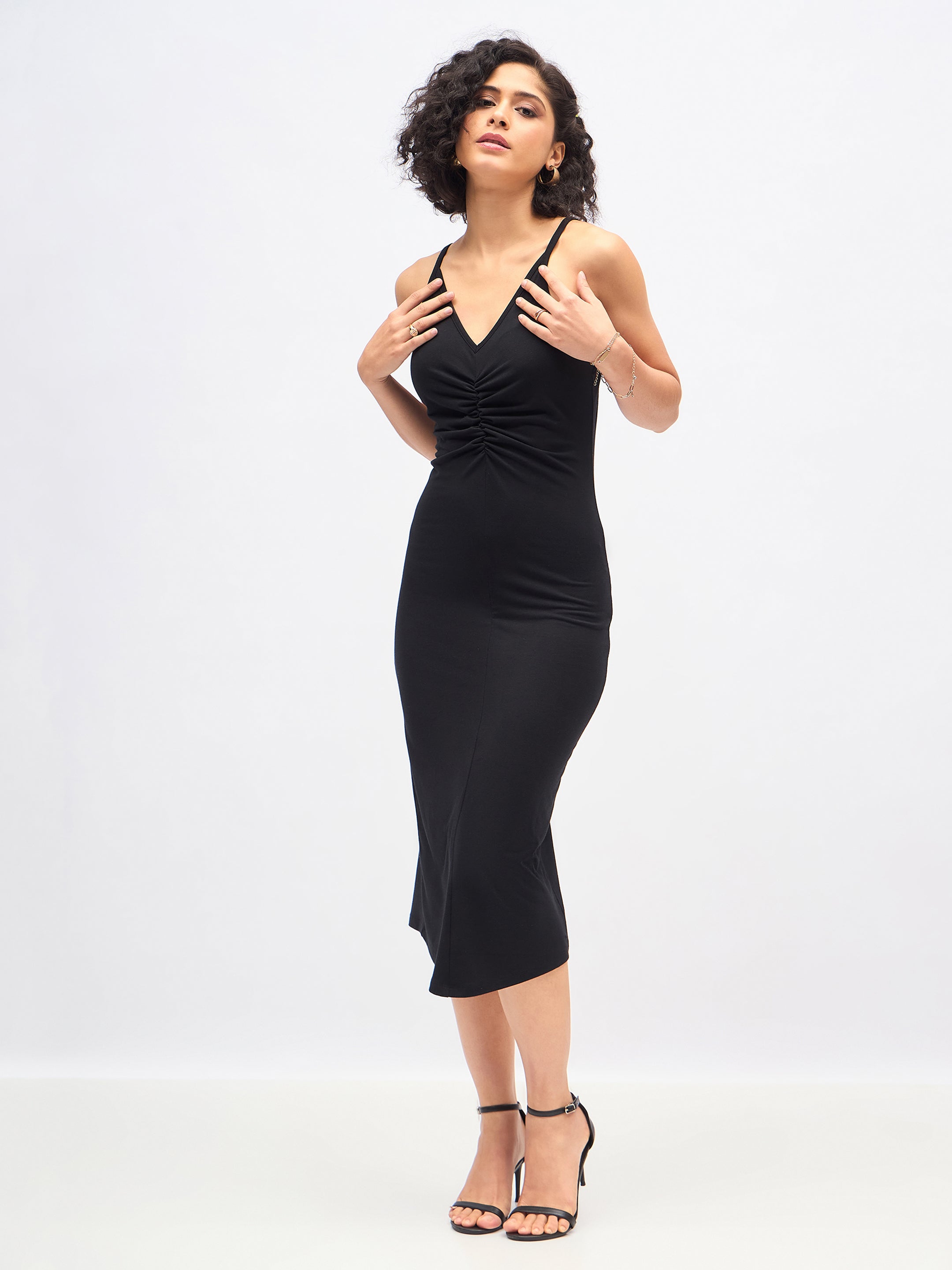 Black Strappy Front Ruched Dress, in PV Jersey fabric, Casual, Below Knee, NA, Unlined, Ruching At Front Hemline and features NA