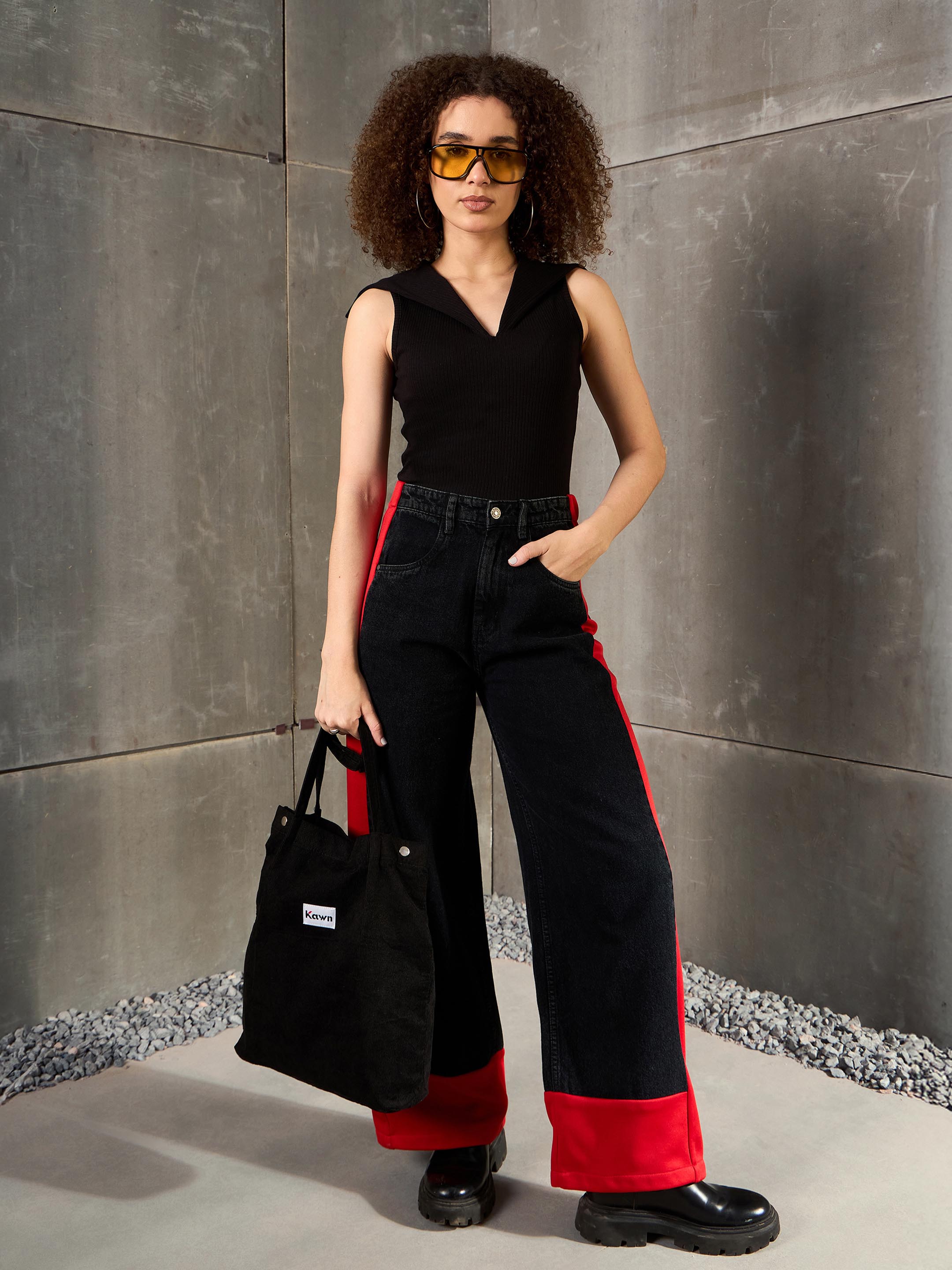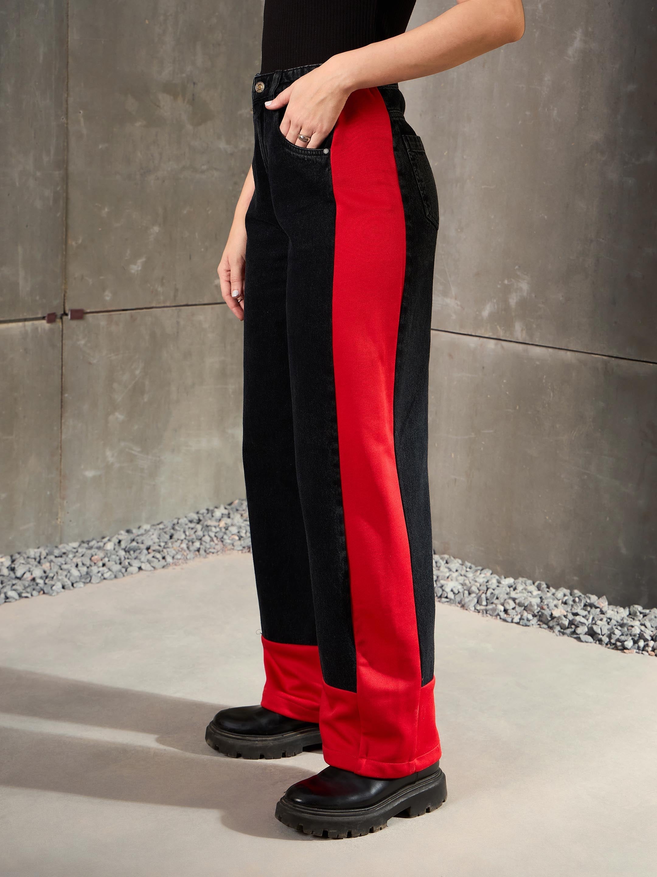 Black Washed Side ColorBlock Wide Leg Jeans, in Denim fabric, Unlined, Full length, Loose Fit, Zipper Closure, Straight Hemline and features Color Block At Side Seam And Hem