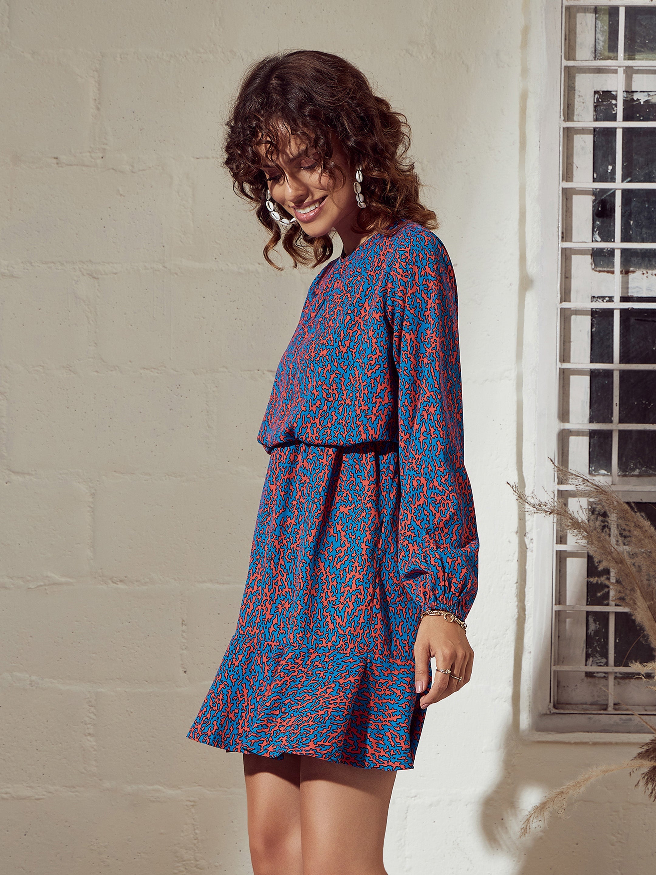 Blue Abstract Frill Hem Mini Dress, in Poly Moss fabric, Polyknit, Above Knee, Fit & Flare, Button Closure, Flared Hemline and features Tie Detail At Front