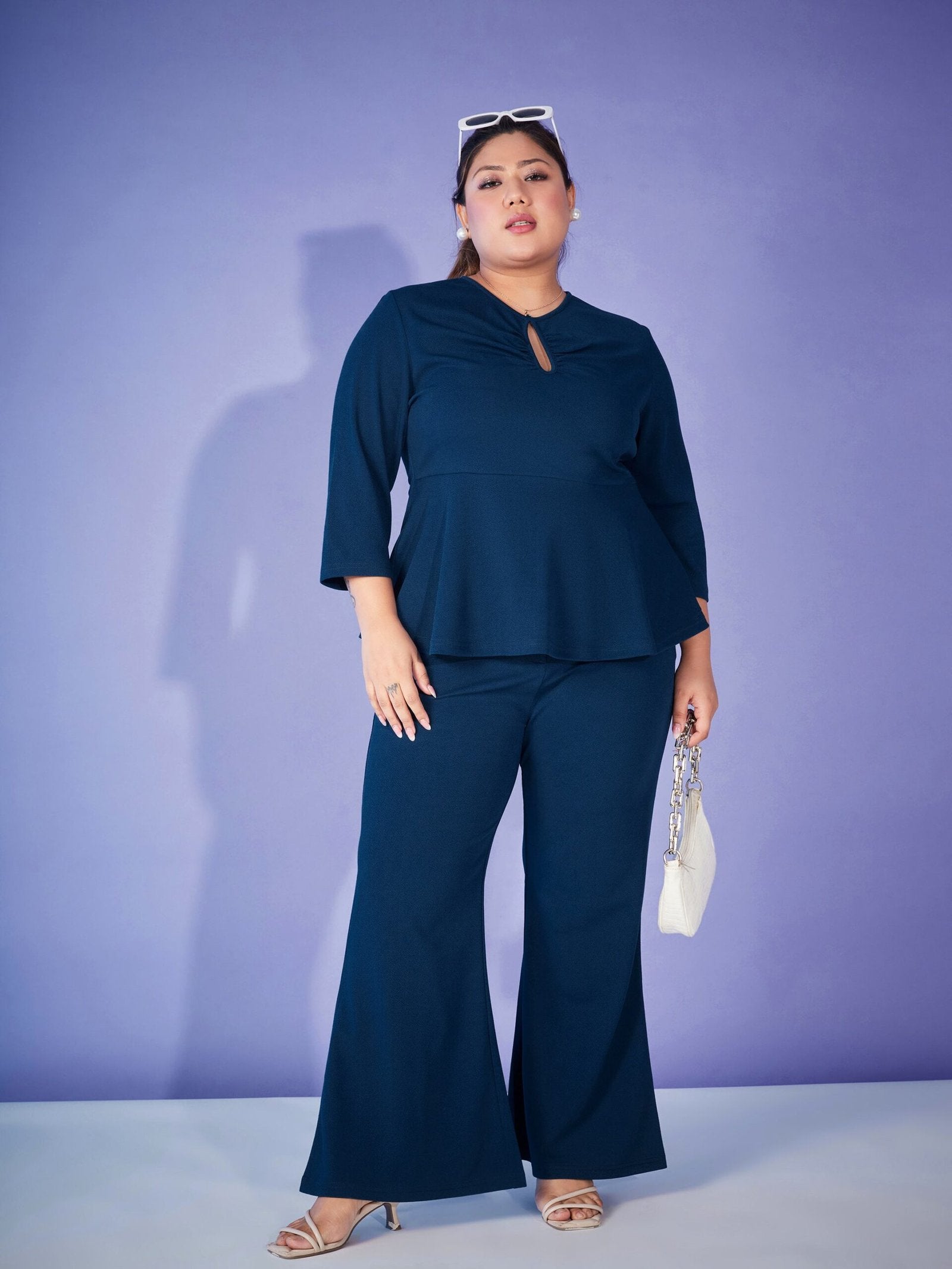 بنطال واسع الساقين باللون الأزرق الداكن فقط، مصنوع من قماش كارارا المحبوك، بدون بطانة، طول عادي، قصة ضيقة من الأعلى وواسعة من الأسفل، إغلاق بأزرار، العارضة ترتدي مقاس XXL | محيط صدر العارضة: 42 بوصة، محيط خصرها: 36 بوصة | محيط أردافها: 46 بوصة | طولها: 5 أقدام و7 بوصات