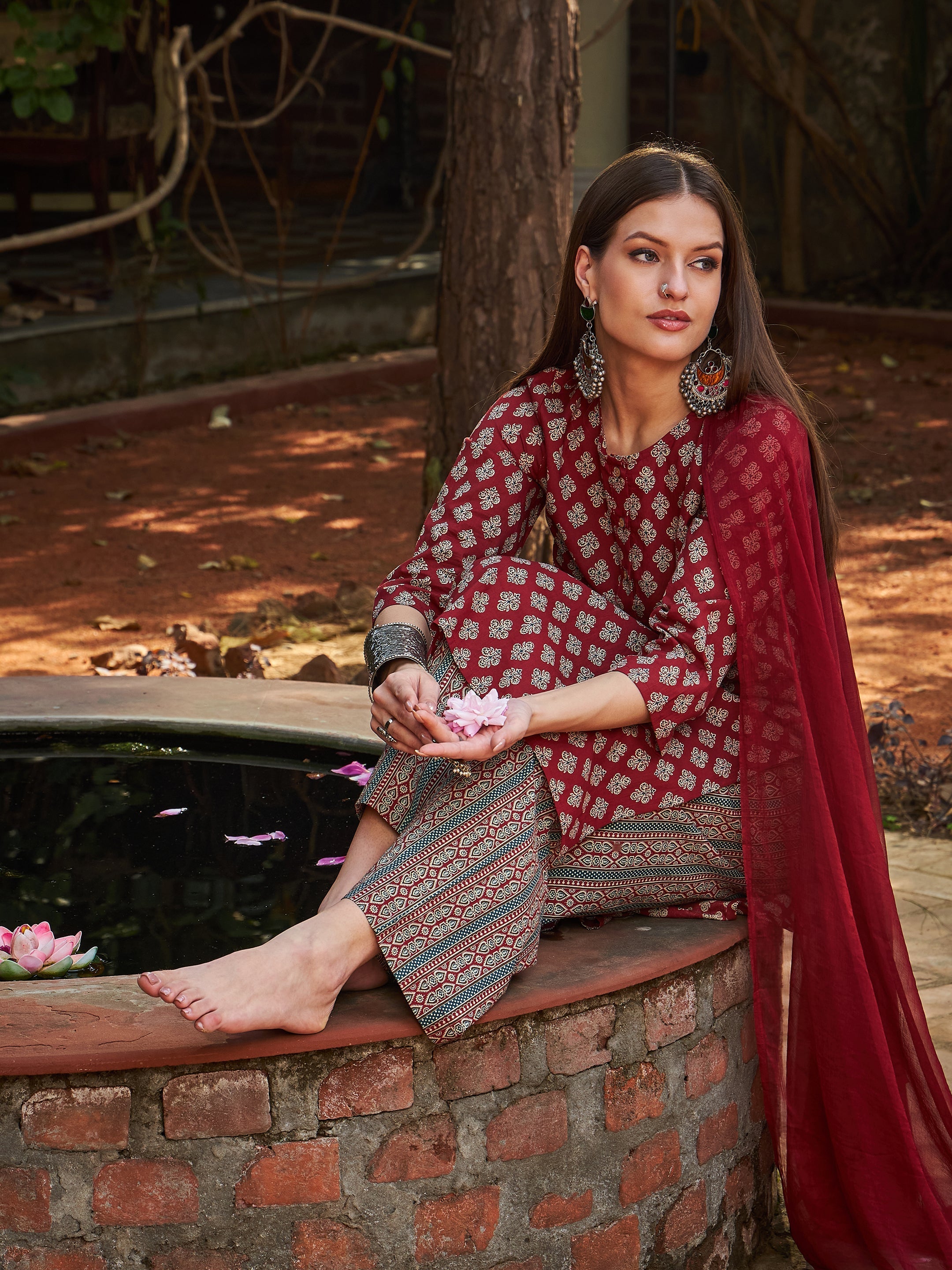 قميص كورتا مستقيم بلون خمري مزين بنقوش زهرية، مع بنطال وشال، مصنوع من قماش كامبريك قطني، بدون بطانة، طول متوسط، قصة مريحة، إغلاق بأزرار، حافة مستقيمة، ويتميز بزر خشبي في الأمام.