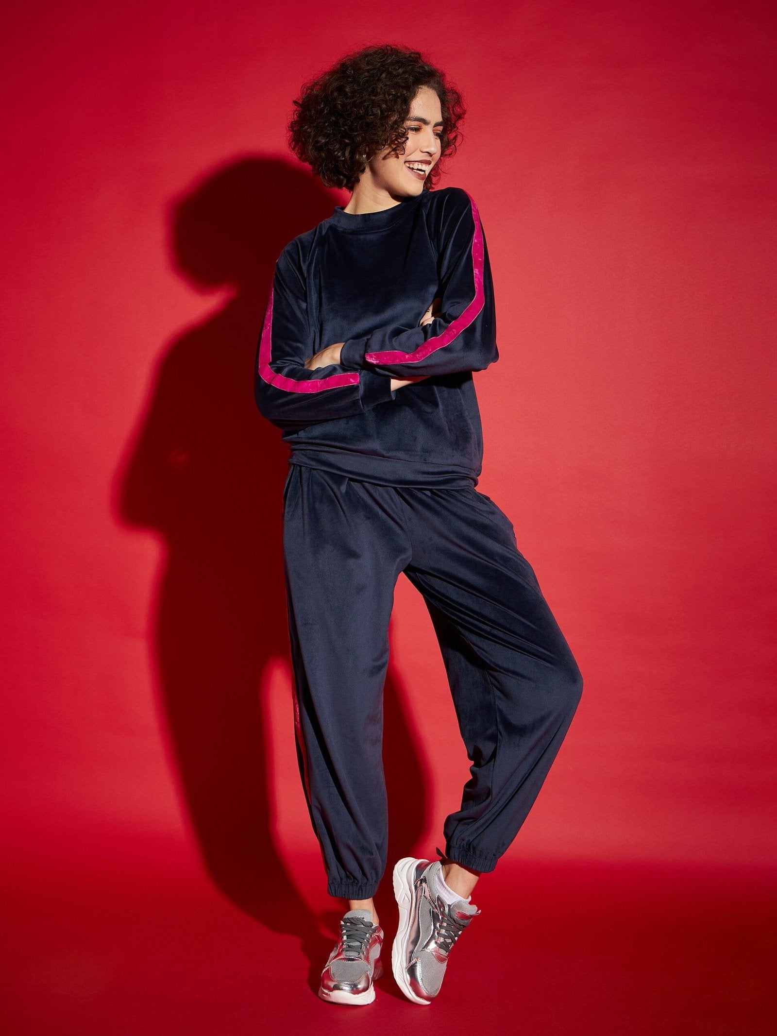 سويت شيرت بتفاصيل شريط مخملي أزرق داكن مع بنطال رياضي، من قماش مخملي، غير مبطن، طول عادي، مقاس مريح، سهل الارتداء، حاشية مستقيمة ويتميز بتفاصيل شريط متباين | معلومات العارضة ترتدي العارضة مقاس S | صدر العارضة - 33 بوصة | الخصر - 27 بوصة | الطول - 5'8 بوصة | المواصفات