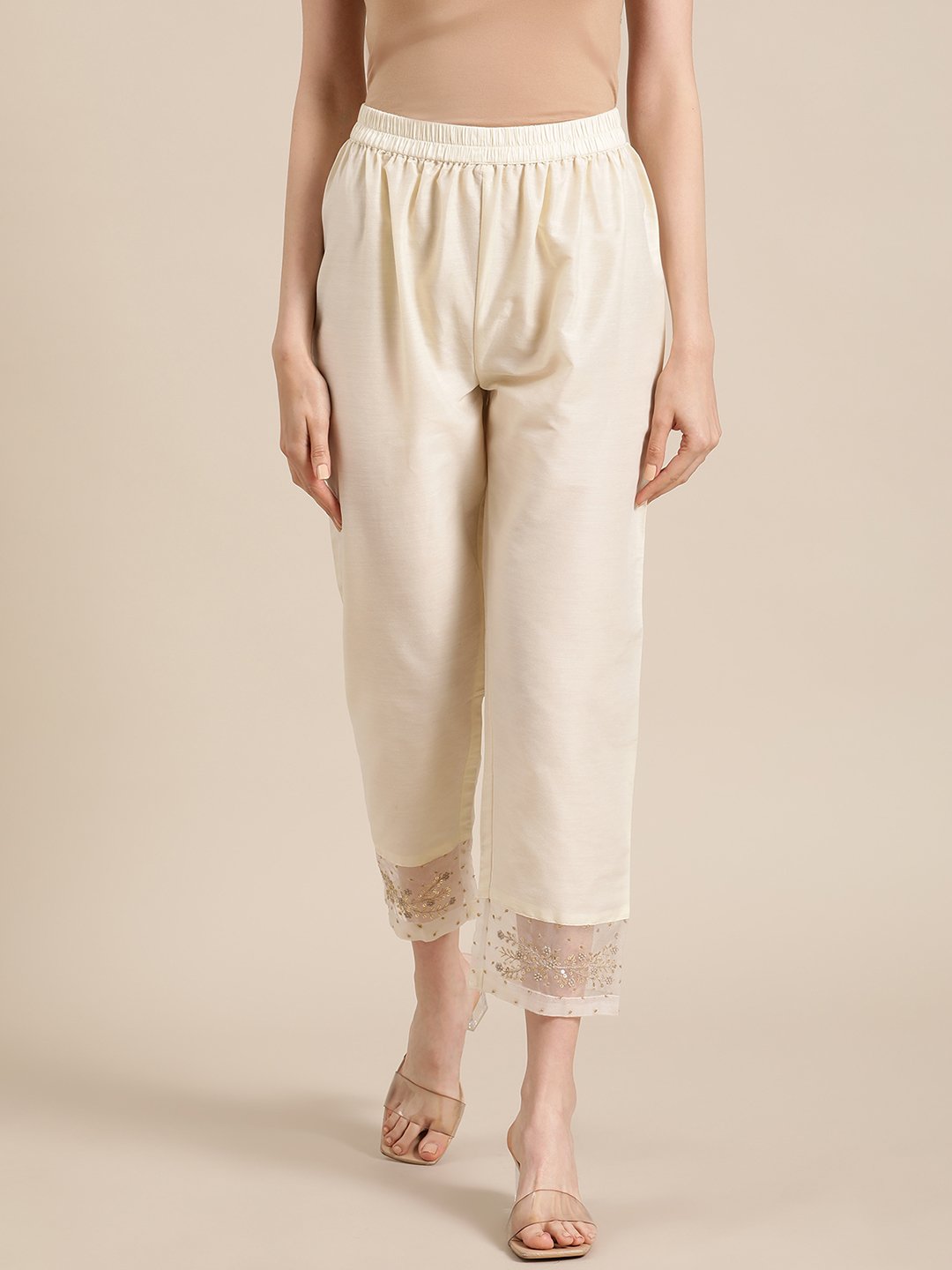 بنطلون قصير سادة باللون الأبيض العاجي، بخصر متوسط، مع إغلاق سهل الارتداء