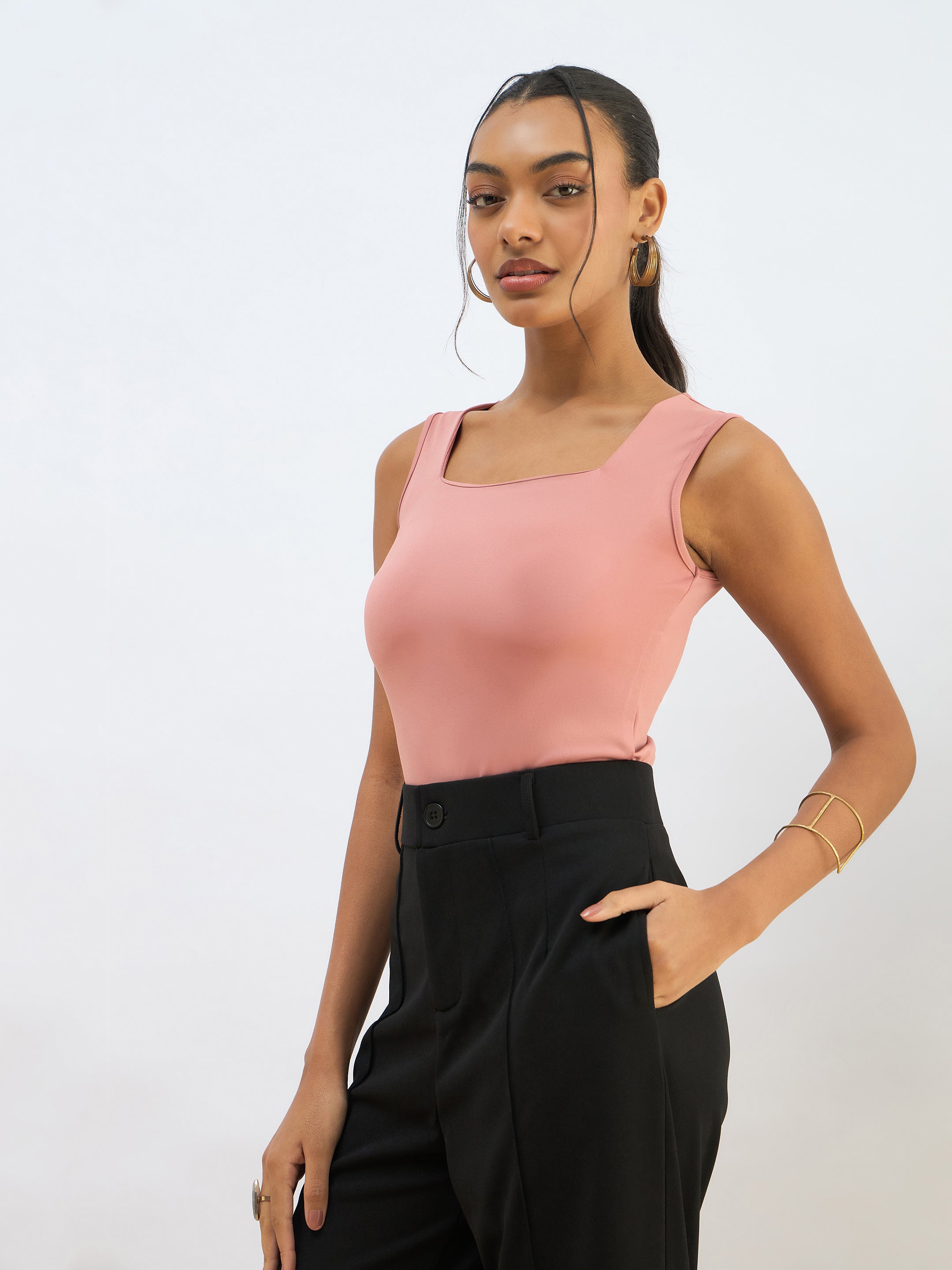 Pink Rhombus Neck Sleeveless Bodysuit, in Lycra Spendex fabric, Unlined, Regular Length, Slim Fit, Button Closure, Straight Hemline and features Concealed Press Studs At Crotch