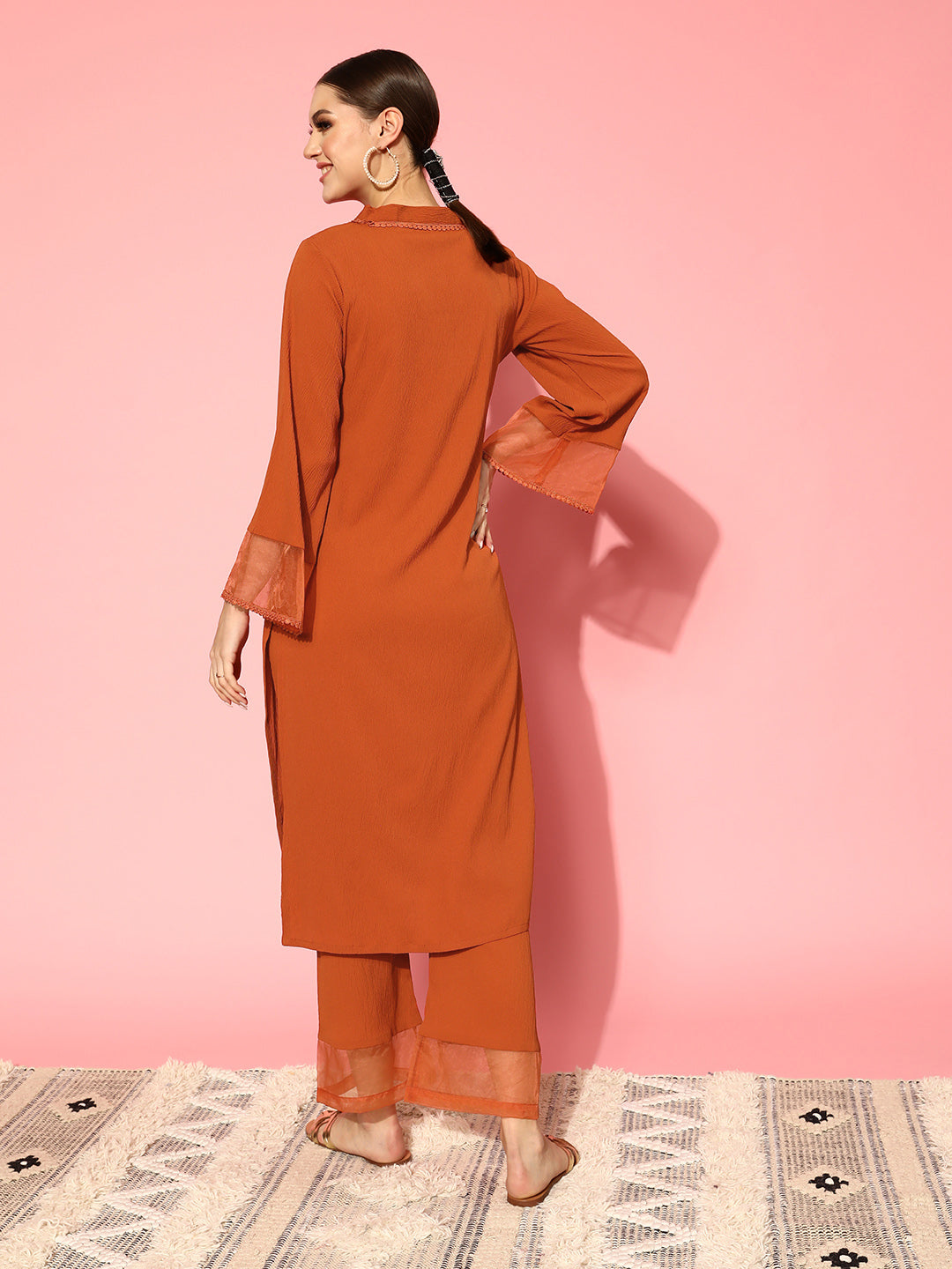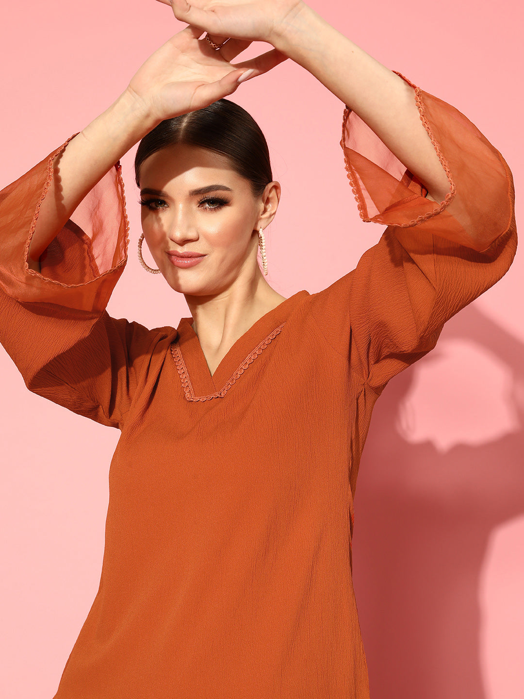 قميص كورتا مستقيم بفتحة رقبة على شكل حرف V بلون الصدأ مع تفاصيل من الدانتيل القطني وأكمام طويلة واسعة مع حاشية من الأورجانزا مع شقوق جانبية مقترنة بجزء سفلي متناغم مع حاشية من الأورجانزا