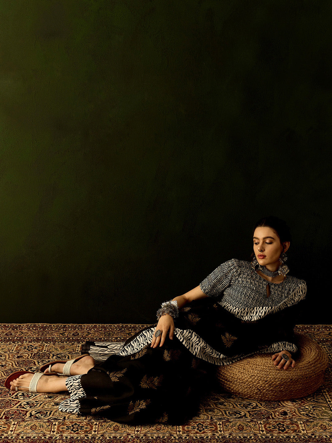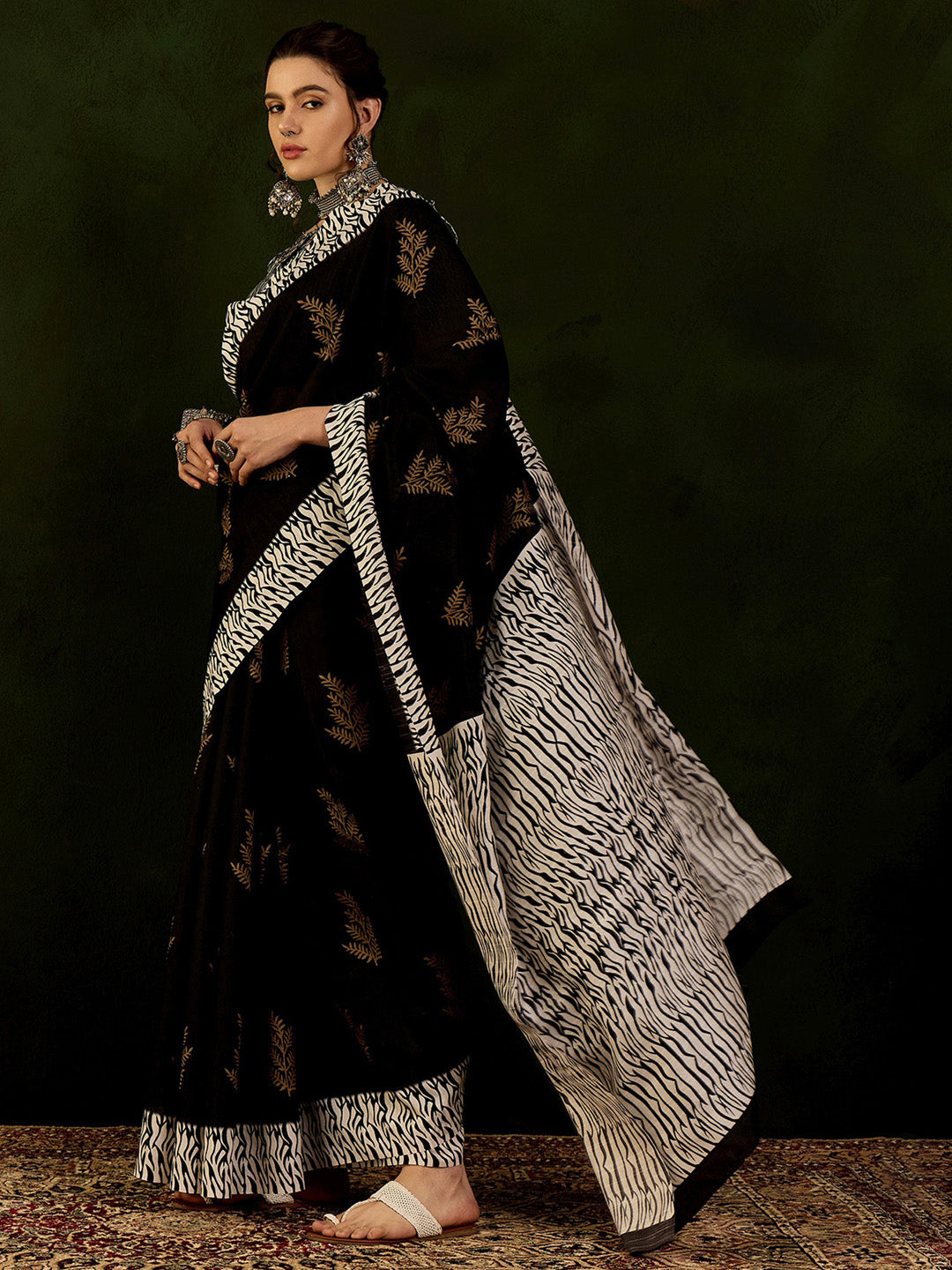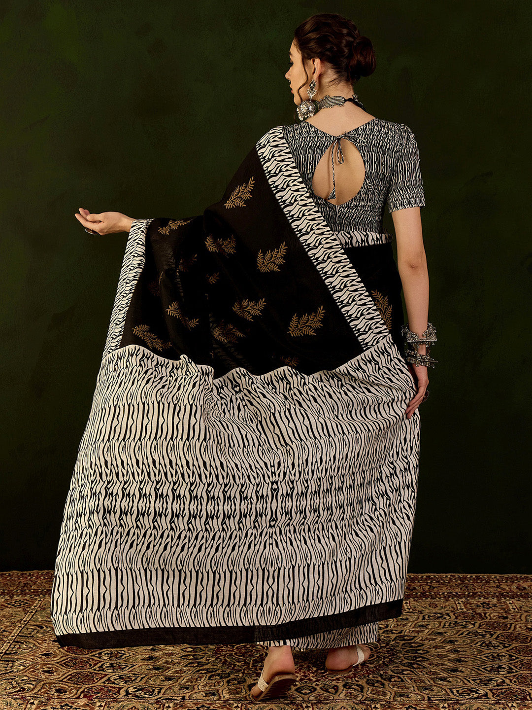 ساري نسائي أسود مطبوع من حرير بهجالبوري مع قطعة بلوزة