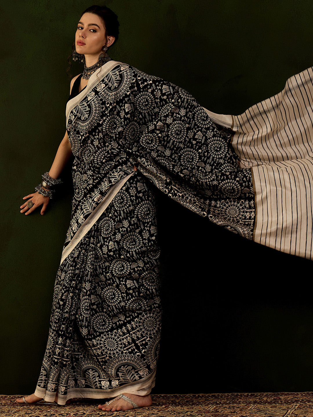 هذا الساري من ساري مول مصنوع من حرير بهجالبوري الأسود. تأتي ساري مول مع قطعة قماش للبلوزة، يمكن تفصيلها حسب ذوقك. صُنع هذا الساري على أيدي حرفيين مهرة دون المساومة على جودته. بتصميمه الجميل وقماشه الفاخر، سيحظى هذا الساري بإعجاب الجميع. مقاس الساري 5.5 متر، ومقاس البلوزة 0.8 متر، مقاس حر.