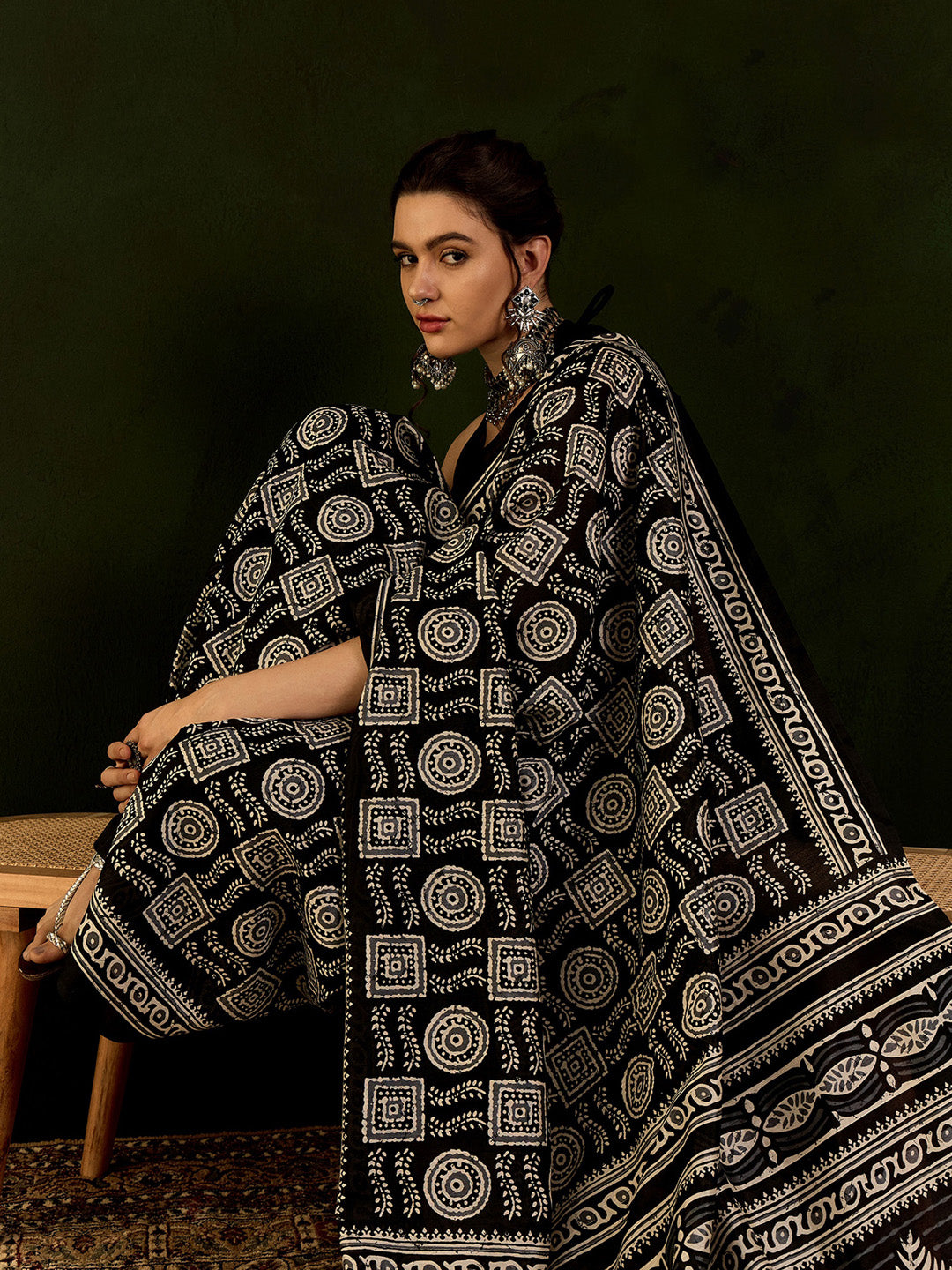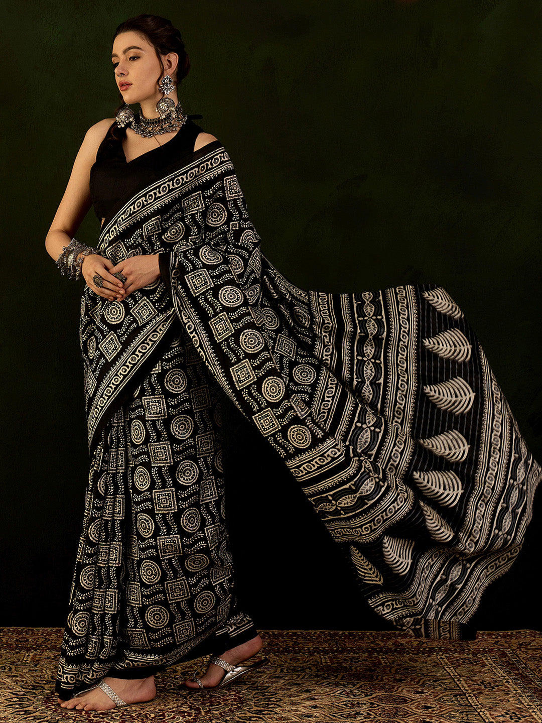 هذا الساري من ساري مول مصنوع من حرير بهجالبوري الأسود. تأتي ساري مول مع قطعة قماش للبلوزة، يمكن تفصيلها حسب ذوقك. صُنع هذا الساري على أيدي حرفيين مهرة دون المساومة على جودته. بتصميمه الجميل وقماشه الفاخر، سيحظى هذا الساري بإعجاب الجميع. مقاس الساري 5.5 متر، ومقاس البلوزة 0.8 متر، مقاس حر.