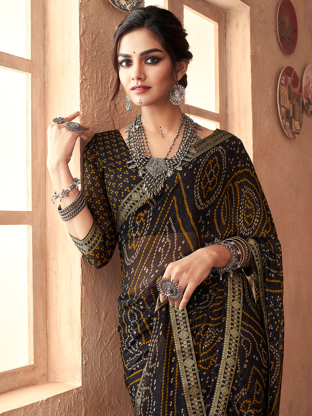 هذا الساري من دار ساري مول مصنوع من الشيفون ولونه أسود. تأتي ساري ساري مول العرقية مع قطعة بلوزة، يمكن تفصيلها حسب ذوقك وتفضيلاتك. صُنع هذا الساري على يد حرفيين مهرة دون المساومة على جودته. بتصميمه الجميل وقماشه الرائع، سيجلب لك هذا الساري الكثير من الإطراء والثناء. مقاس الساري 5.5 متر، ومقاس البلوزة 0.8 متر، مقاس حر.