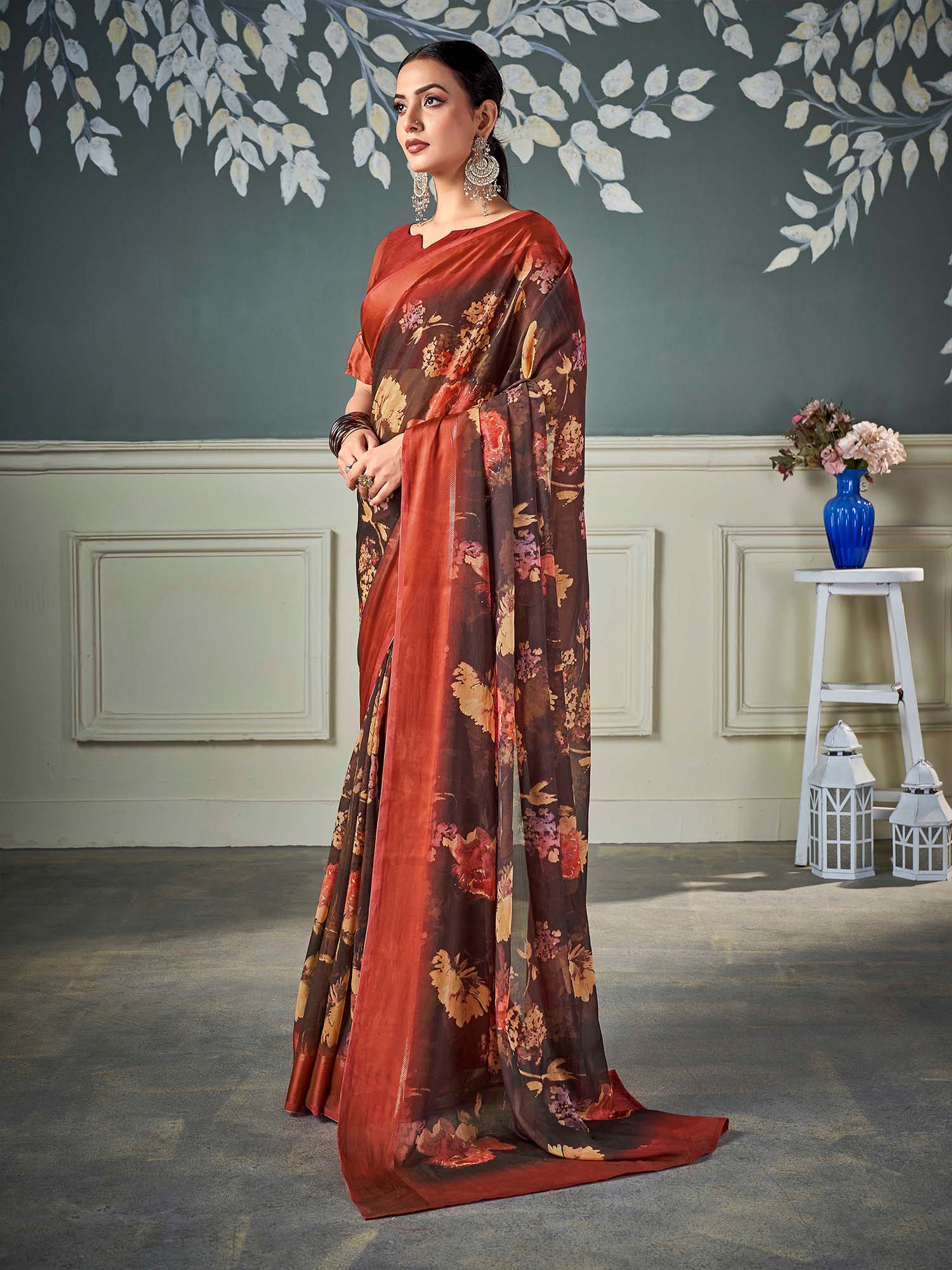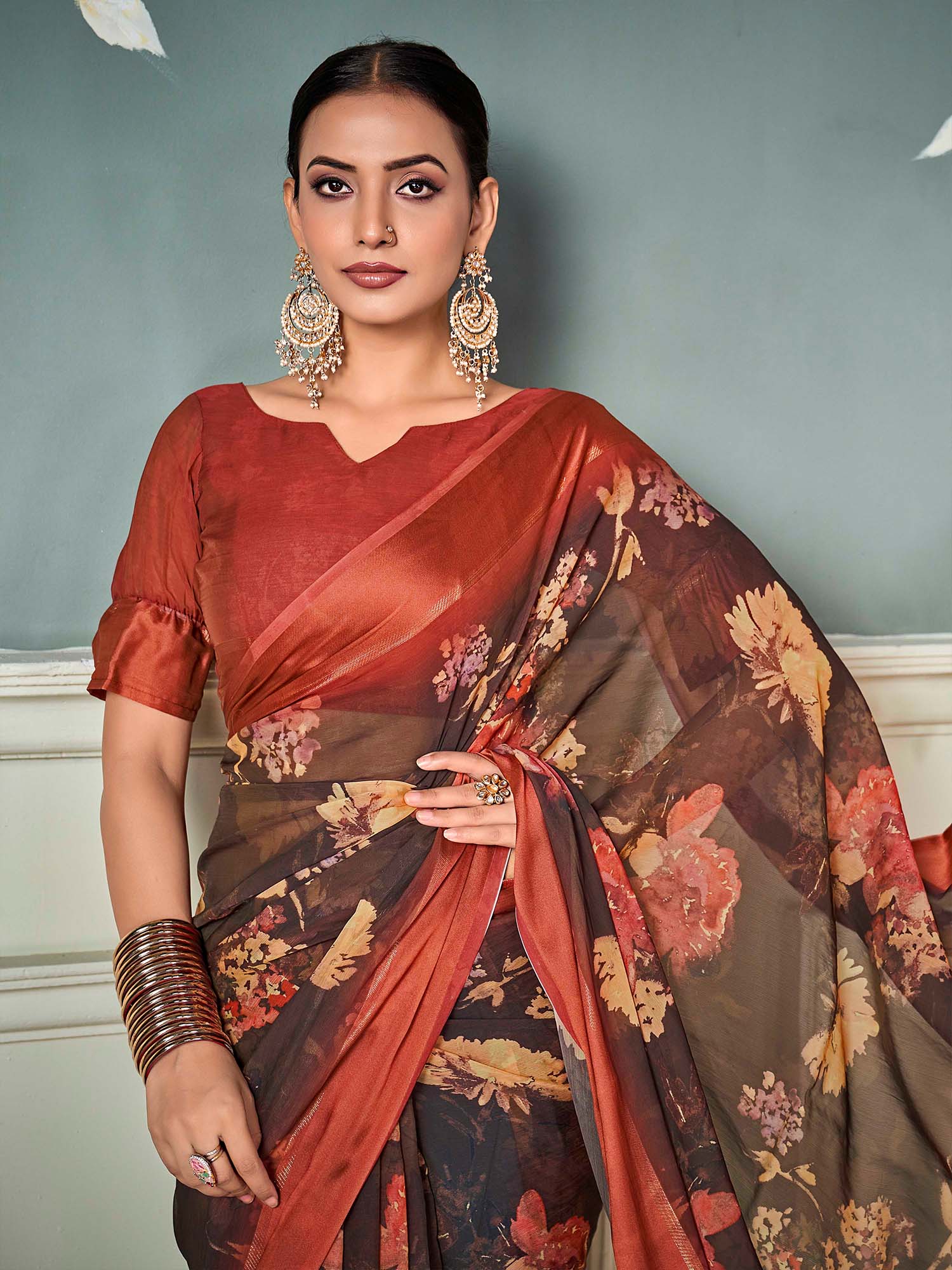 ساري نسائي بني مطبوع من الشيفون بتصميم أنيق مع قطعة بلوزة