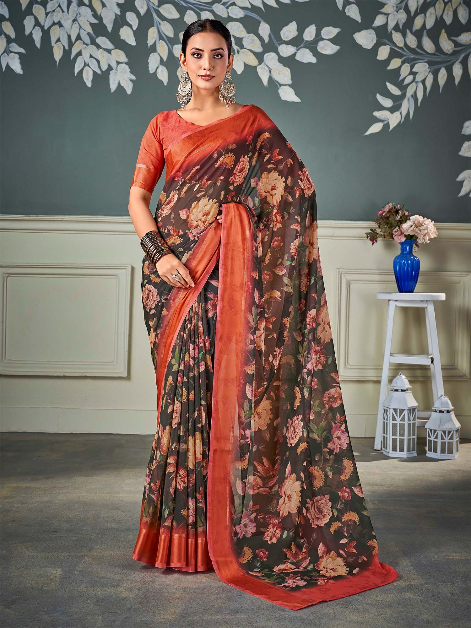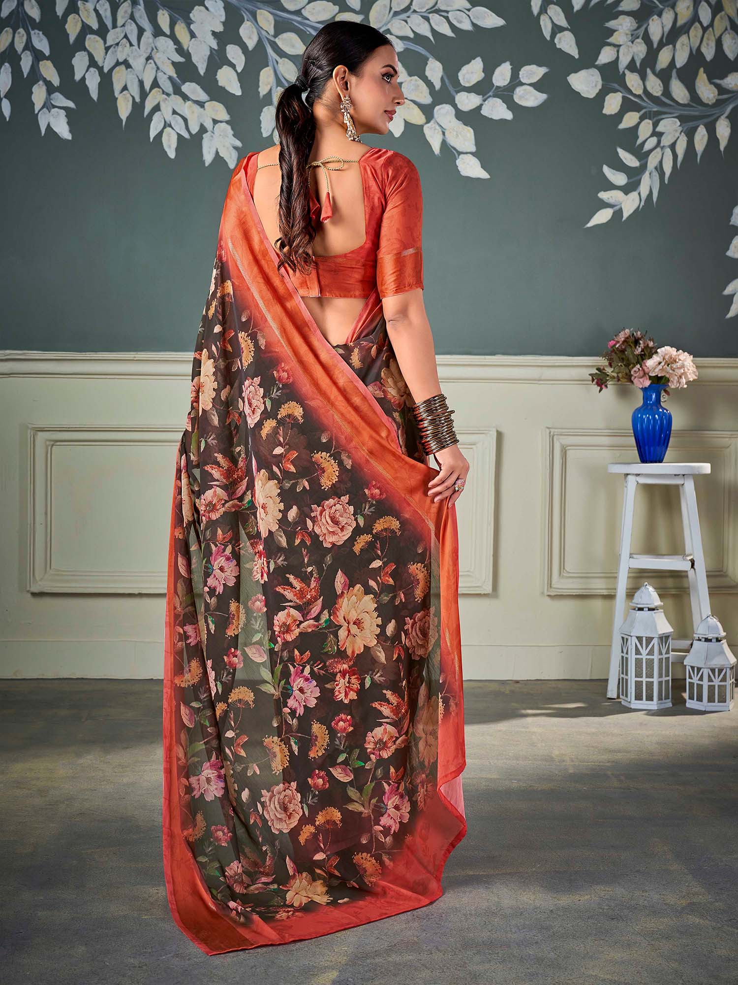 ساري نسائي بني مطبوع من الشيفون بتصميم أنيق مع قطعة بلوزة