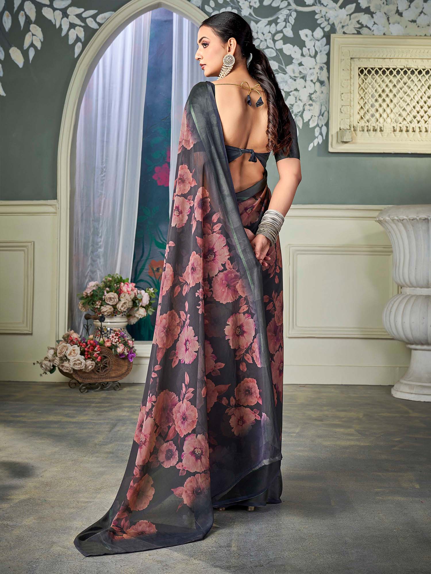 ساري نسائي رمادي مطبوع من الشيفون بتصميم أنيق مع قطعة بلوزة