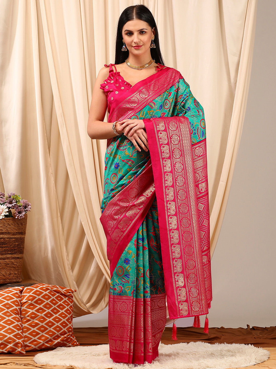 ساري نسائي أزرق مطبوع مطبوع من مزيج القطن مع قطعة بلوزة