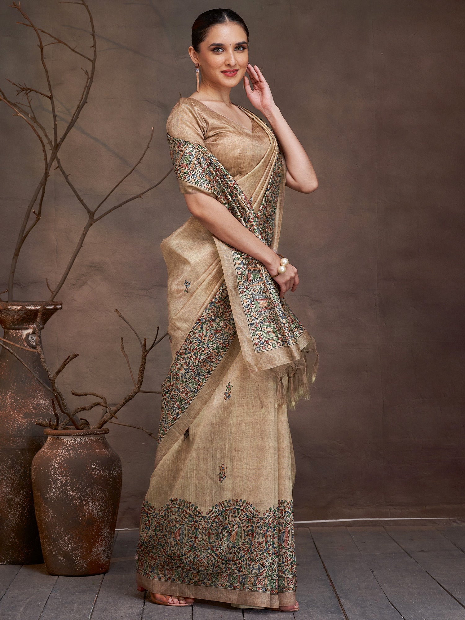ساري نسائي من القطن والحرير، بيج اللون، مطبوع رقميًا، بتصميم أنيق، مع قطعة بلوزة.