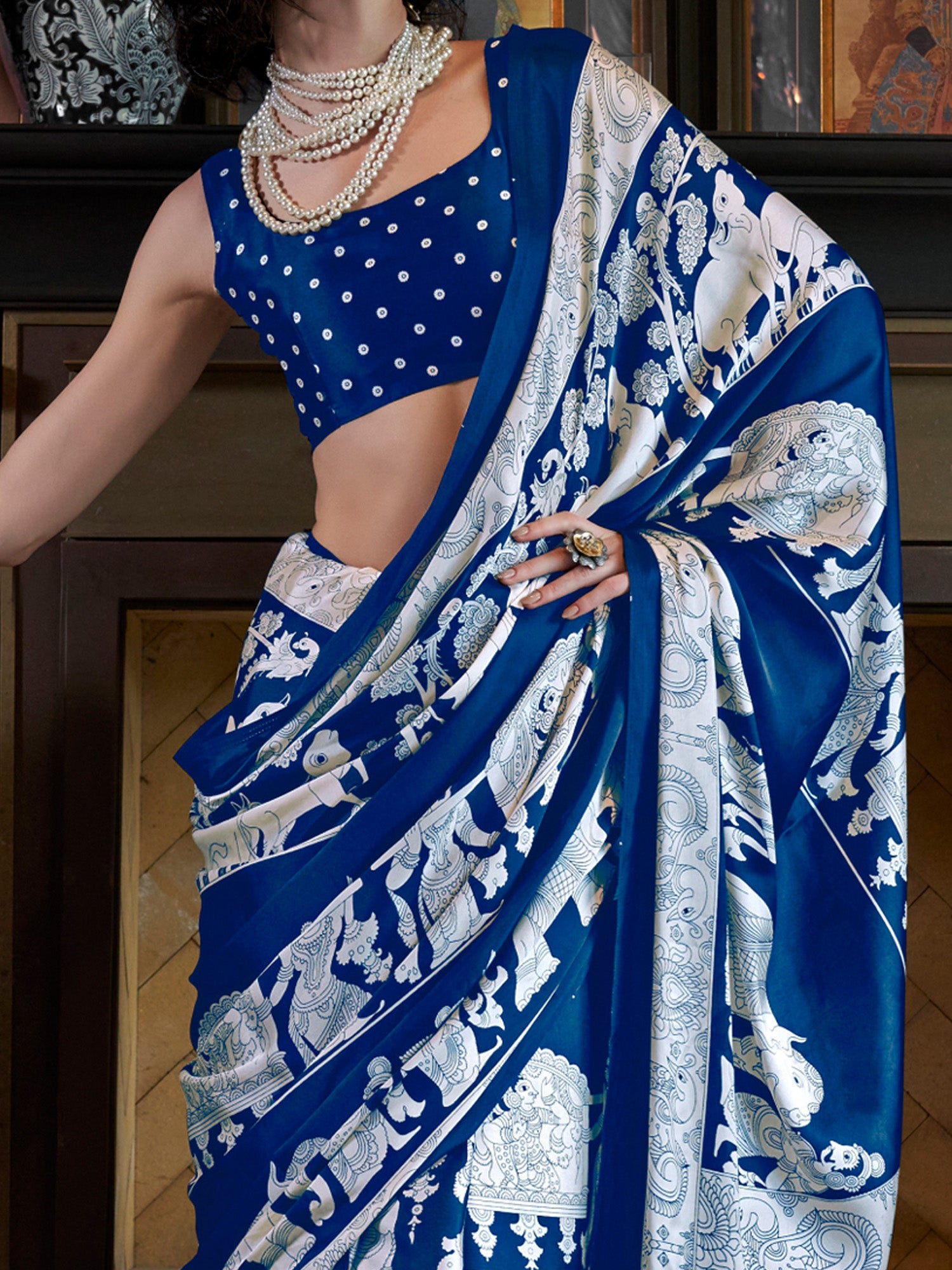هذا الساري من ساري مول مصنوع من الكريب ولونه أزرق. تأتي ساري مول مع قطعة بلوزة يمكن تفصيلها حسب ذوقك. صُنع هذا الساري على أيدي حرفيين مهرة دون المساومة على جودته. بتصميمه الجميل وقماشه الرائع، سيحظى هذا الساري بإعجاب الجميع. مقاس الساري 5.5 متر، ومقاس البلوزة 0.8 متر، مقاس حر.