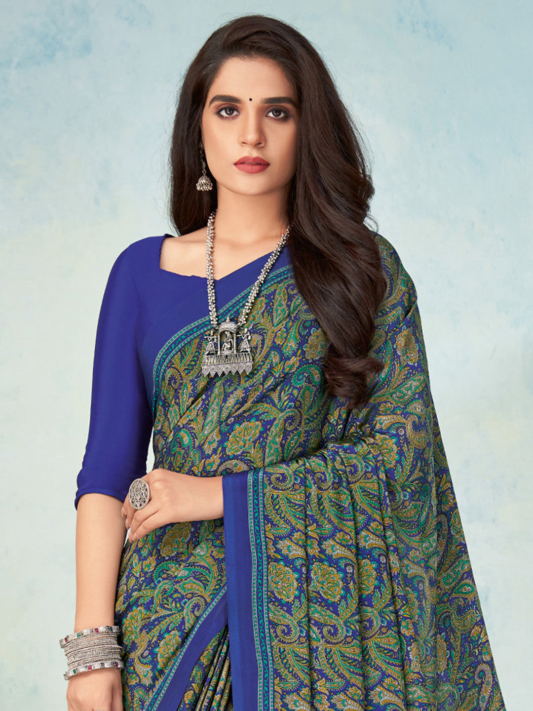 ساري نسائي أزرق مطبوع من الكريب مع قطعة بلوزة