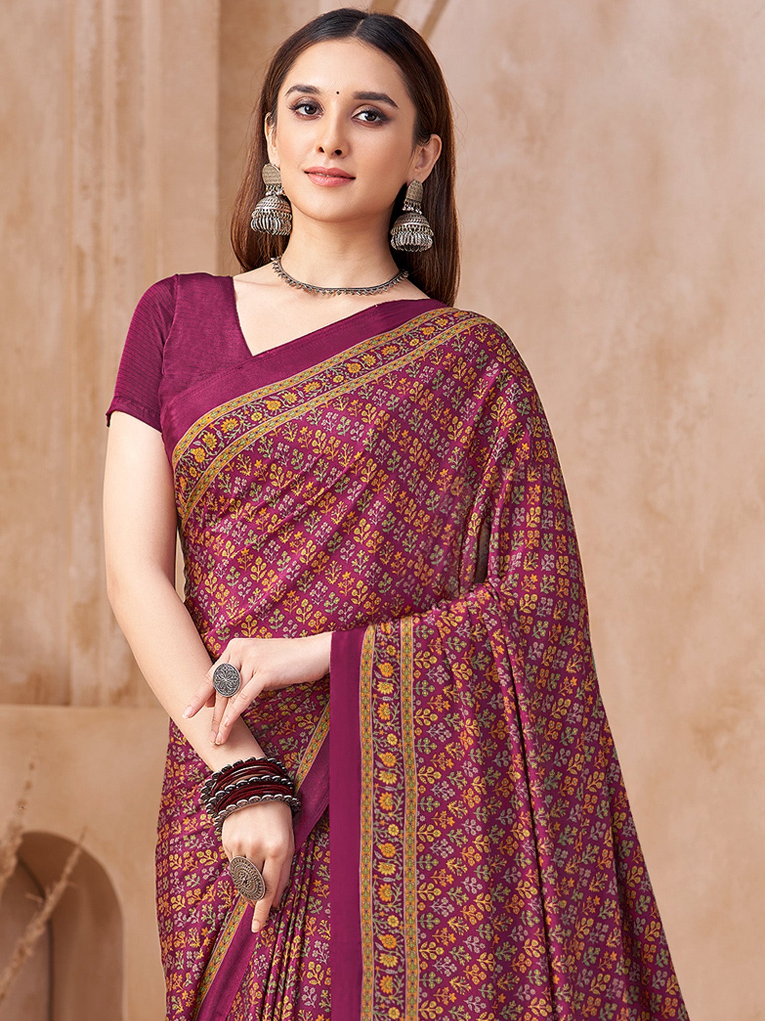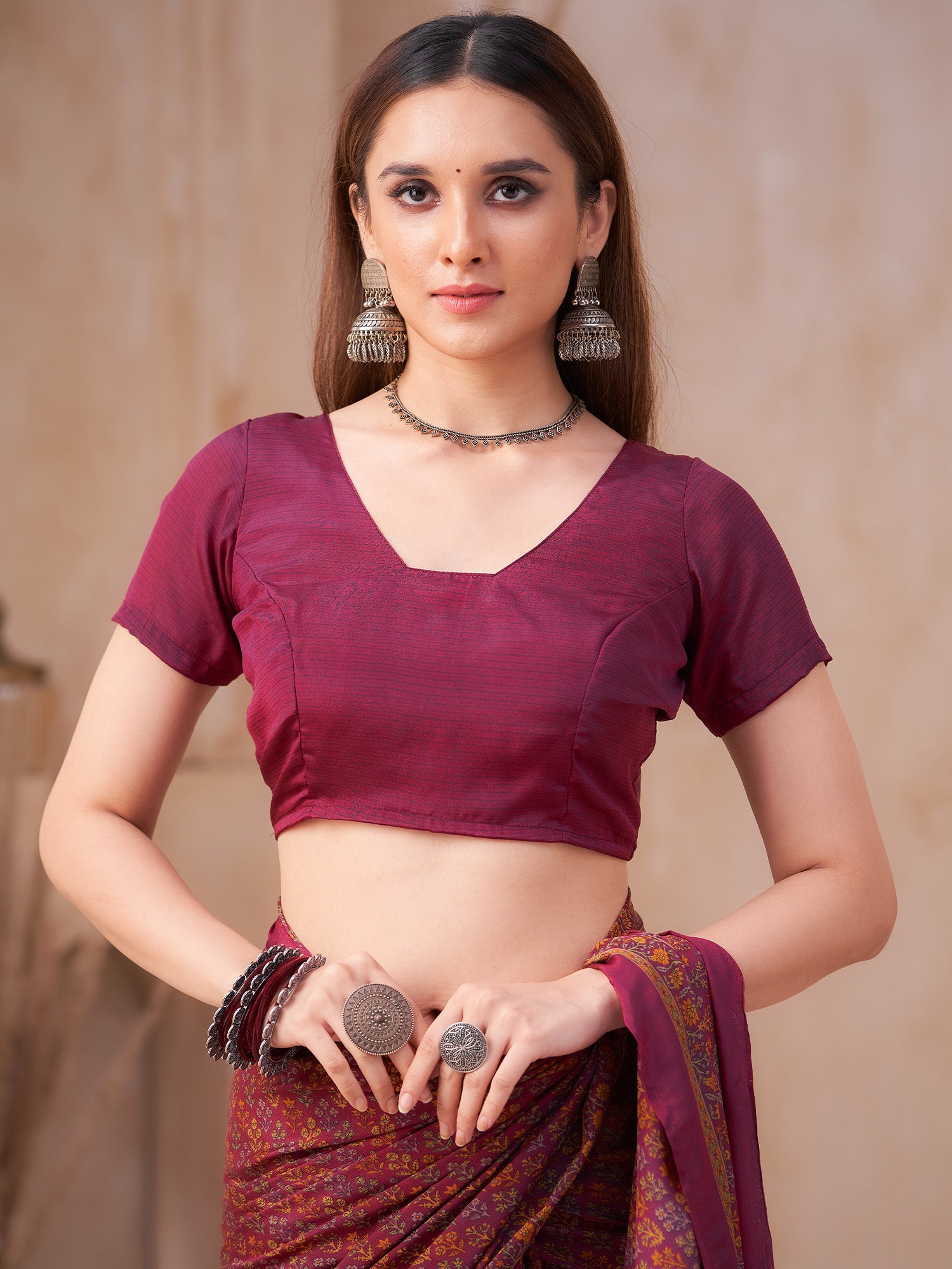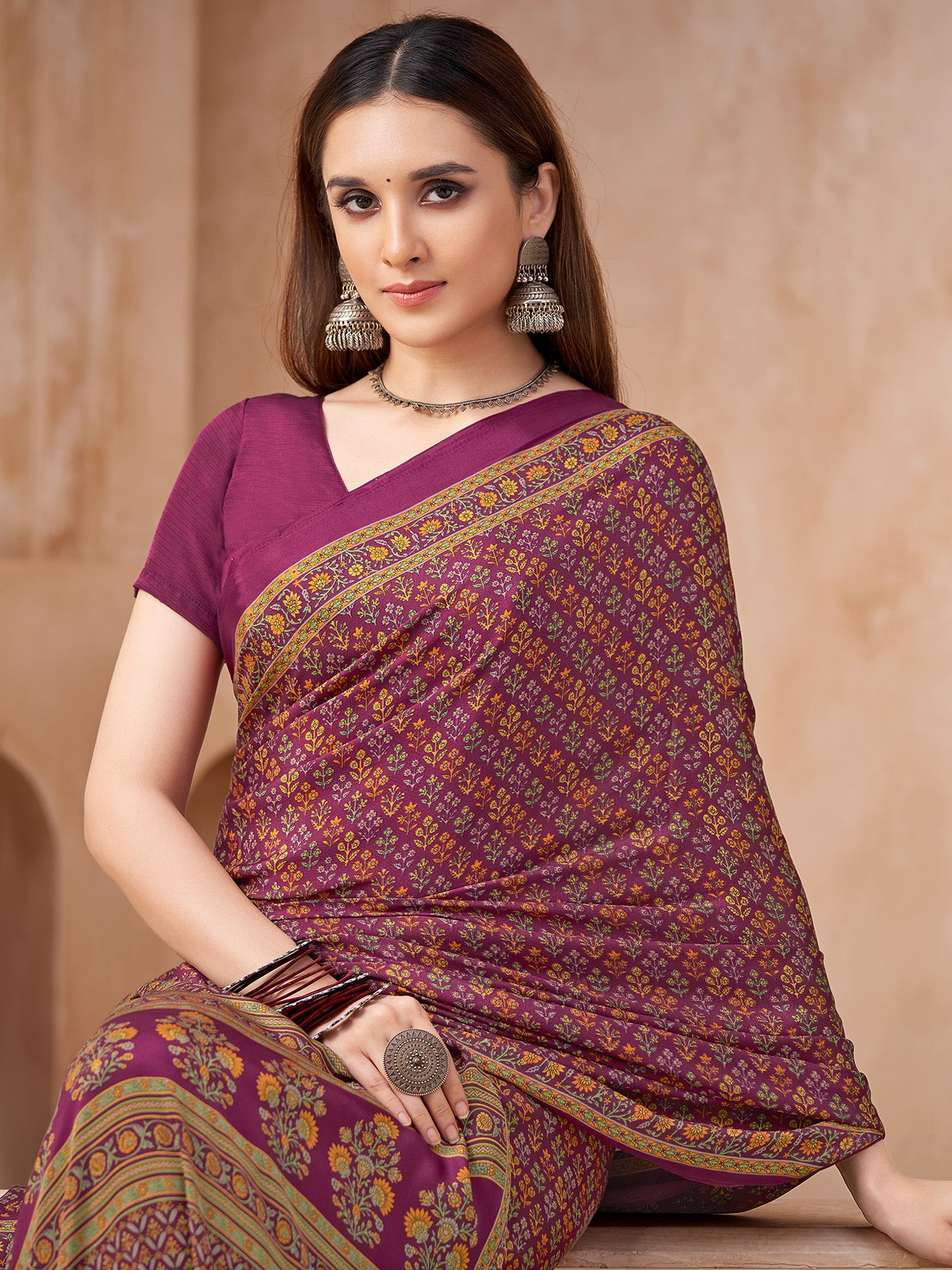 ساري نسائي من الكريب مطبوع باللون الأرجواني بتصميم أنيق مع قطعة بلوزة