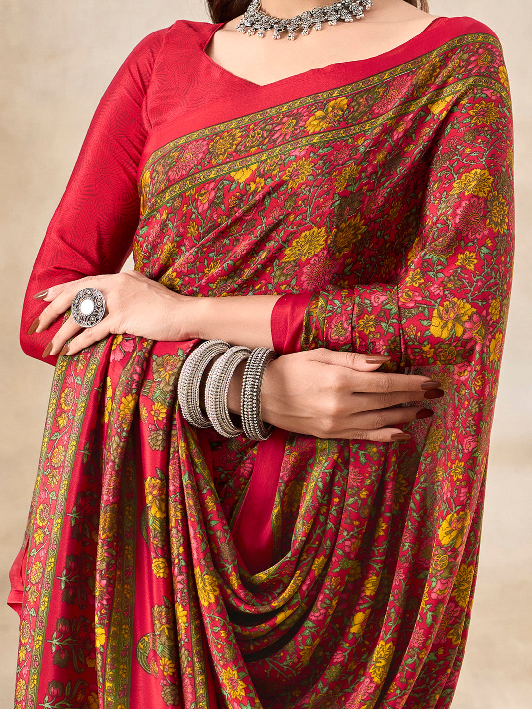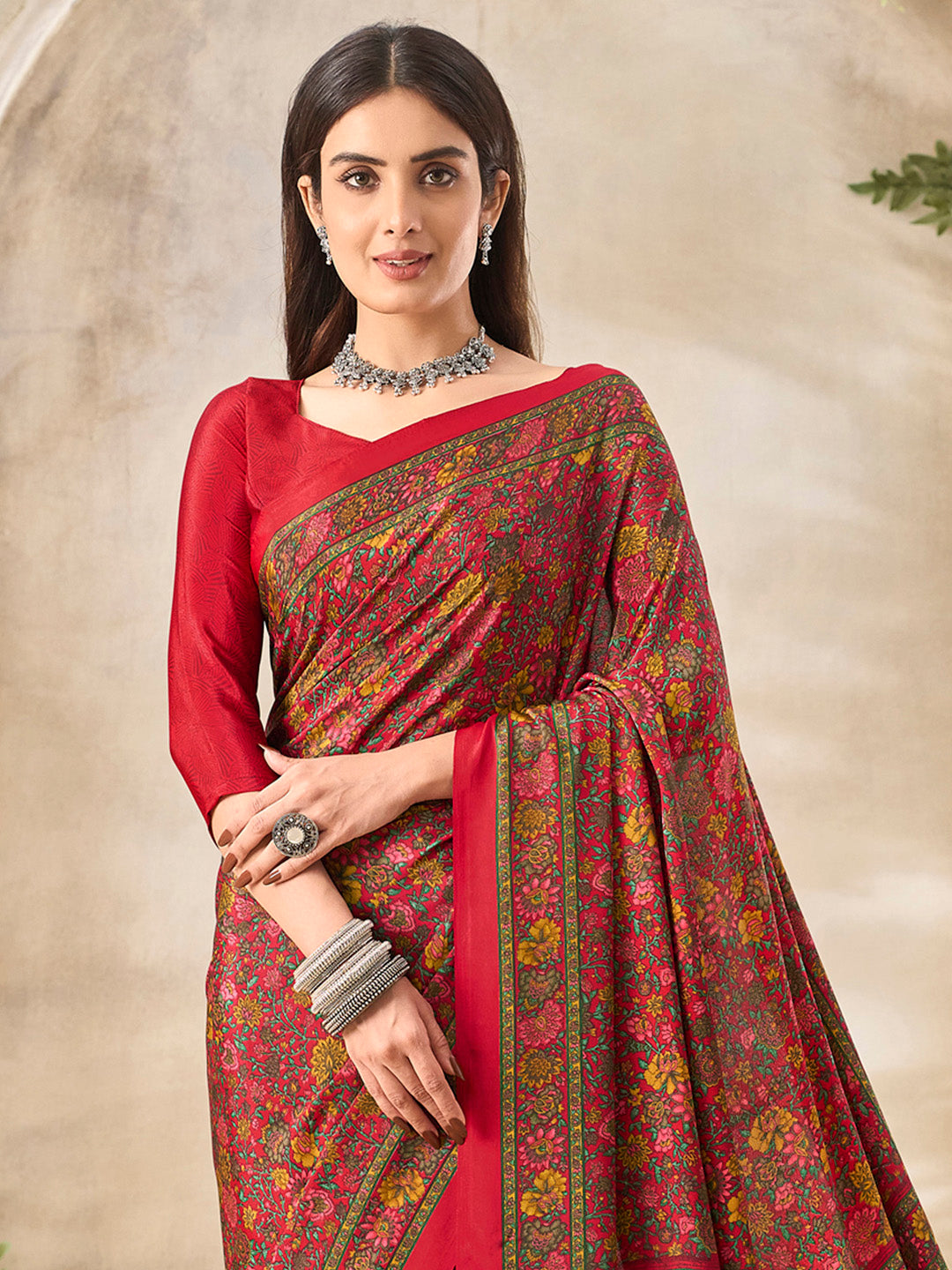 هذا الساري من ساري مول مصنوع من الكريب ولونه أحمر. تأتي ساري مول العرقية مع قطعة بلوزة يمكن تفصيلها حسب ذوقك. صُنع هذا الساري على أيدي حرفيين مهرة دون المساومة على جودته. بتصميمه الجميل وقماشه الرائع، سيحظى هذا الساري بإعجاب الجميع. مقاس الساري 5.5 متر، ومقاس البلوزة 0.8 متر، مقاس حر.