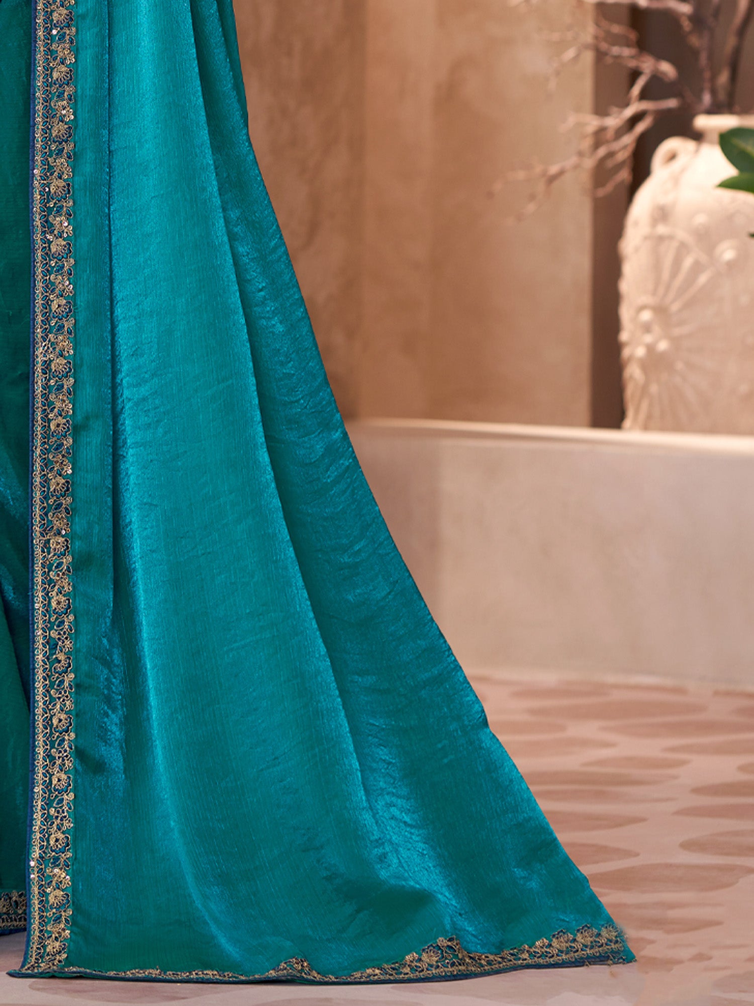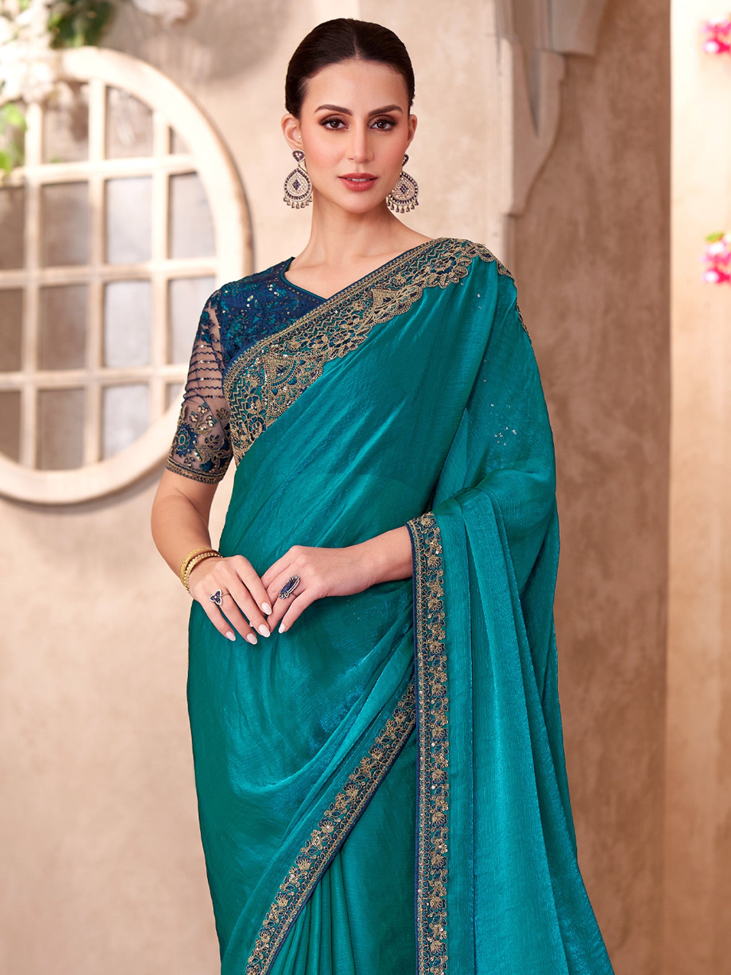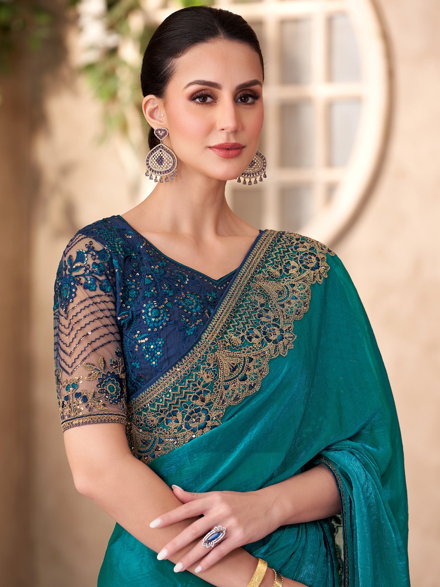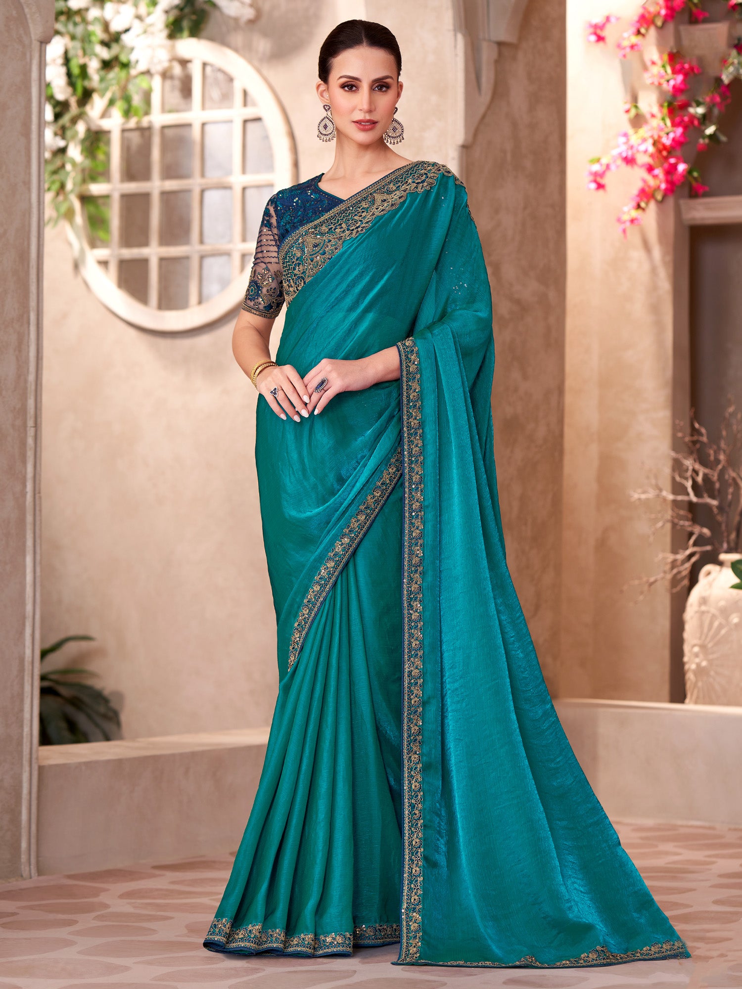 هذا الساري من ساري مول مصنوع من قماش الجورجيت ولونه أخضر فيروزي. تأتي ساري مول مع قطعة قماش للبلوزة، يمكن تفصيلها حسب ذوقك. صُنع هذا الساري على أيدي حرفيين مهرة دون المساومة على جودته. بتصميمه الجميل وقماشه الرائع، سيحظى هذا الساري بإعجاب الجميع. مقاس الساري 5.5 متر، ومقاس البلوزة 0.8 متر، مقاس حر.