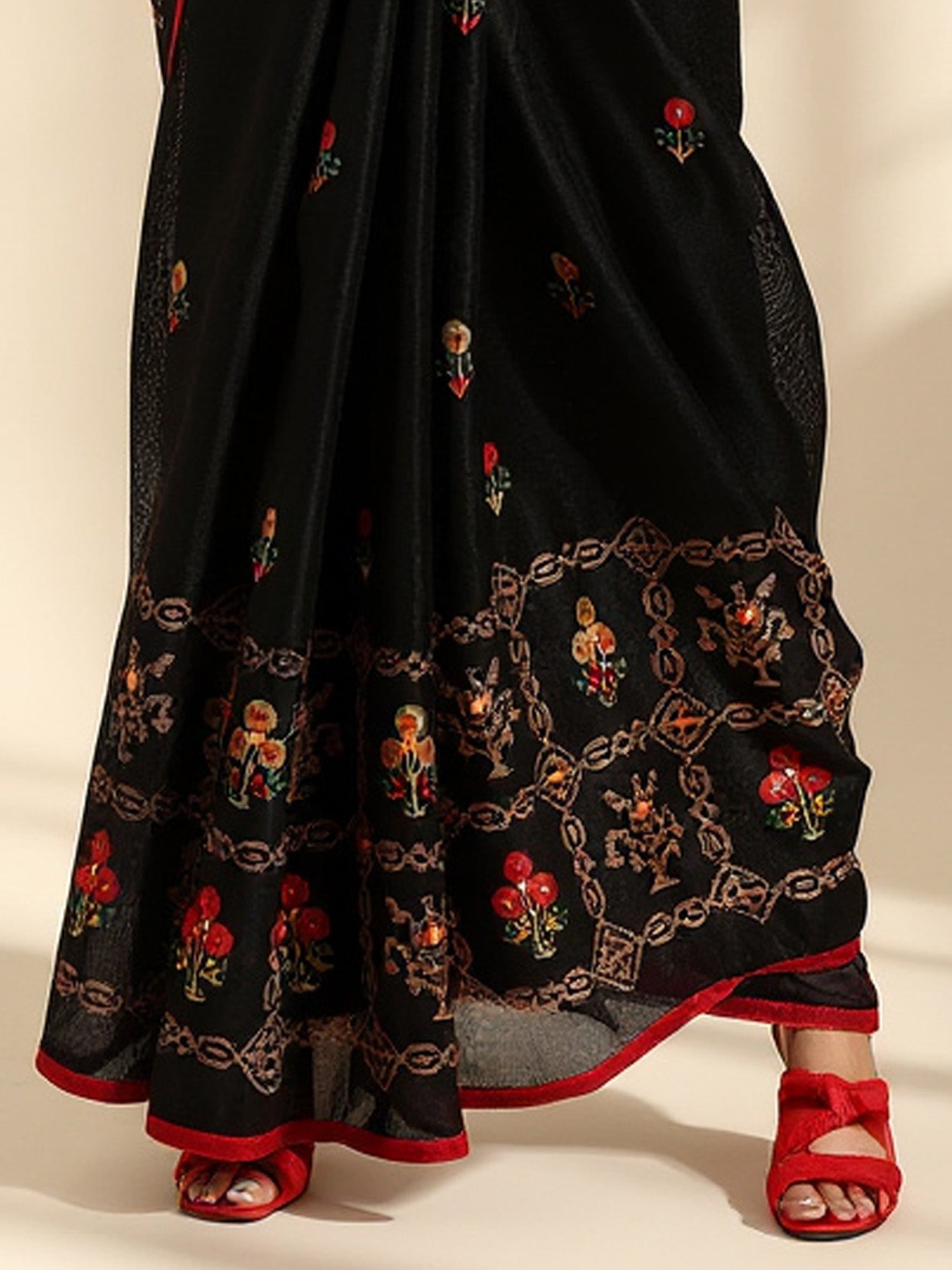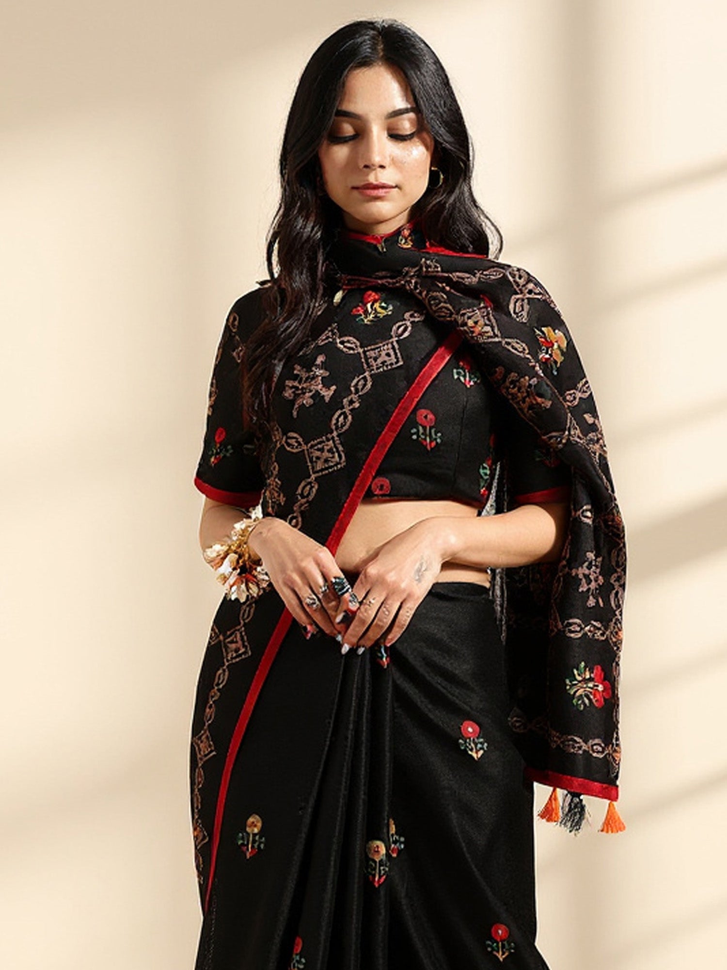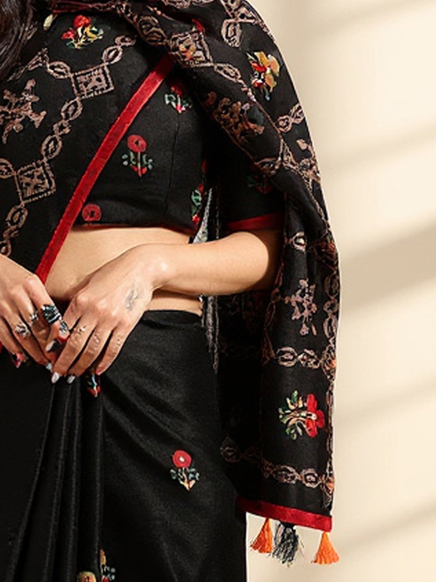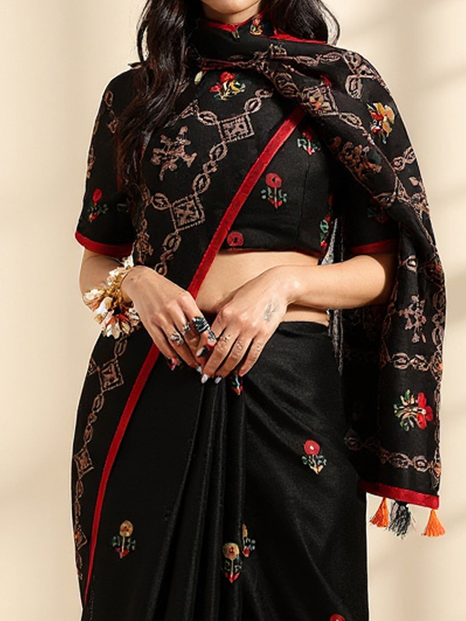هذا الساري من ساري مول مصنوع من حرير الجوت ولونه أسود. تأتي ساري مول العرقية مع قطعة بلوزة يمكن تفصيلها حسب ذوقك. صُنع هذا الساري على أيدي حرفيين مهرة دون المساومة على جودته. بتصميمه الجميل وقماشه الرائع، سيحظى هذا الساري بإعجاب الجميع. مقاس الساري 5.5 متر، ومقاس البلوزة 0.8 متر، مقاس حر.
