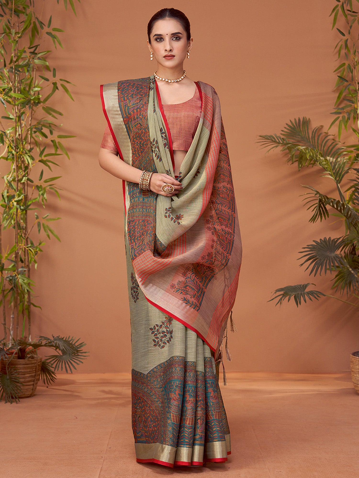هذا الساري من ساري مول مصنوع من مزيج الكتان ولونه رمادي. تأتي ساري مول العرقية مع قطعة بلوزة يمكن تفصيلها حسب ذوقك. صُنع هذا الساري على أيدي حرفيين مهرة دون المساومة على جودته. بتصميمه الجميل وقماشه الرائع، سيحظى هذا الساري بإعجاب الجميع. مقاس الساري 5.5 متر، ومقاس البلوزة 0.8 متر، مقاس حر.