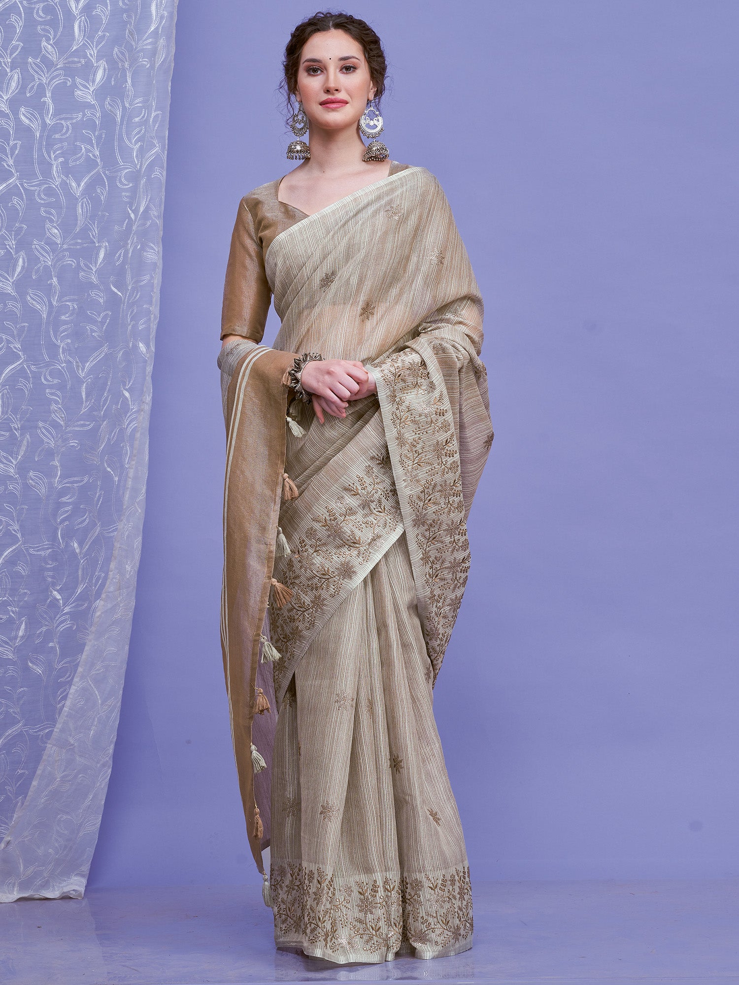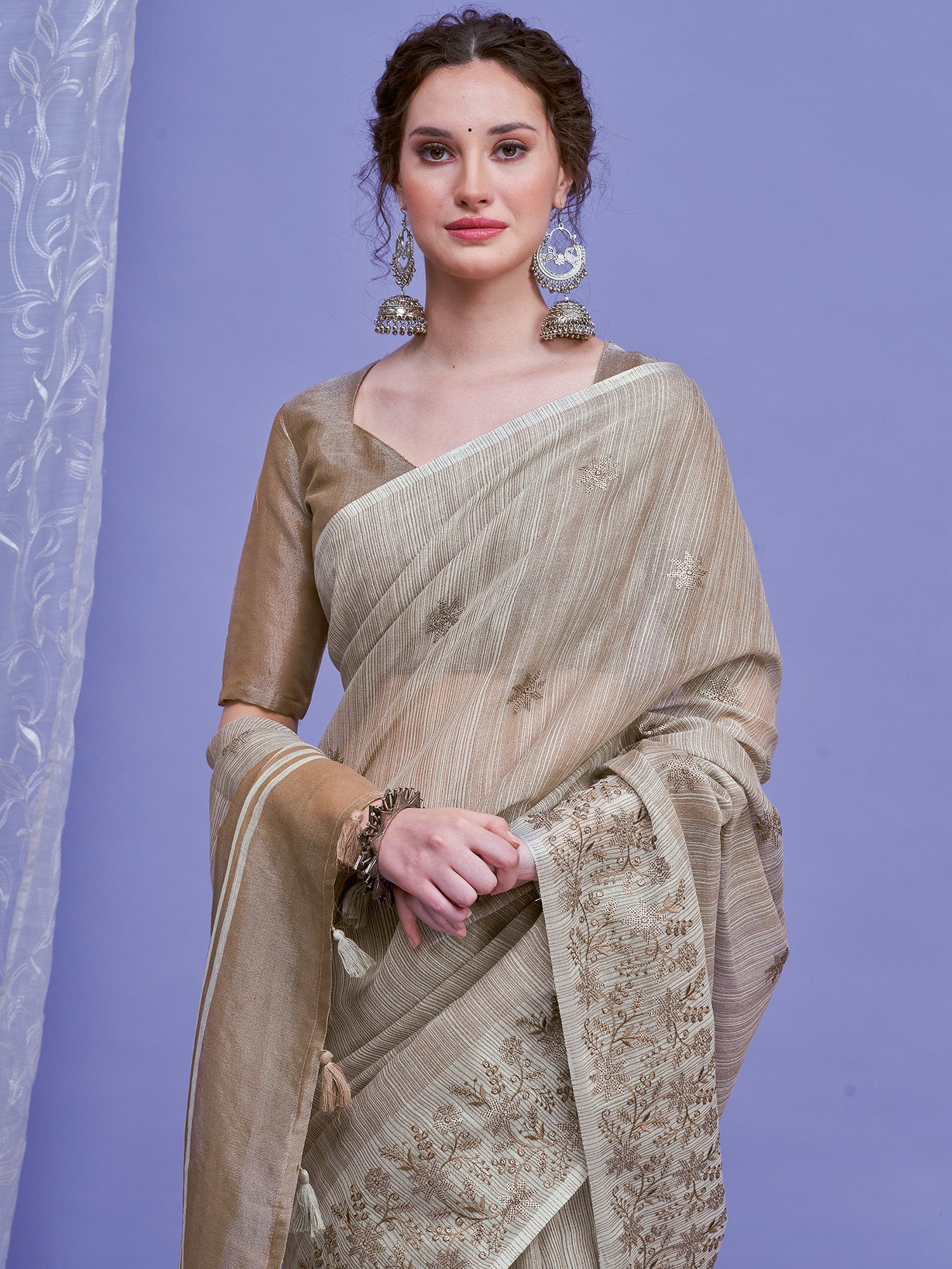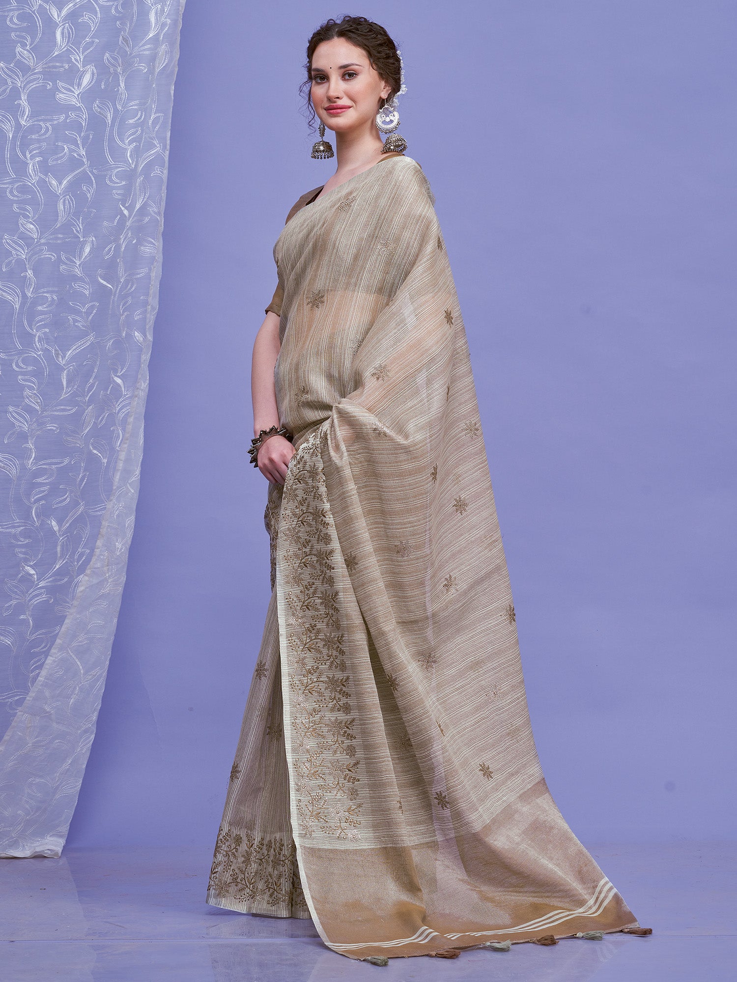 هذا الساري من ساري مول مصنوع من الكتان ولونه رمادي. تأتي ساري مول العرقية مع قطعة بلوزة يمكن تفصيلها حسب ذوقك. صُنع هذا الساري على أيدي حرفيين مهرة دون المساومة على جودته. بتصميمه الجميل وقماشه الرائع، سيحظى هذا الساري بإعجاب الجميع. مقاس الساري 5.5 متر، ومقاس البلوزة 0.8 متر، مقاس حر.