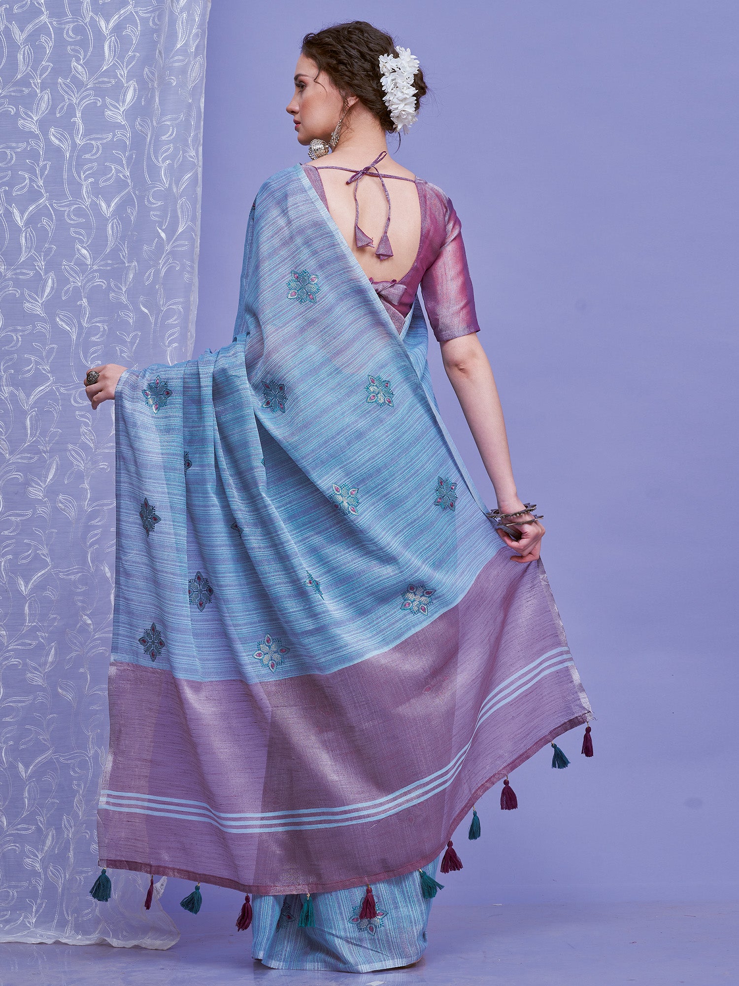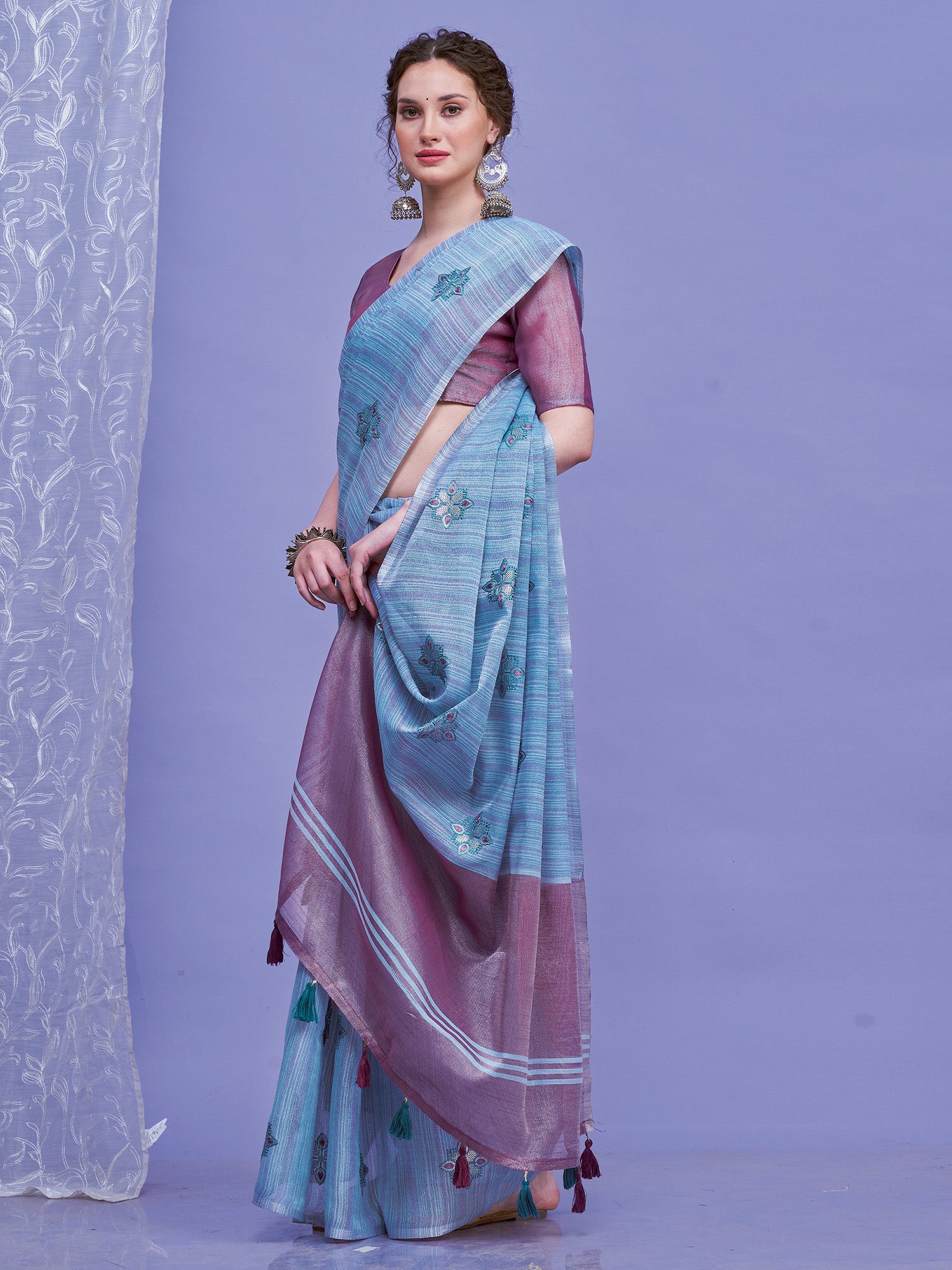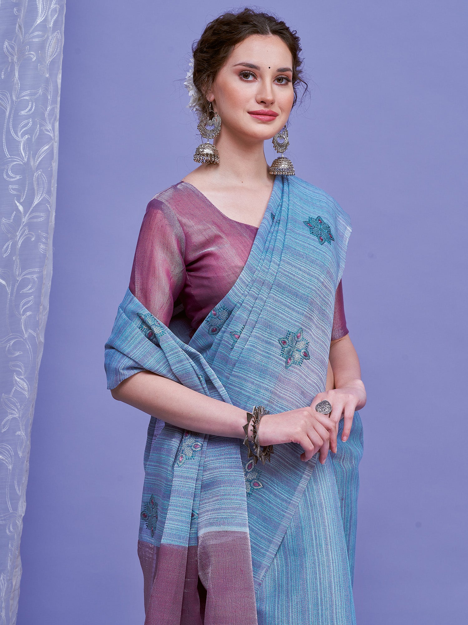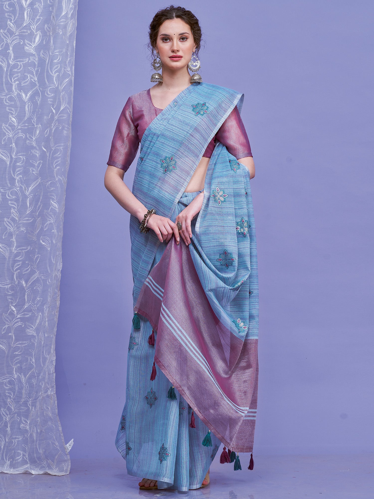 هذا الساري من ساري مول مصنوع من الكتان ولونه أزرق فاتح. تأتي ساري ساري مول مع قطعة قماش للبلوزة، يمكن تفصيلها حسب ذوقك. صُنع هذا الساري على أيدي حرفيين مهرة دون المساومة على جودته. بتصميمه الجميل وقماشه الرائع، سيحظى هذا الساري بإعجاب الجميع. مقاس الساري 5.5 متر، ومقاس البلوزة 0.8 متر، مقاس حر.