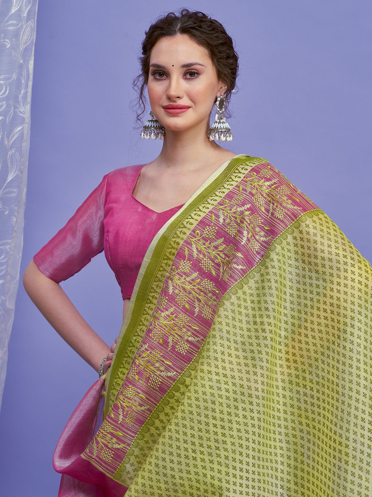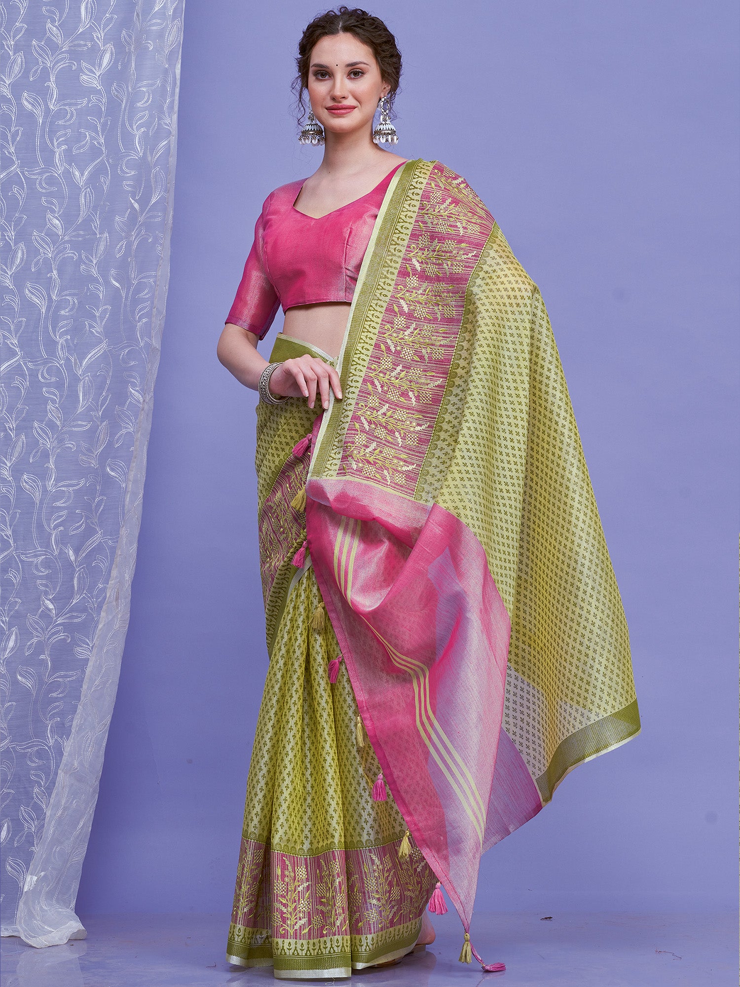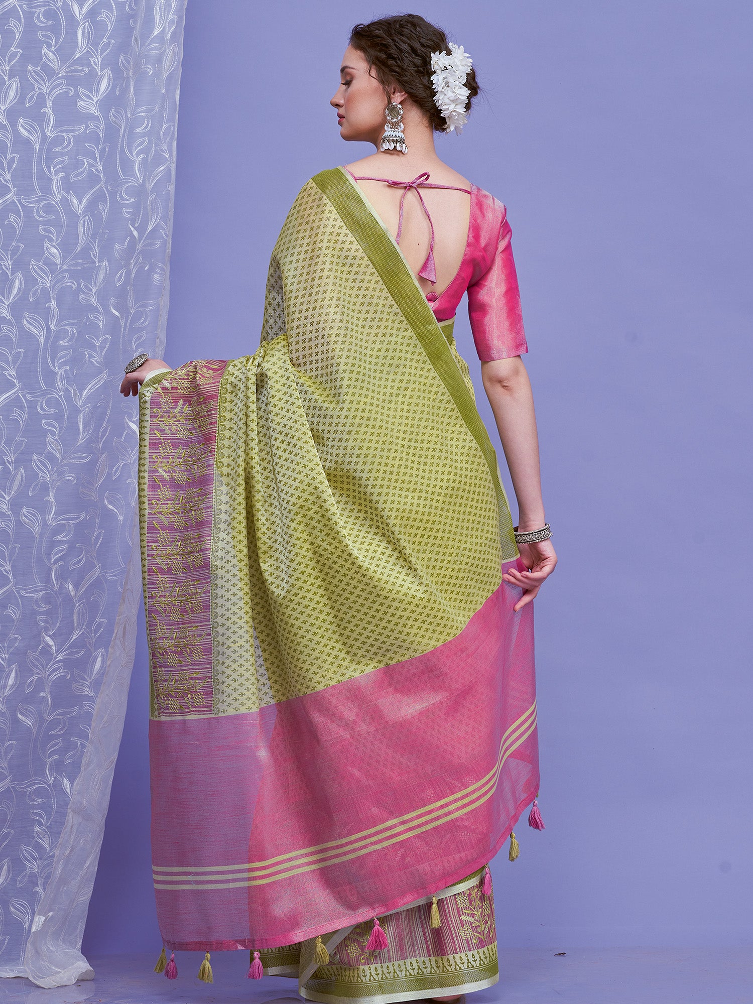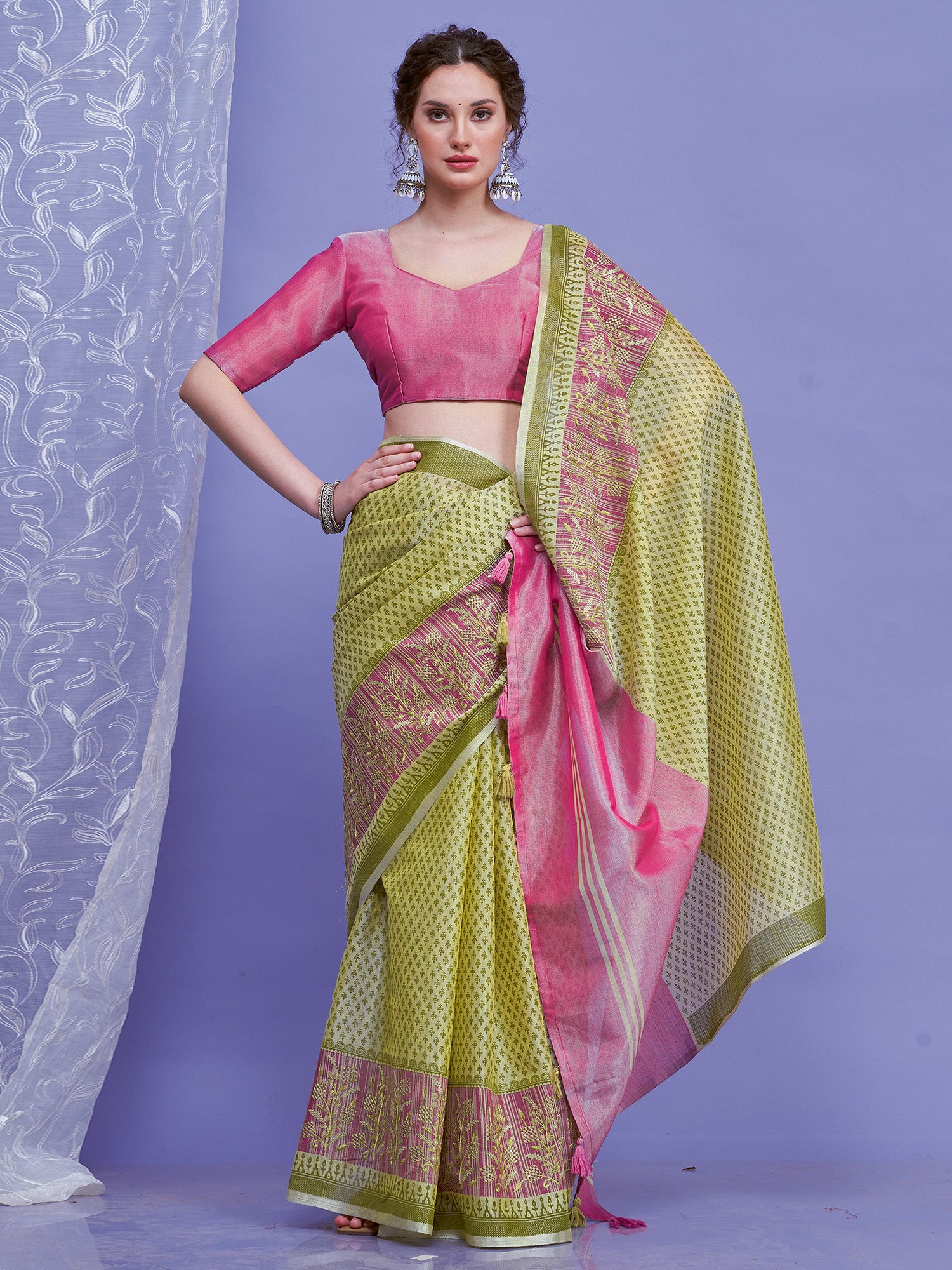 ساري نسائي من الكتان الأخضر الفاتح بتصميم منسوج مع قطعة بلوزة