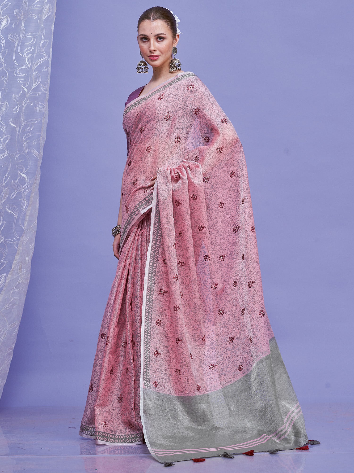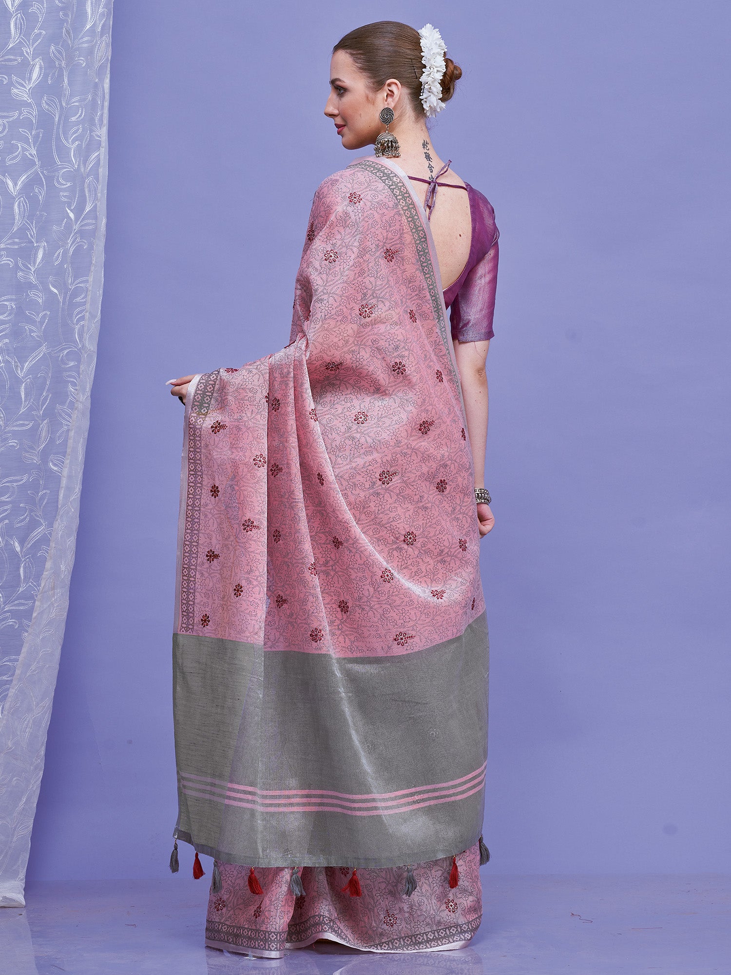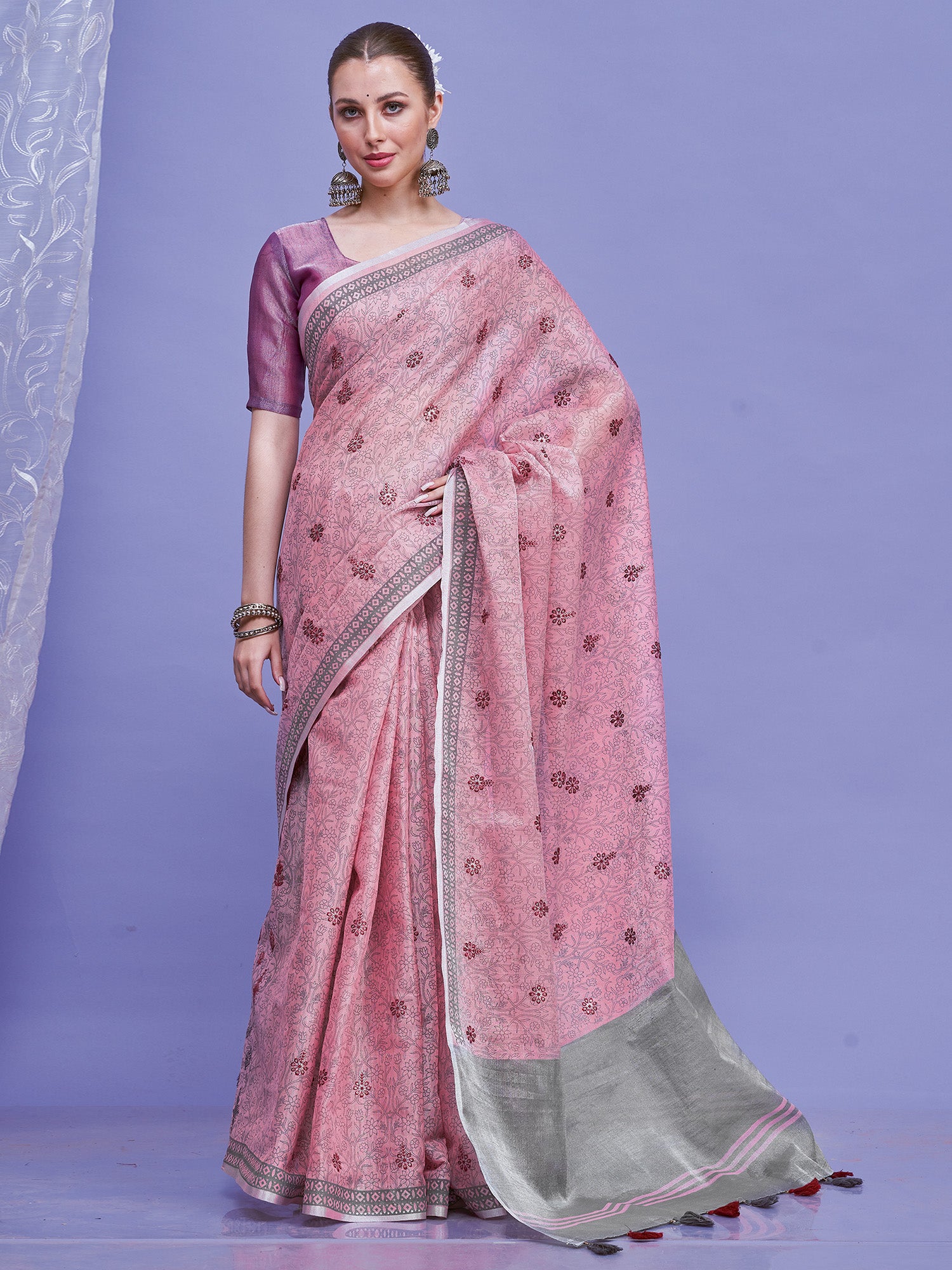 هذا الساري من ساري مول مصنوع من الكتان ولونه بنفسجي. تأتي ساري مول مع قطعة قماش للبلوزة، يمكن تفصيلها حسب ذوقك. صُنع هذا الساري على أيدي حرفيين مهرة دون المساومة على جودته. بتصميمه الجميل وقماشه الفاخر، سيحظى هذا الساري بإعجاب الجميع. مقاس الساري 5.5 متر، ومقاس البلوزة 0.8 متر، مقاس حر.
