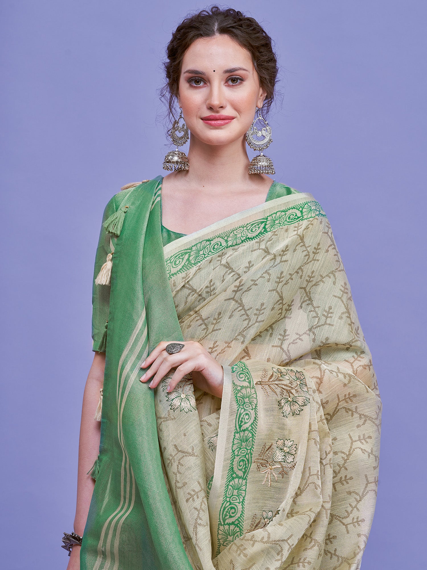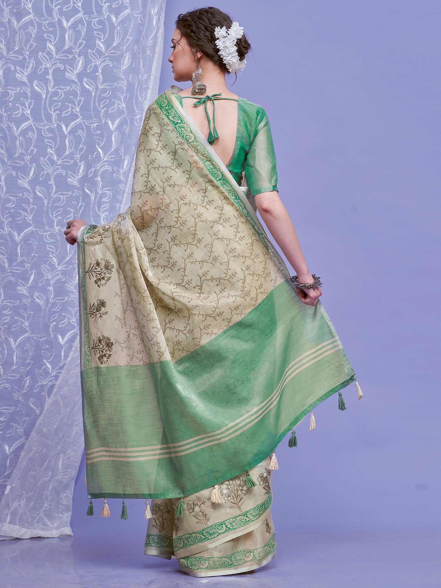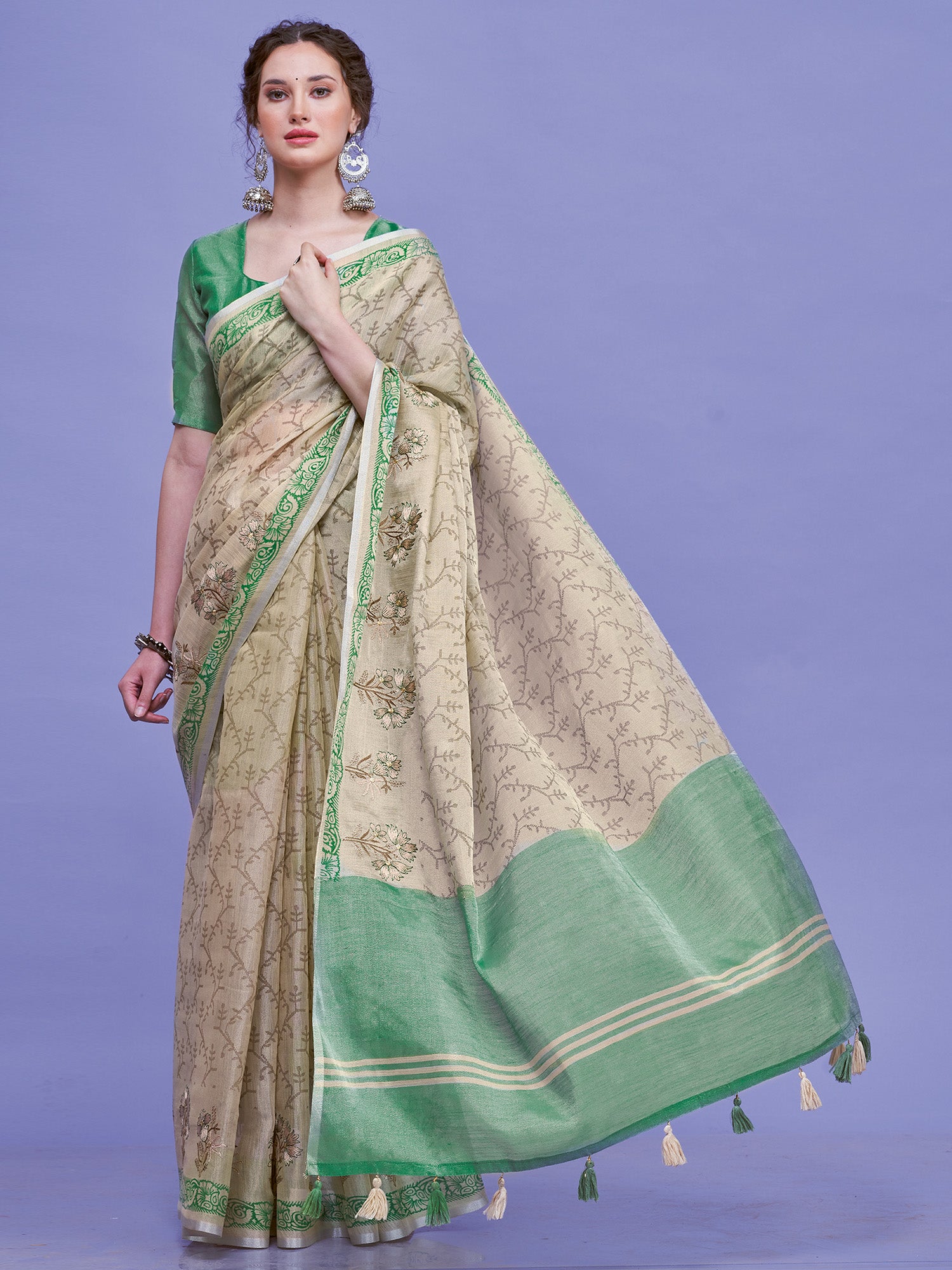 هذا الساري من ساري مول مصنوع من الكتان الأبيض. تأتي ساري مول مع قطعة قماش للبلوزة، يمكن تفصيلها حسب ذوقك. صُنع هذا الساري على أيدي حرفيين مهرة دون المساومة على الجودة. بتصميمه الجميل وقماشه الفاخر، سيحظى هذا الساري بإعجاب الجميع. مقاس الساري 5.5 متر، ومقاس البلوزة 0.8 متر، مقاس حر.