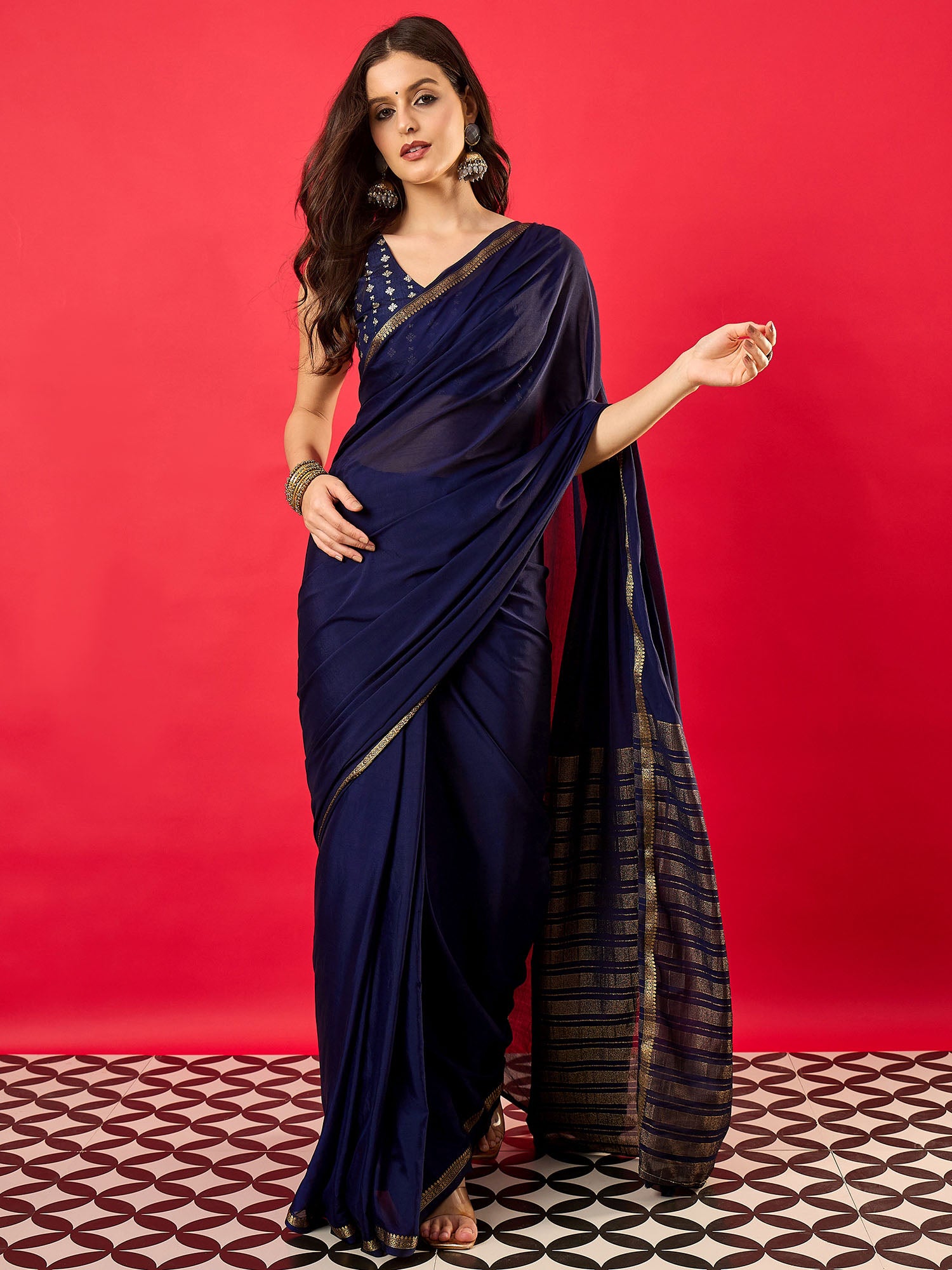 هذا الساري من ساري مول مصنوع من حرير ميسور، ولونه أزرق داكن. تأتي ساري مول مع قطعة قماش للبلوزة، يمكن تفصيلها حسب ذوقك. صُنع هذا الساري على أيدي حرفيين مهرة دون المساومة على جودته. بتصميمه الجميل وقماشه الفاخر، سيحظى هذا الساري بإعجاب الجميع. مقاس الساري 5.5 متر، ومقاس البلوزة 0.8 متر، وهو مقاس حر.