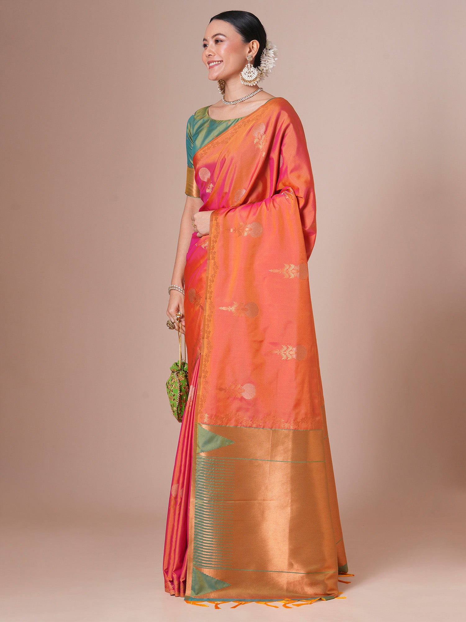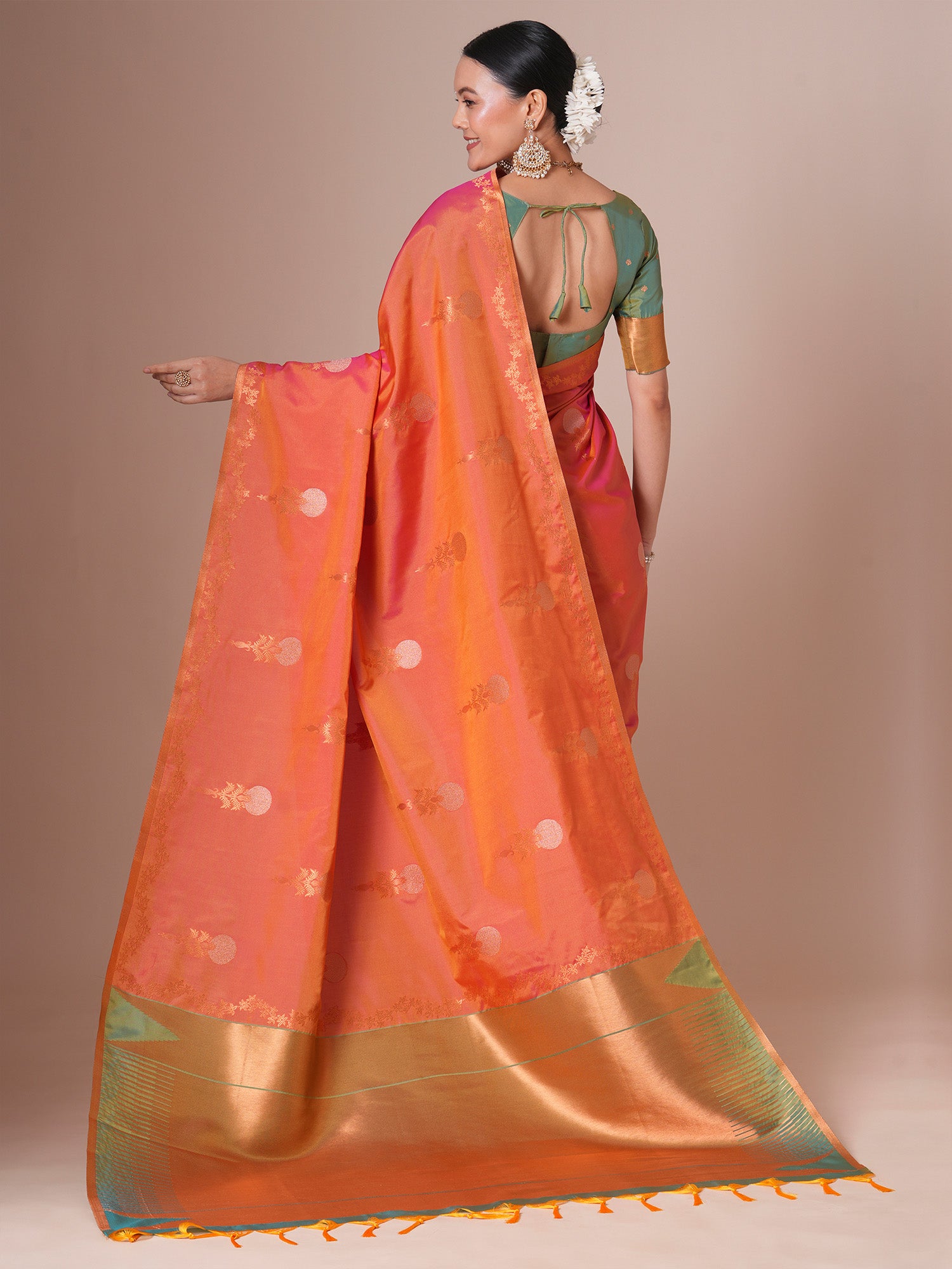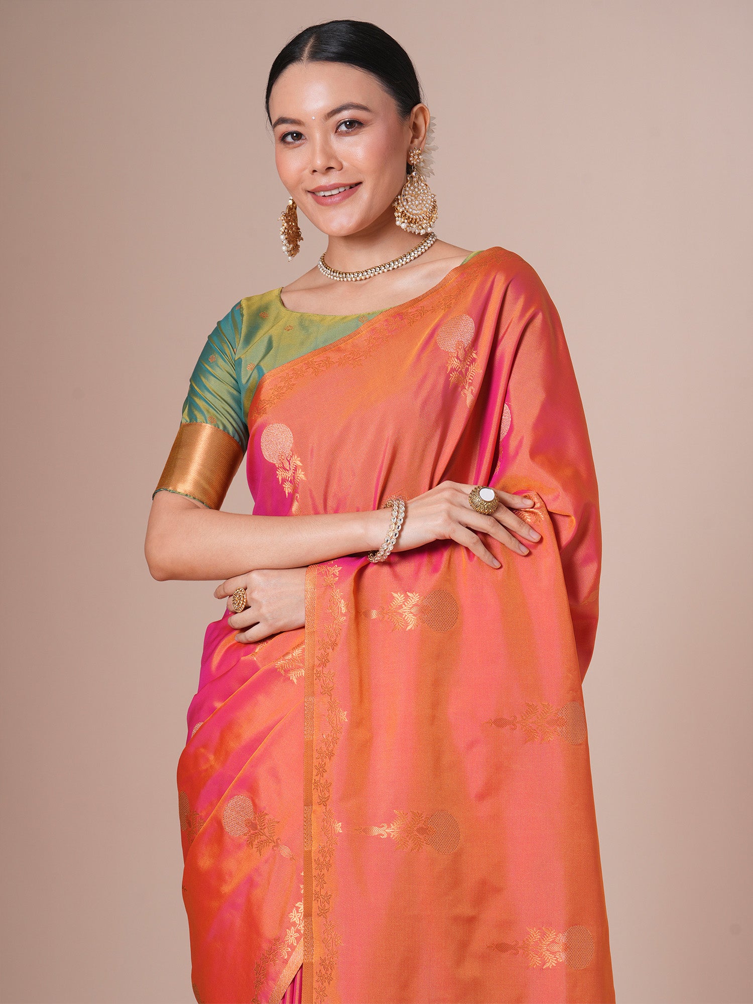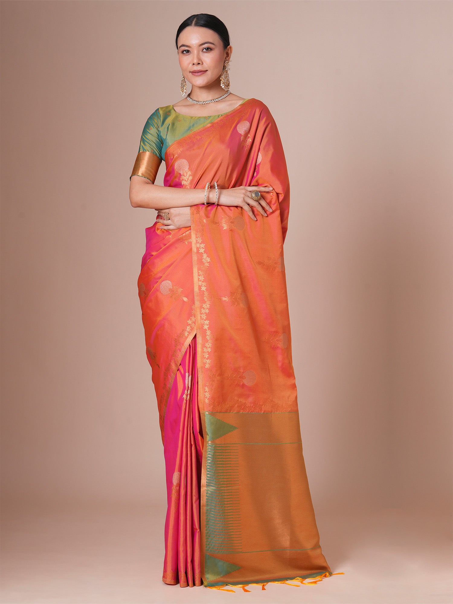 هذا الساري من ساري مول مصنوع من الحرير الخالص ولونه برتقالي. تأتي ساري ساري مول مع قطعة بلوزة يمكن تفصيلها حسب ذوقك. صُنع هذا الساري على أيدي حرفيين مهرة دون المساومة على جودته. بتصميمه الجميل وقماشه الرائع، سيحظى هذا الساري بإعجاب الجميع. مقاس الساري 5.5 متر، ومقاس البلوزة 0.8 متر، مقاس حر | ساري منسوج يدويًا بلونين.