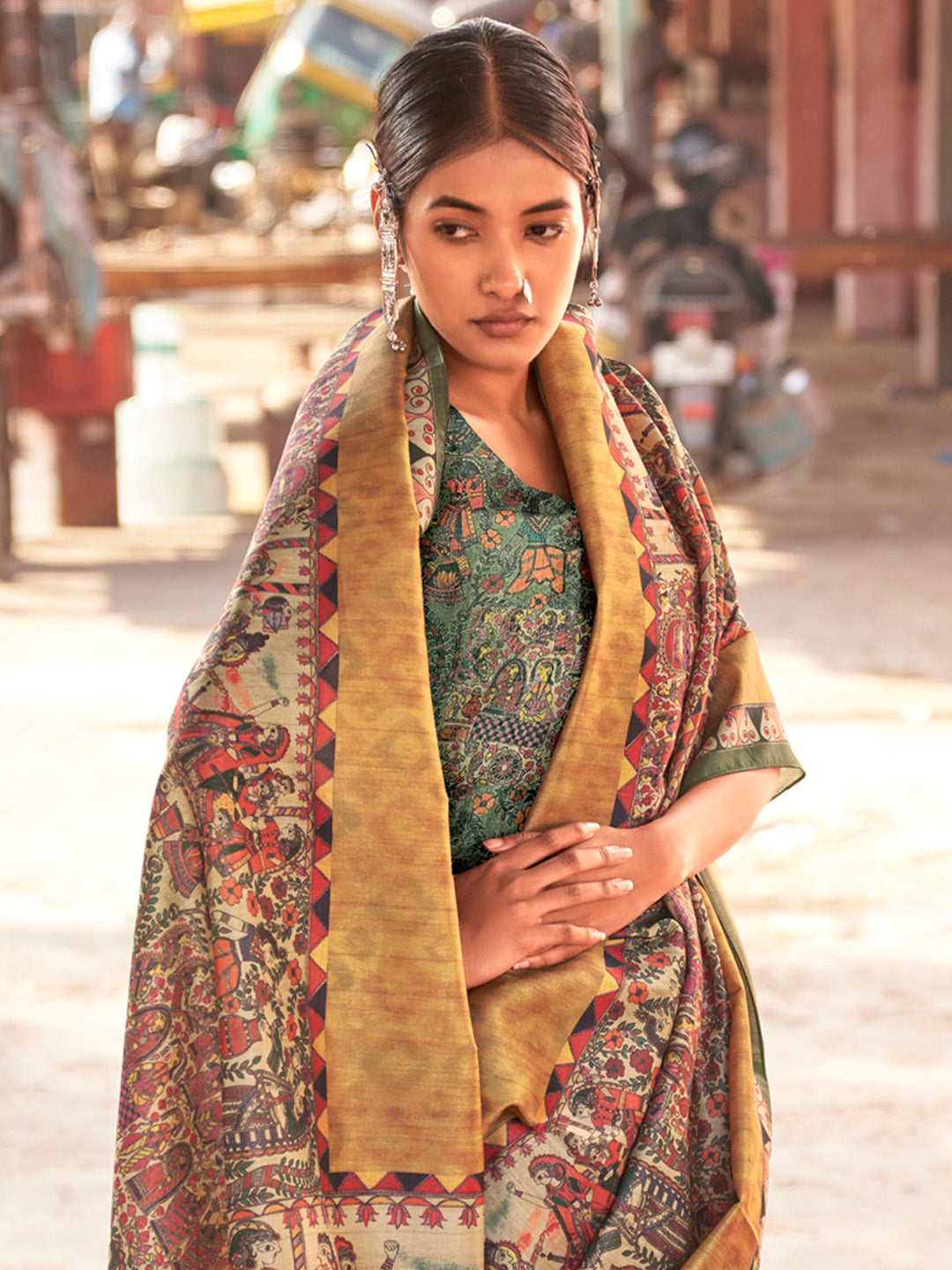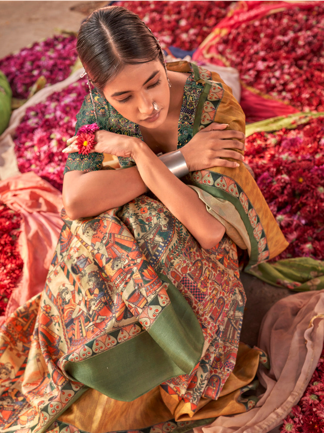 هذا الساري من ساري مول مصنوع من مزيج الحرير ولونه بيج. تأتي ساري مول العرقية مع قطعة بلوزة يمكن تفصيلها حسب ذوقك. صُنع هذا الساري على أيدي حرفيين مهرة دون المساومة على جودته. بتصميمه الجميل وقماشه الرائع، سيحظى هذا الساري بإعجاب الجميع. مقاس الساري 5.5 متر، ومقاس البلوزة 0.8 متر، مقاس حر.