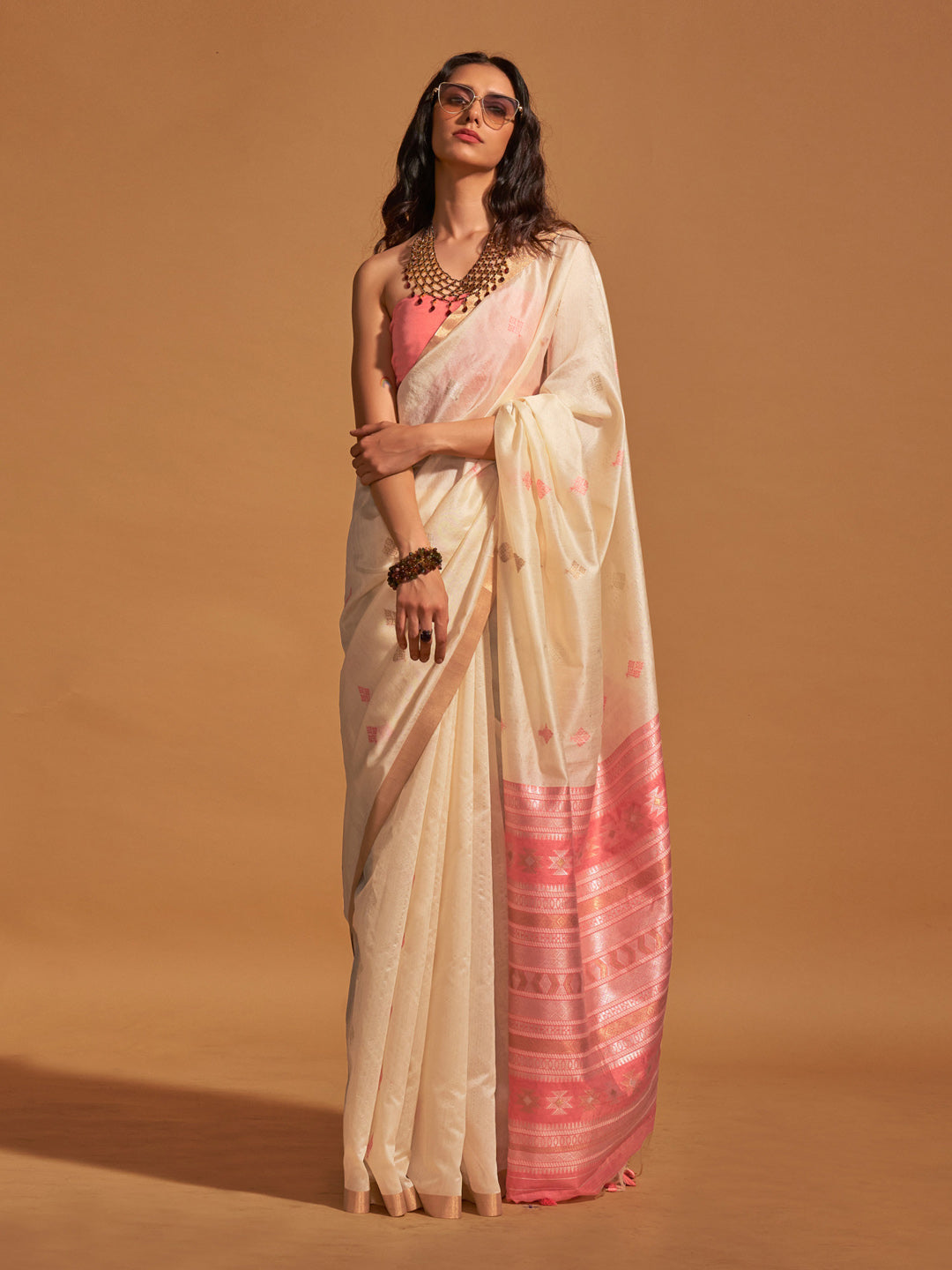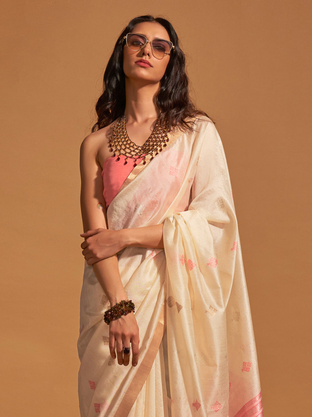 هذا الساري من ساري مول مصنوع من مزيج الحرير ولونه أبيض كريمي. تأتي ساري مول مع قطعة قماش للبلوزة، يمكن تفصيلها حسب ذوقك. صُنع هذا الساري على أيدي حرفيين مهرة دون المساومة على جودته. بتصميمه الجميل وقماشه الفاخر، سيحظى هذا الساري بإعجاب الجميع. مقاس الساري 5.5 متر، ومقاس البلوزة 0.8 متر، مقاس حر.