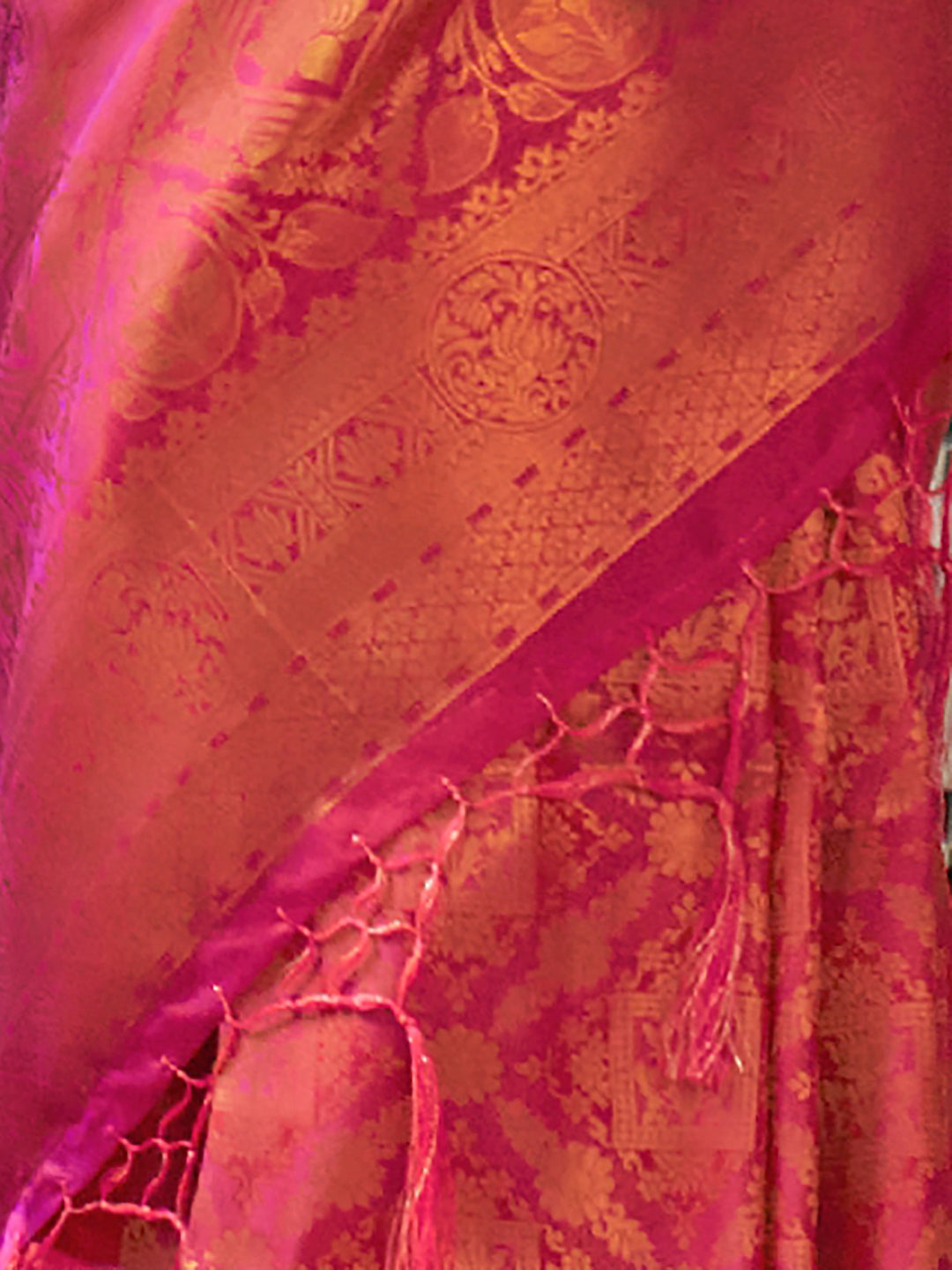 هذا الساري من ساري مول مصنوع من مزيج الحرير ولونه وردي. تأتي ساري ساري مول العرقية مع قطعة بلوزة يمكن تفصيلها حسب ذوقك. صُنع هذا الساري على أيدي حرفيين مهرة دون المساومة على جودته. بتصميمه الجميل وقماشه الرائع، سيحظى هذا الساري بإعجاب الجميع. مقاس الساري 5.5 متر، ومقاس البلوزة 0.8 متر، مقاس حر | ساري حرير منسوج يدويًا بلونين.