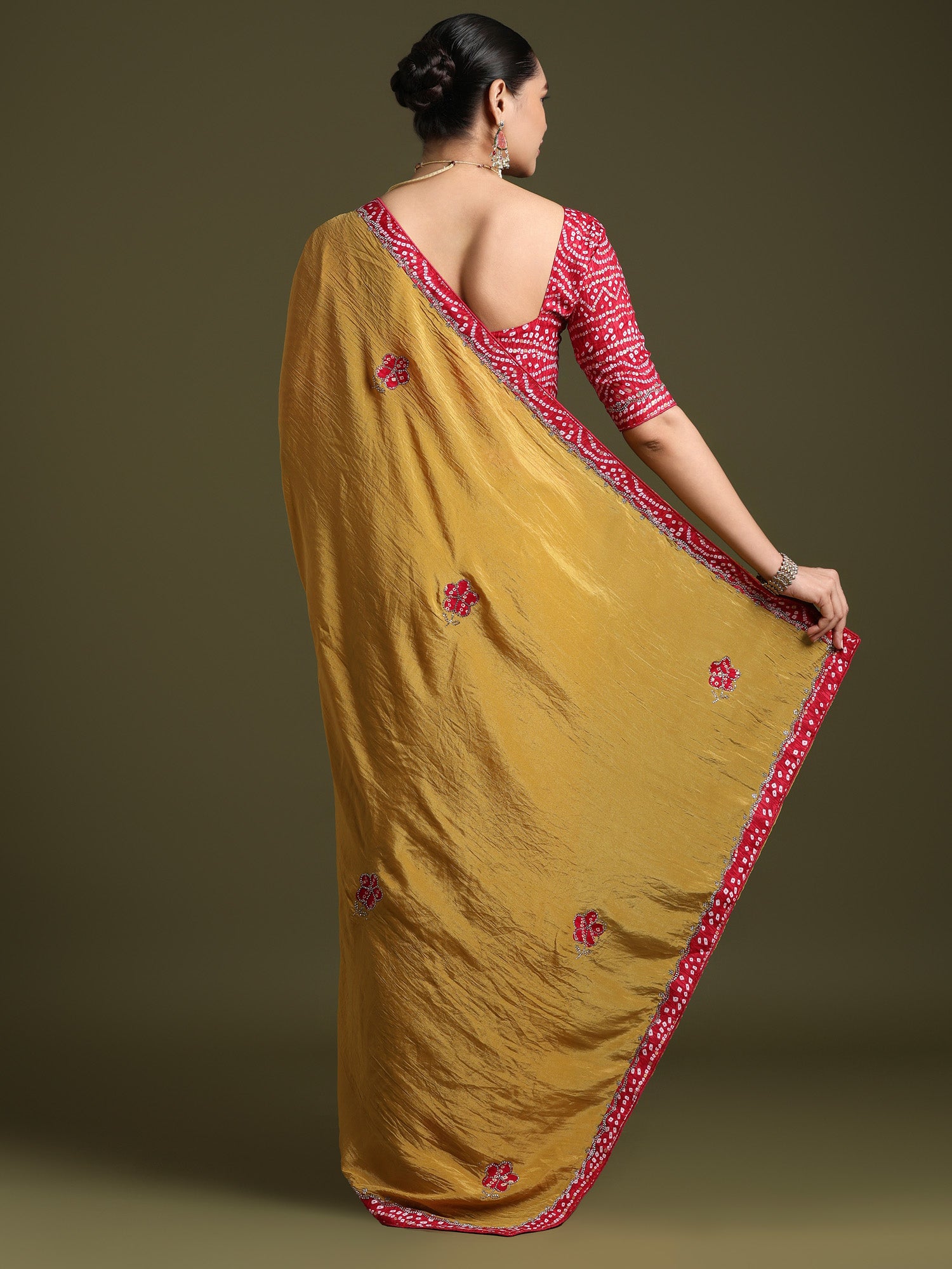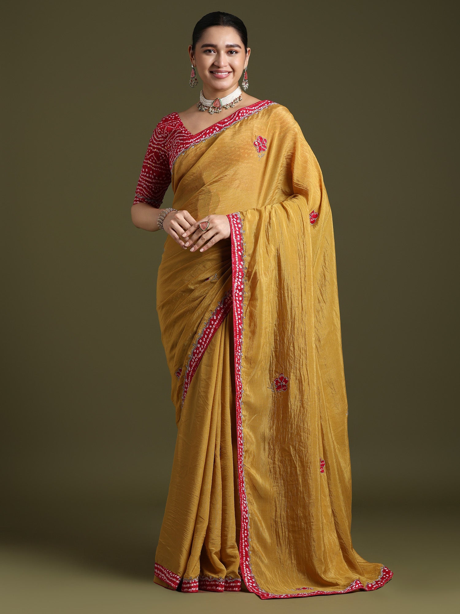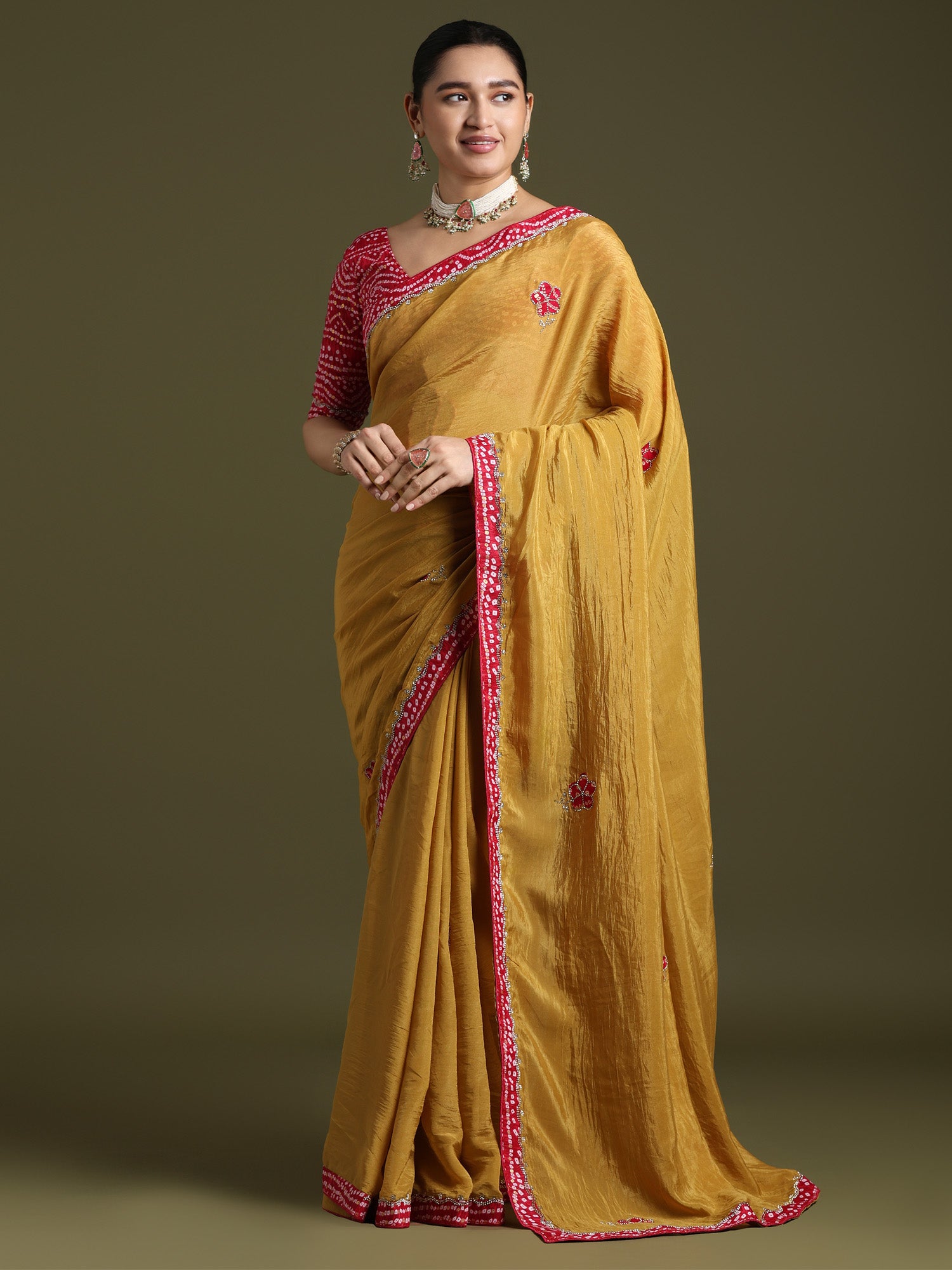 ساري نسائي من قماش التشو بلون الخردل مزين بتطريزات، مع قطعة بلوزة
