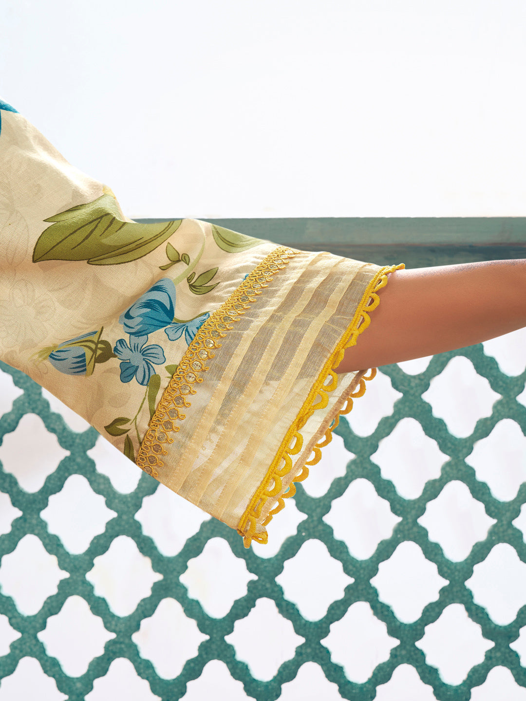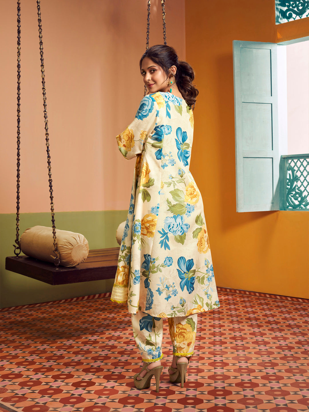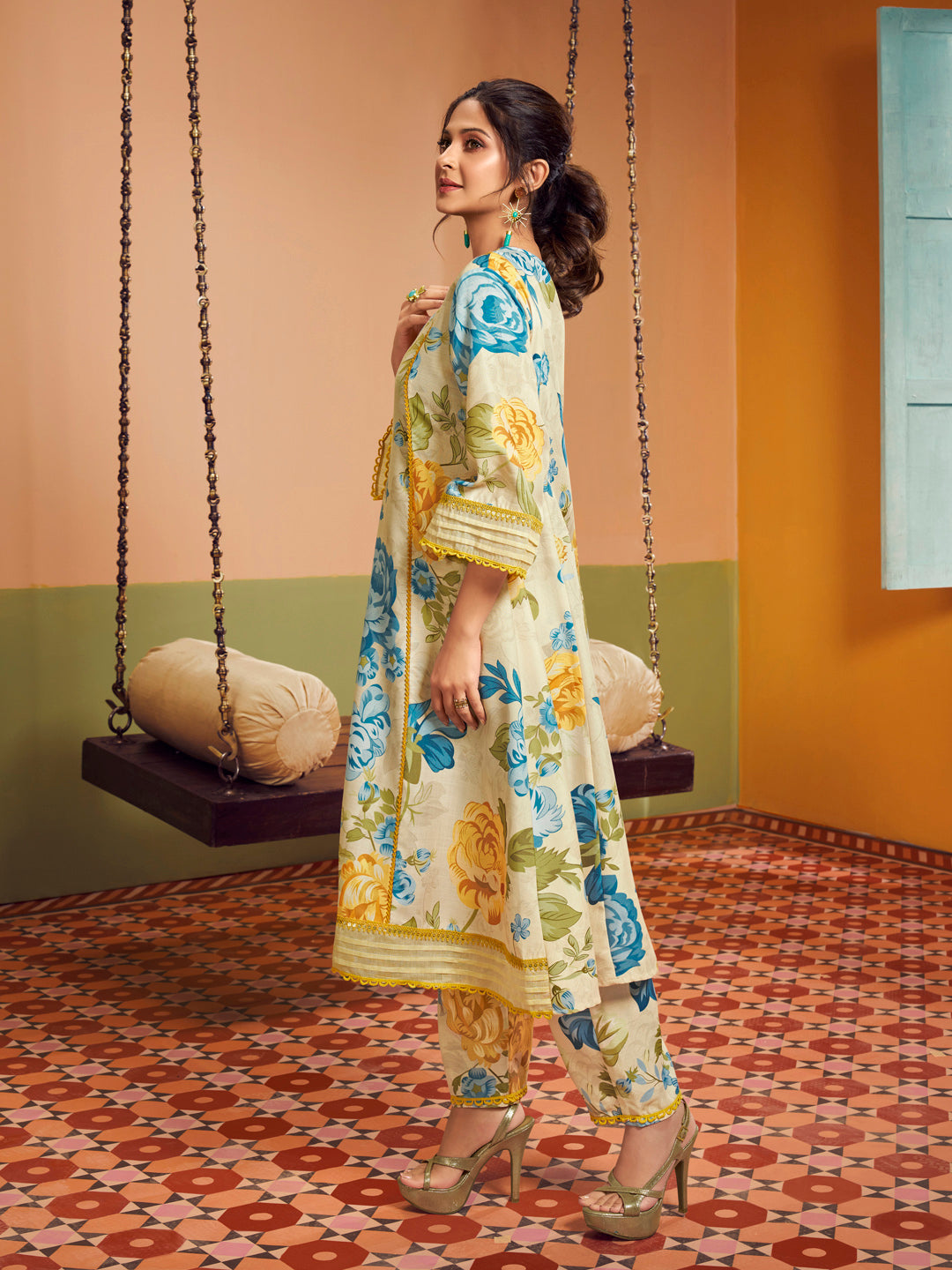 Beige, Yellow, and Blue Multi-Floral Printed Flared Kurta Set. Kurta: Shape: Flared. Neckline: V-neck with lace detailing. Sleeves: Quarter-length flared sleeves with lace detailing. Length: Calf-length with lace at the hem. Bottom: Style: Pants. Waistband: Elasticated.