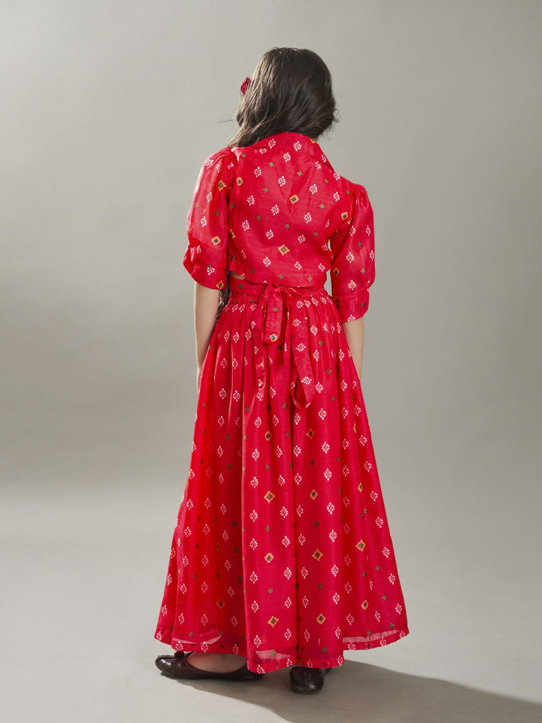 Red Printed crop top has a V-neck, sleeve with Elasticated waistband Palazzos