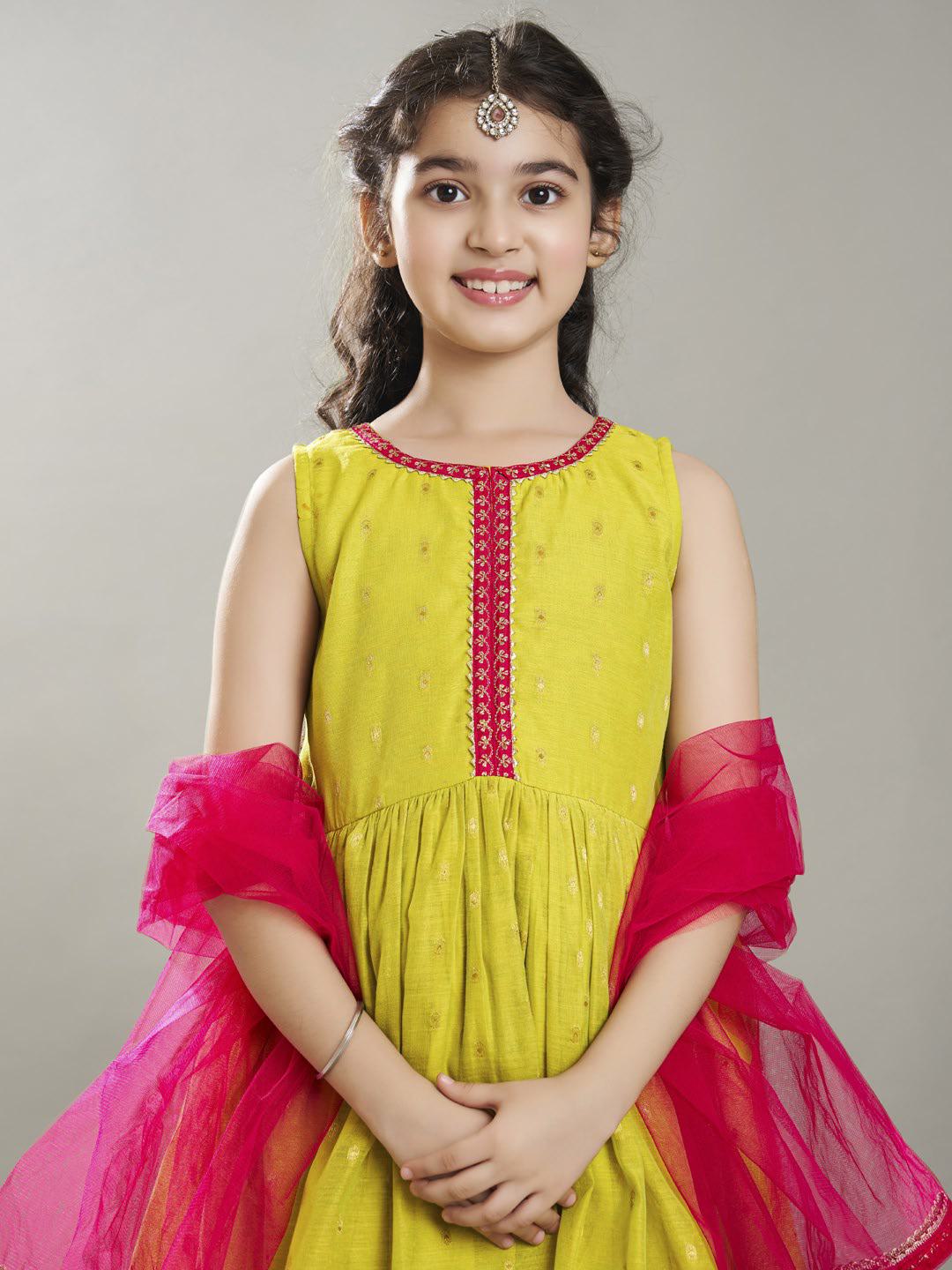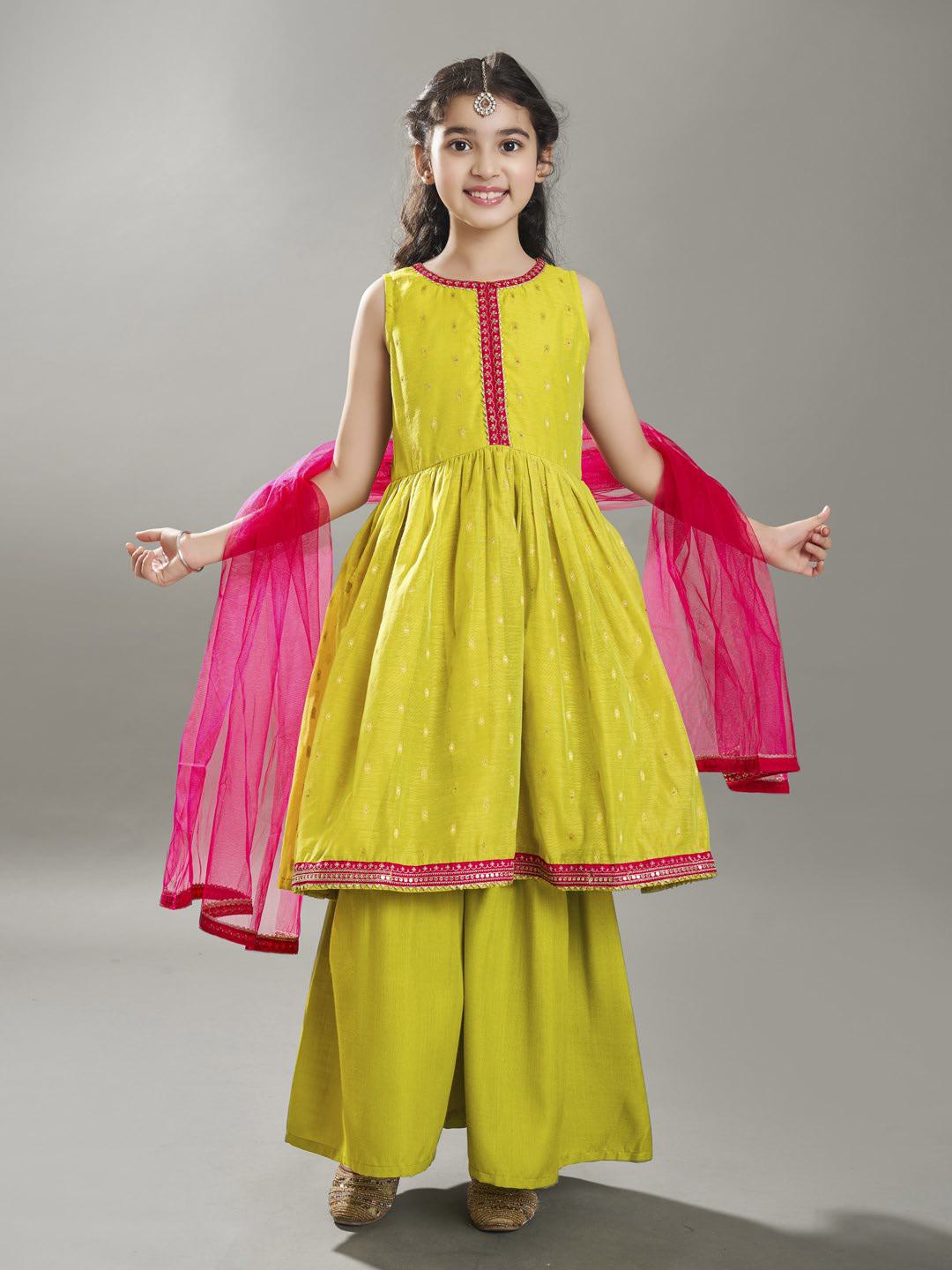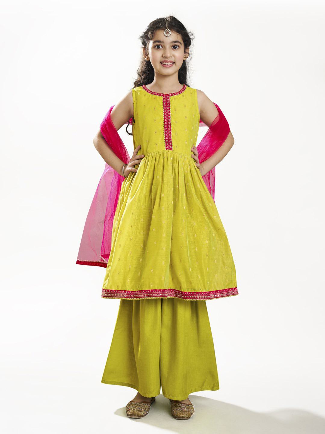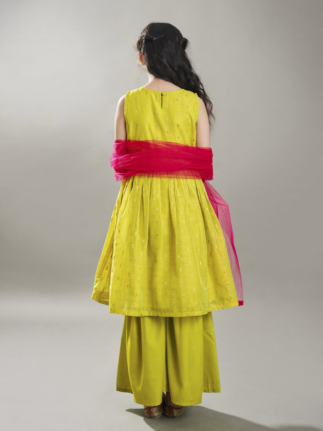 Green Ethnic motifs woven design Anarkali shape Kurta has a V-Neck, sleeveless, Above knee length,with flared hem, with Elasticated waistband Sharara with dupatta