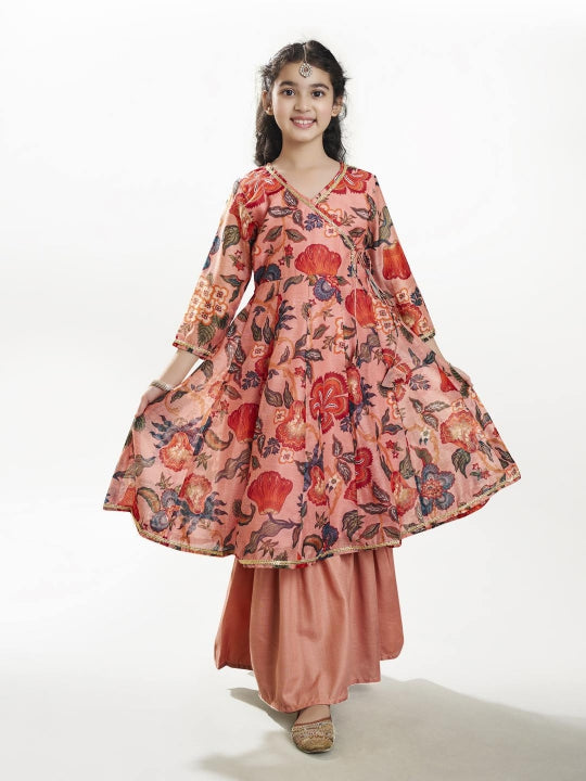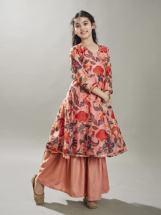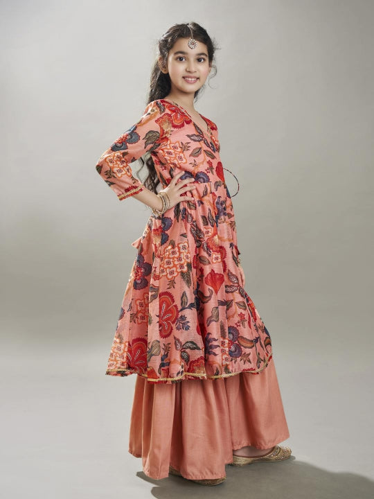 Girls Peach Floral Printed Kurta With Sharara